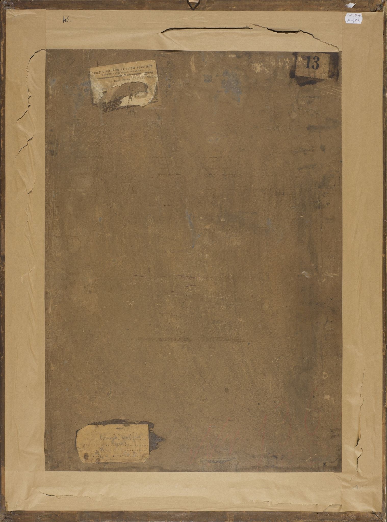 olej, tektura, 68 x 47 cm, sygn. l.d.: Henryk Dietrich 1929, na odwrocie nalepki wystawowe: częściowo zachowana ZPAP w Krakowie, Pl. Św. Ducha 5 "Dom Artysty" z datą 27 II 192[?], "13", wypełniona ołówkiem: Henryk Dietrich, Pejzaż, ol.