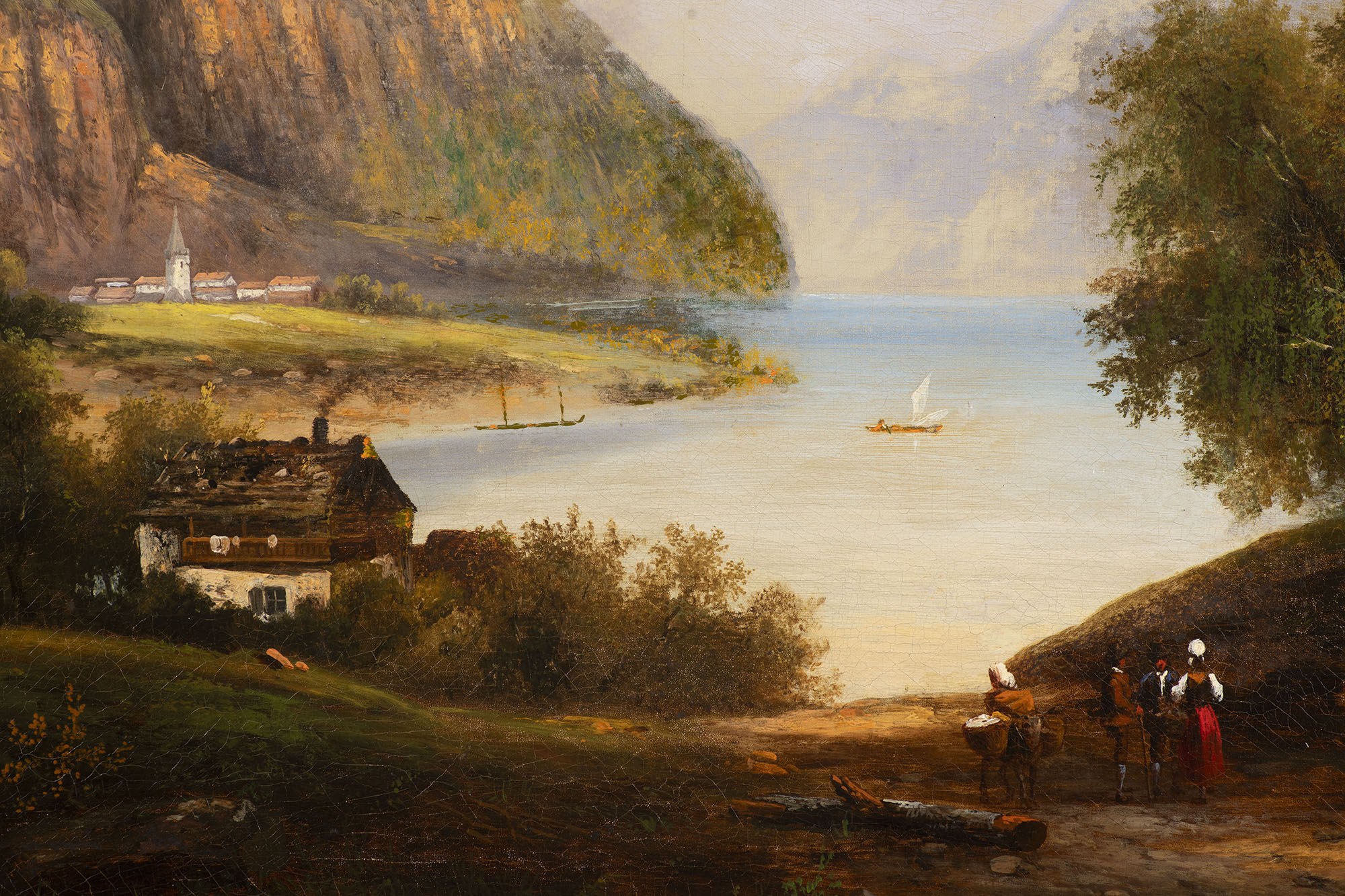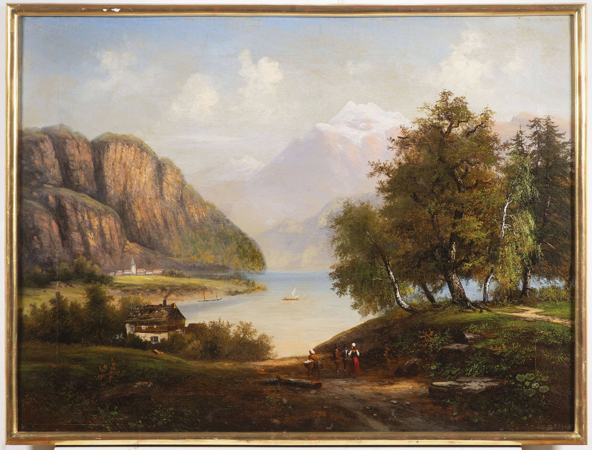 Painter 19th century . Mountain landscape with lake Oil on Canvas 71 x 94 cm