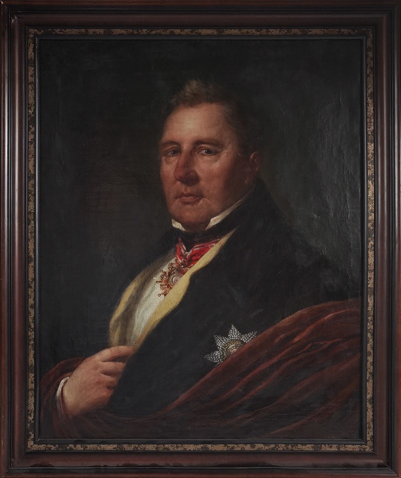 Reprezentacyjny / oficjalny portret nieznanego z nazwiska mężczyzny odznaczonego Orderem Św. Stanisława II Klasy (typ Orderu z rozwiniętymi skrzydłami po 1830 r.) z brylantowaną gwiazdą.