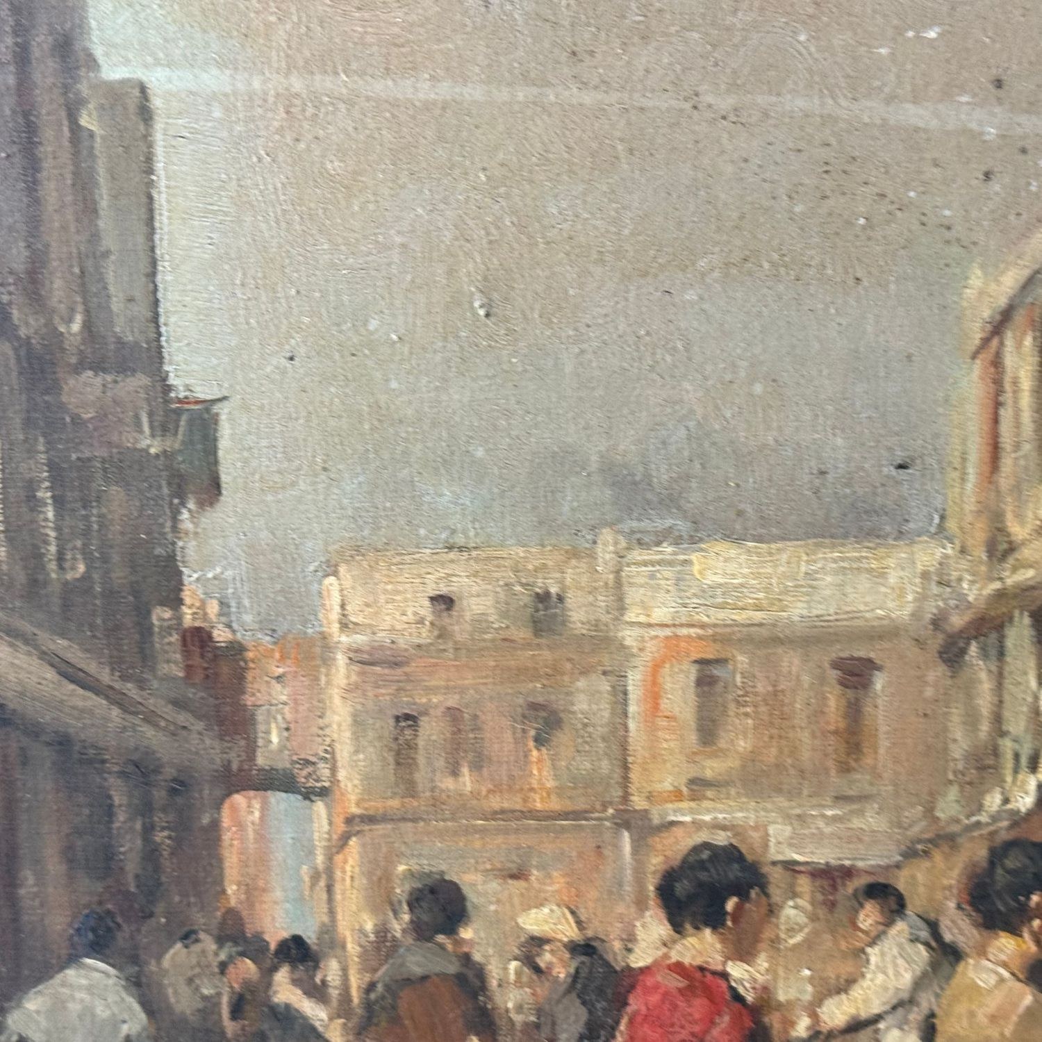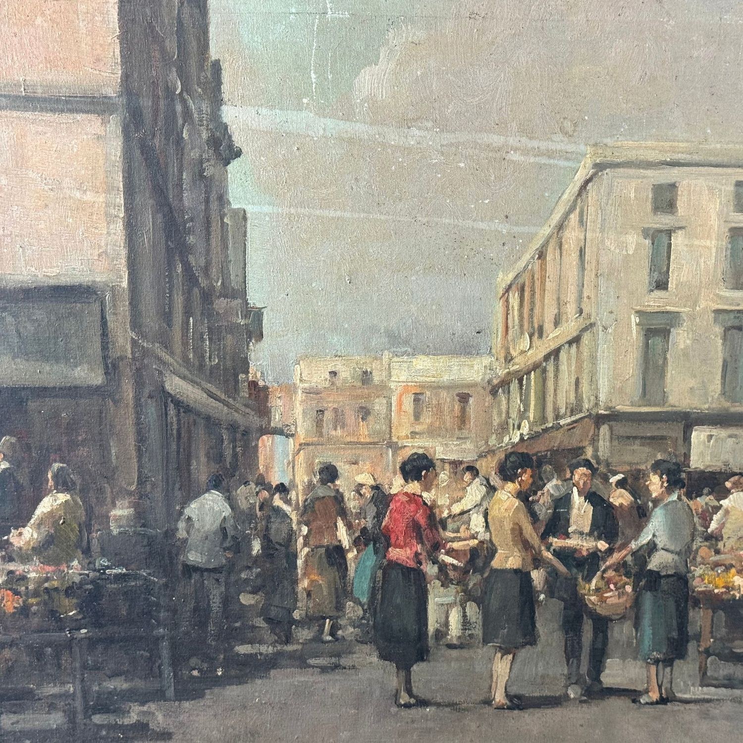 Oil painting on canvas, 20th century Italian school, depicting a Neapolitan market. Dimensions: 80x60 cm. Signed at the bottom right by Salvatore Maresca. Artwork in fair condition with signs of wear and tear as shown in attached photos.