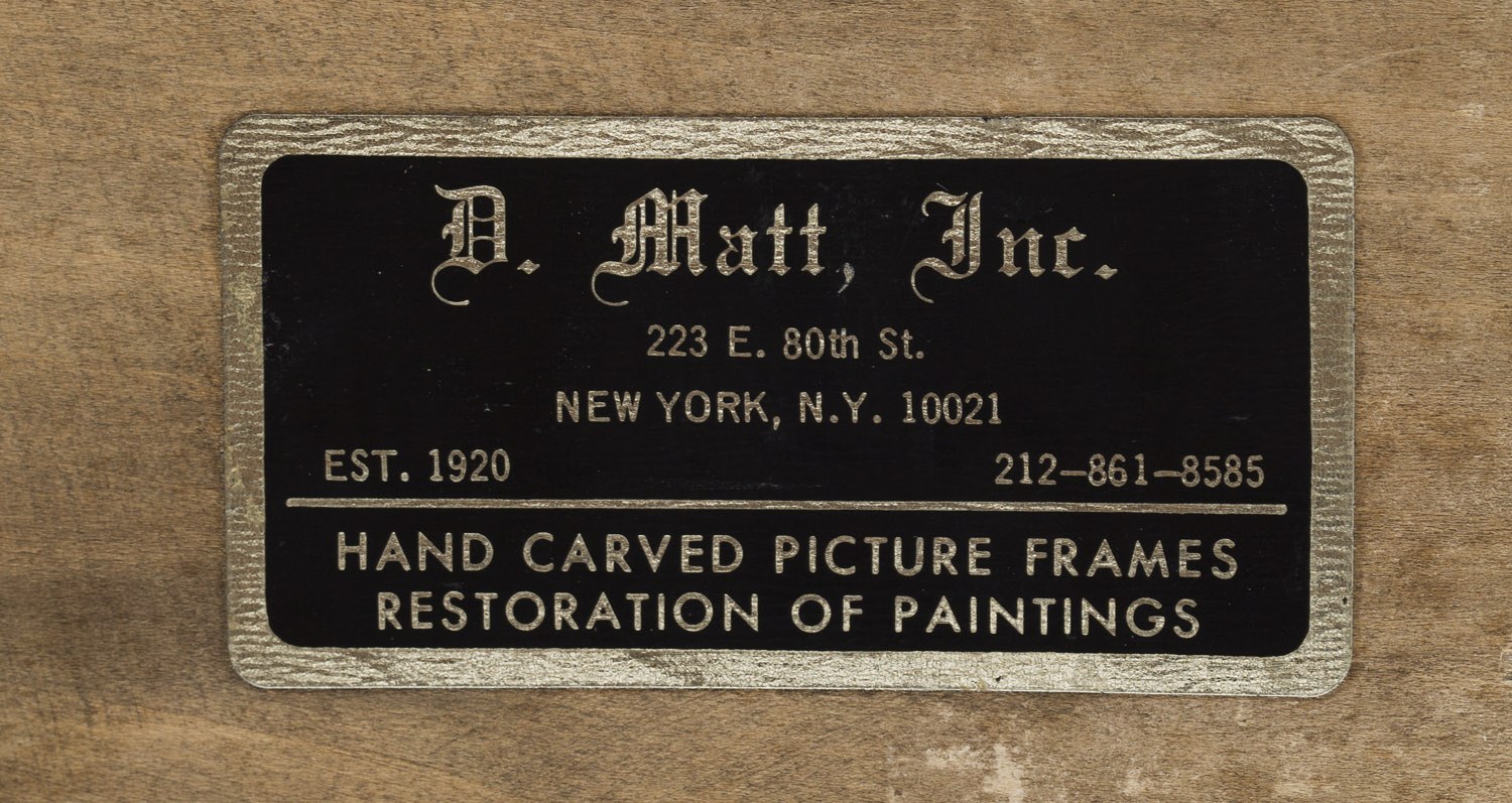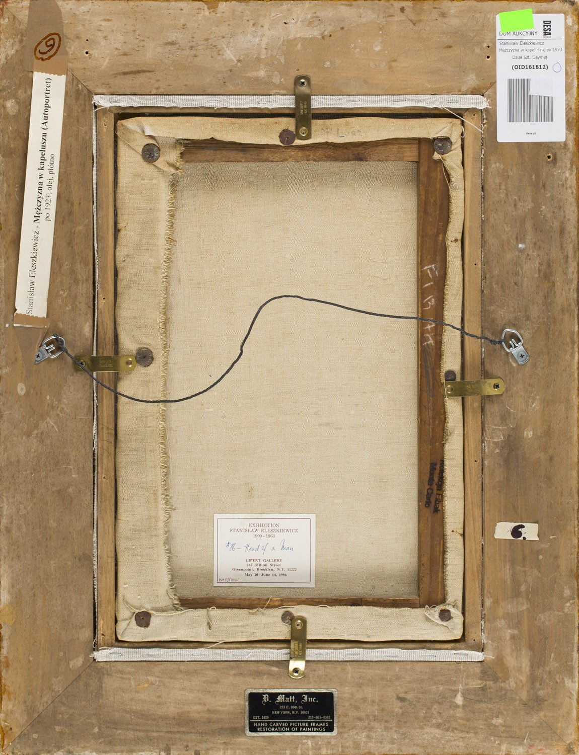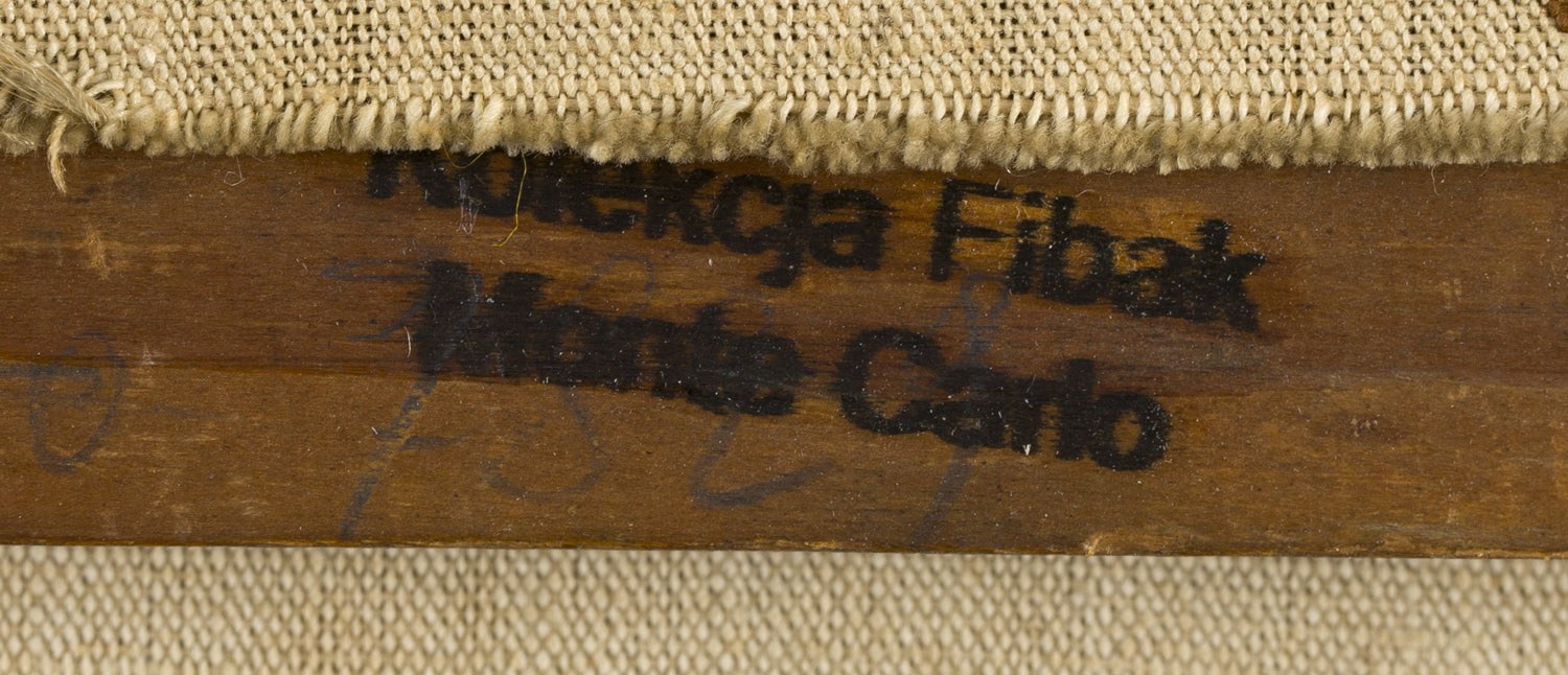 na odwrociu nalepka wystawowa Lipert Gallery, na krośnie malarskim pieczęć kolekcjonera, na odwrociu ramy nalepka ramiarska oraz inwentarzowa