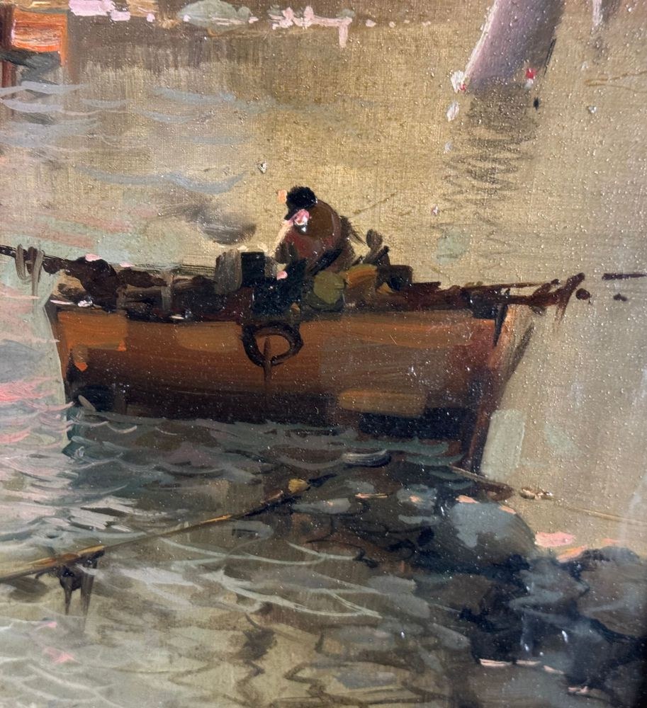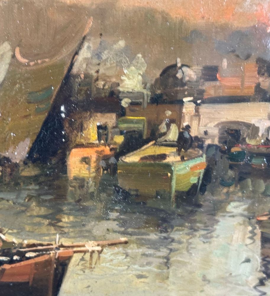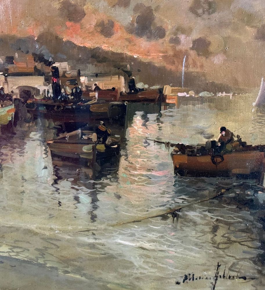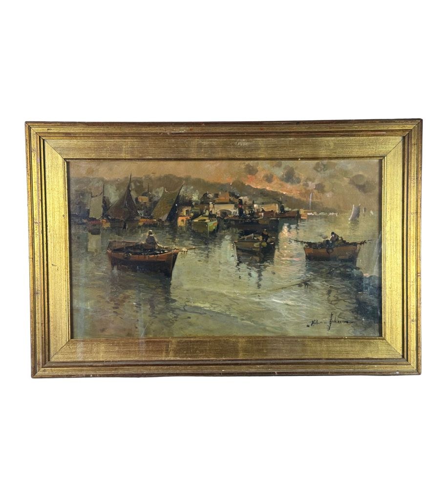 Oil painting on canvas, 20th century, Neapolitan school, depicting *Scorcio di marina napoletana* (View of the Neapolitan Seaside). Dimensions including frame: 56x86 cm. Dimensions inside the frame: 40x70 cm. Signed at the bottom right by an unidentified artist. The work is in good condition.