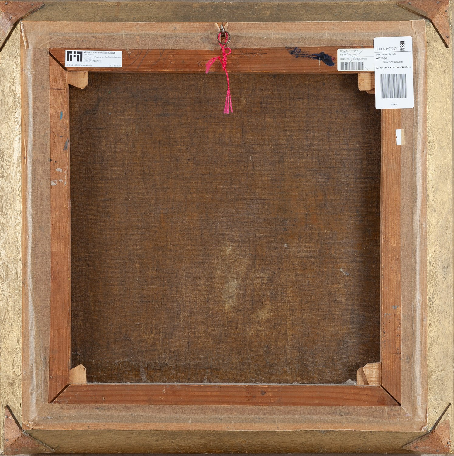 na krośnie malarskim notatki oraz papierowa nalepka wystawowa
