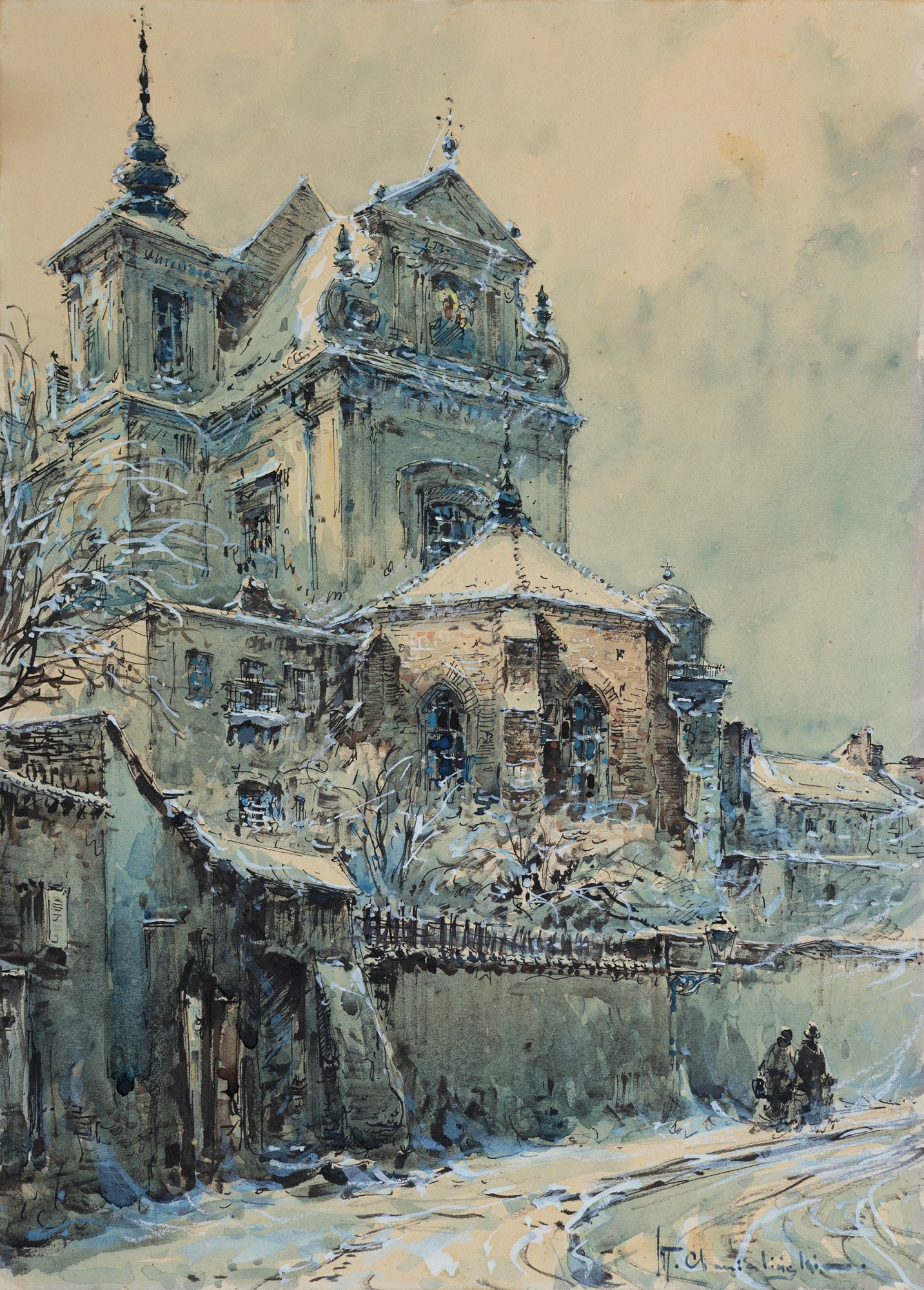 Władysław Chmieliński (Warszawa 1911 - Warszawa 1979) był malarzem związanym z Warszawą, gdzie stale mieszkał i pracował. W latach 1926-1931 studiował w warszawskiej Miejskiej Szkole Sztuk Zdobniczych i Malarstwa (dawna Klasa Rysunkowa). Wiodącym tematem jego obrazów były widoki miejskie, malowane olejno i akwarelą. W latach 1935-1938 stworzył cykl akwarel przedstawiających obiekty polskiej architektury; wśród nich, widoki Sandomierza, Krakowa, Kazimierza nad Wisłą, a także wnętrza zabytkowych kościołów czy pałaców, m.in. Zamku Królewskiego w Warszawie i Pałacu w Wilanowie. Malował także pejzaże i wiejskie sceny rodzajowe – kuligi, sanny, zaprzęgi, wesela, konie na tle krajobrazu. W latach 1967-1969 wyjeżdżał na dłuższe pobyty do Danii. W latach 1936-1939 artysta używał także pseudonimu „Władysław Stachowicz”.