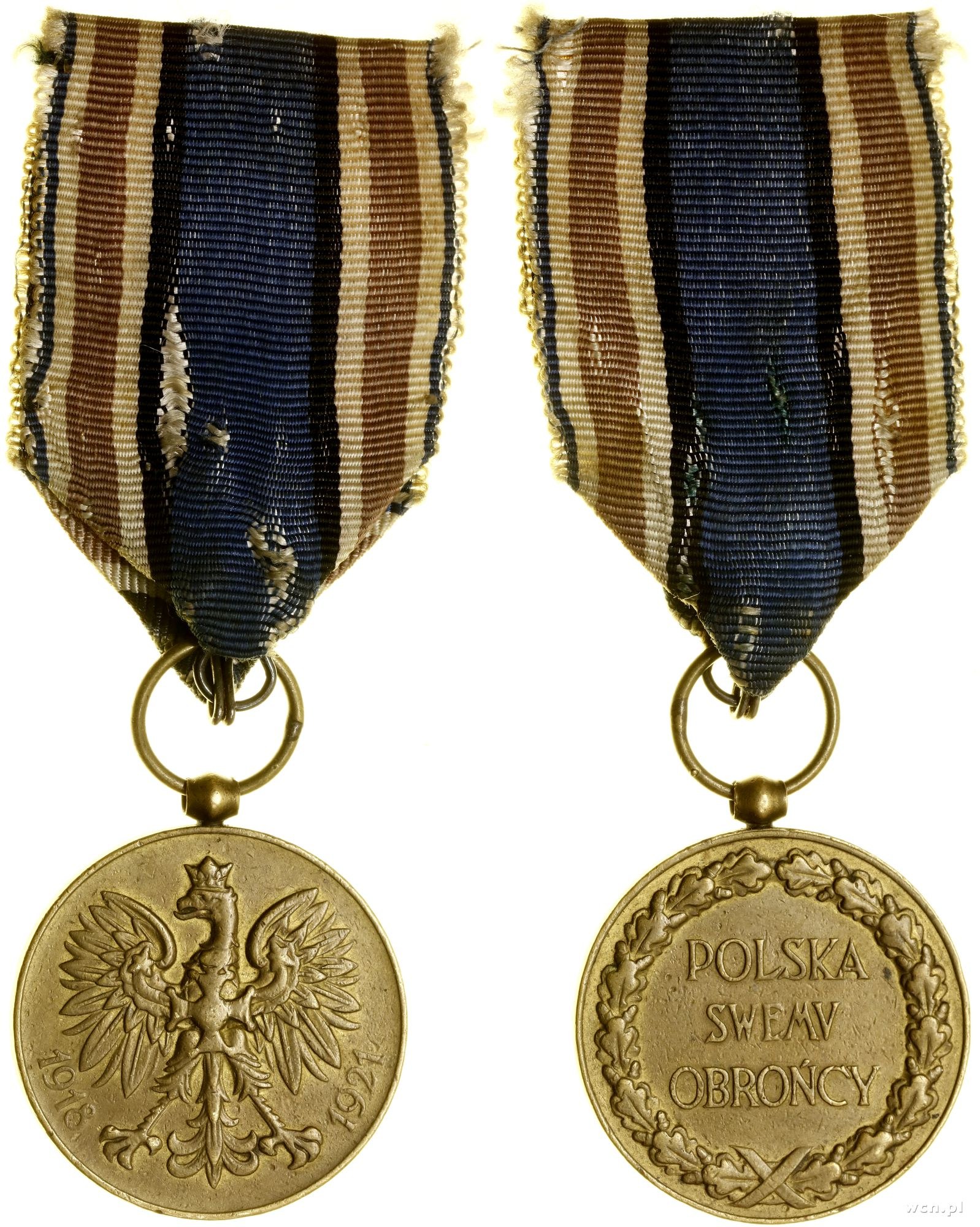 Orzeł, na piersi którego widnieje Krzyż Orderu Wojennego Virtuti Militari, z boków 1918 - 1921, na stronie odwrotnej w wieńcu POLSKA / SWEMV / OBROŃCY, niżej znak mennicy, odznaczenie jednoczęściowe, mocowane na wstążkę, wykonane w Mennicy Państwowej