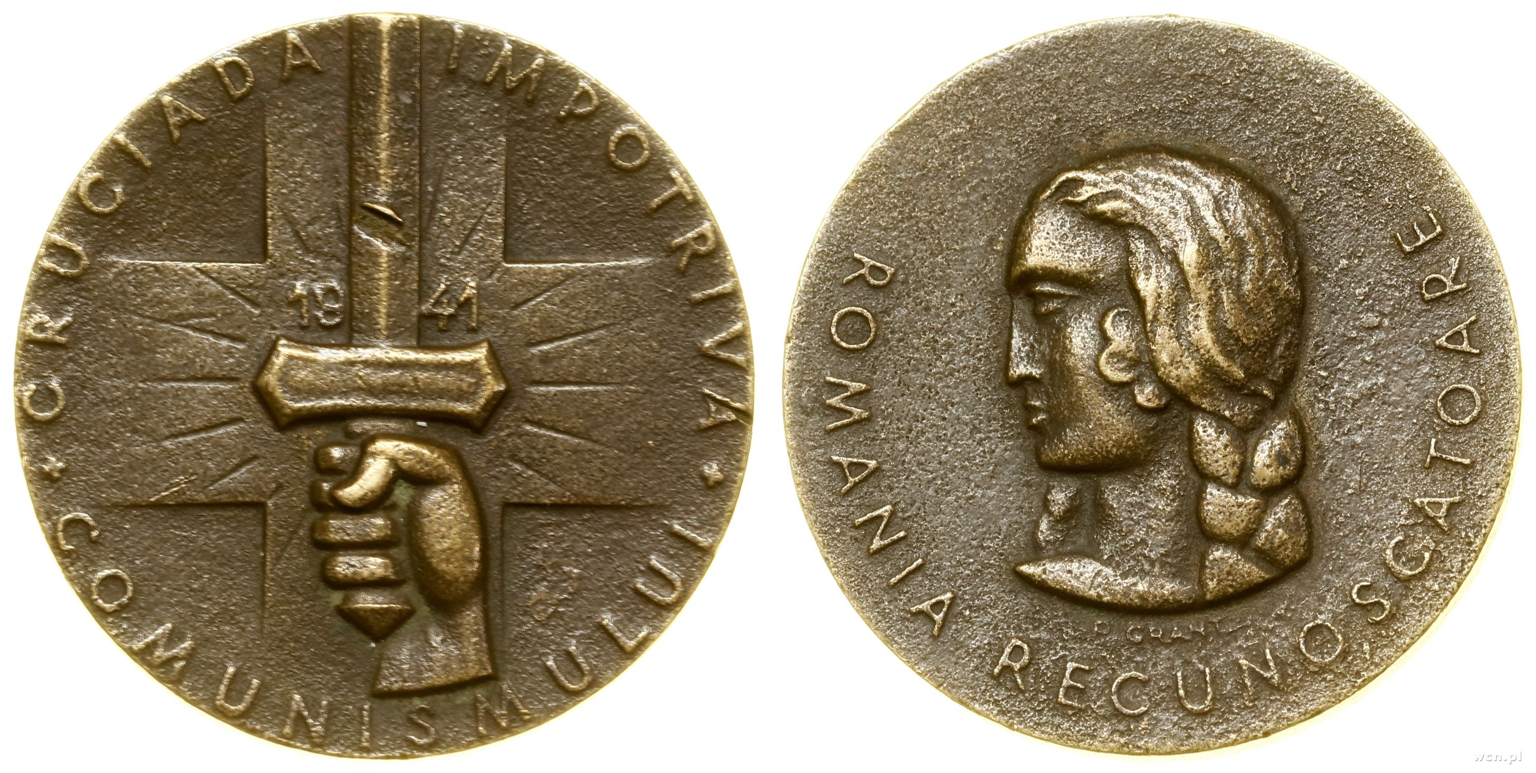 Krzyż, na którym otoczona promieniami dłoń trzymająca miecz, nad jelcem 19 - 41, CRUCIADA ÎMPOTRIVA COMUNISMULUI, na stronie odwrotnej głowa kobiety w lewo, ROMÂNIA RECUNOSCĂTOARE, odznaczenie jednoczęściowe, mocowane na wstążkę, urwany łącznik, brak wstążki