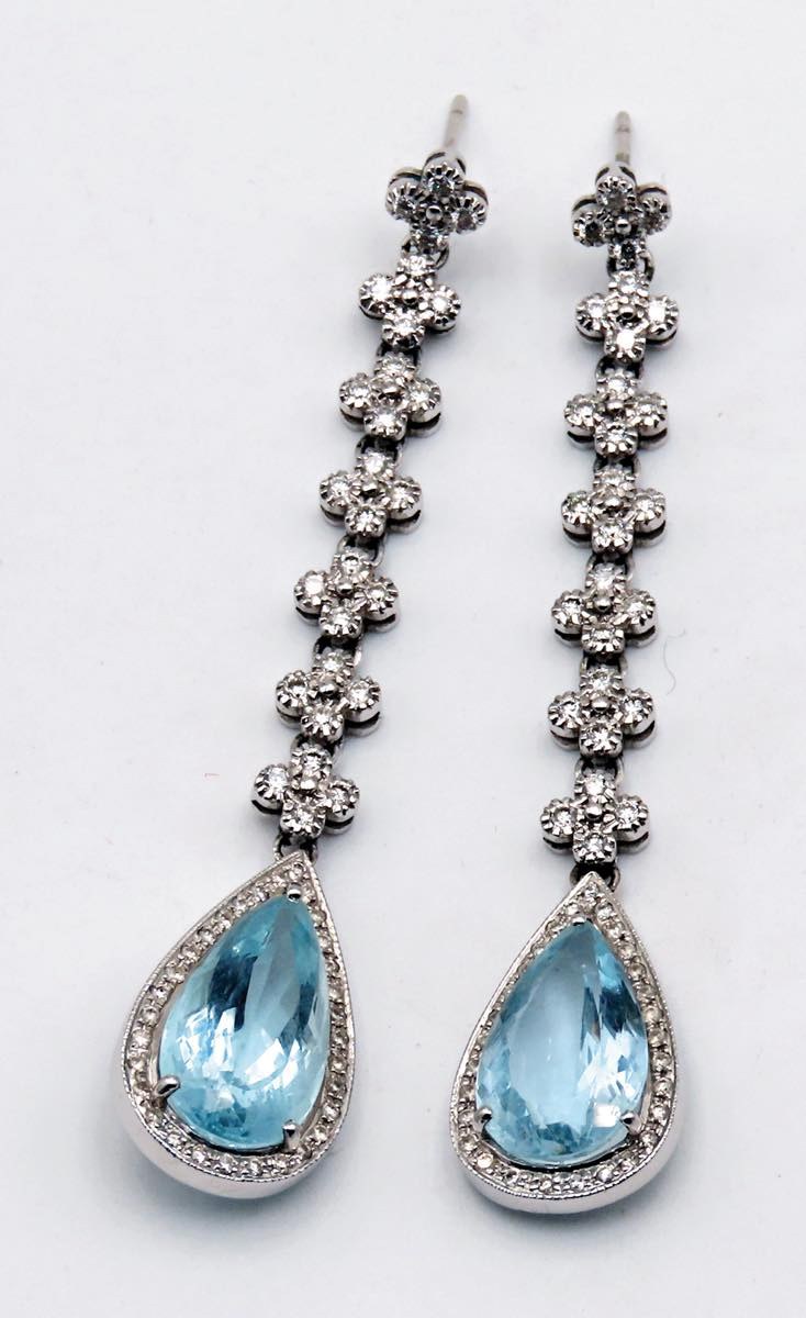 Paio orecchini in oro bianco ,brillanti ct. 2,00 circa e due acquamarine a forma di goccia del peso di ct.6 circa. gr.11,60
