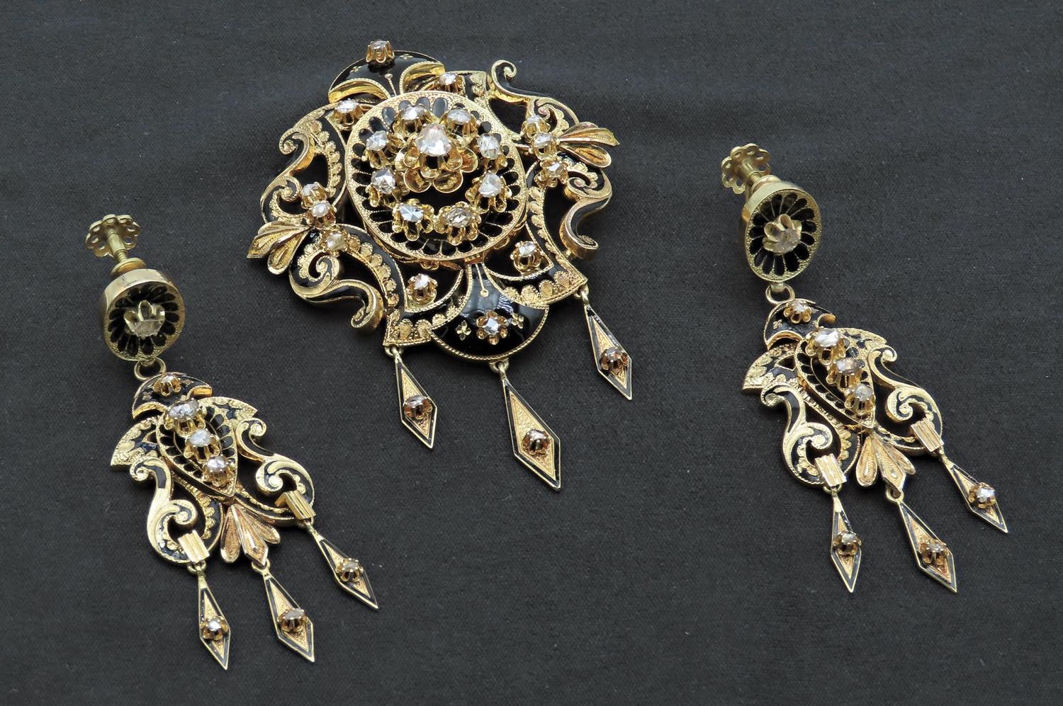 Spilla e orecchini in oro rosso con piccoli diamanti e smalto nero,spilla cm. 7 x 5 circa. gr.38,45