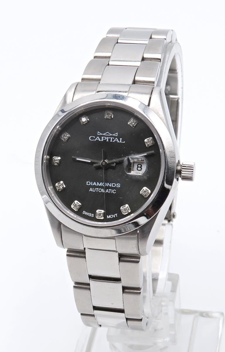 CAPITAL - Movimento AT 1010 a carica automatica. Cassa in acciaio con diametro di 31 mm. Quadrante nero con indici a diamanti. Ore, minuti e secondi al centro. Finestra per la data al 3. Bracciale in acciaio con chiusura deployante. Fondello a vista. Orologio usato ma in eccellenti condizioni estetiche. Funzionante.