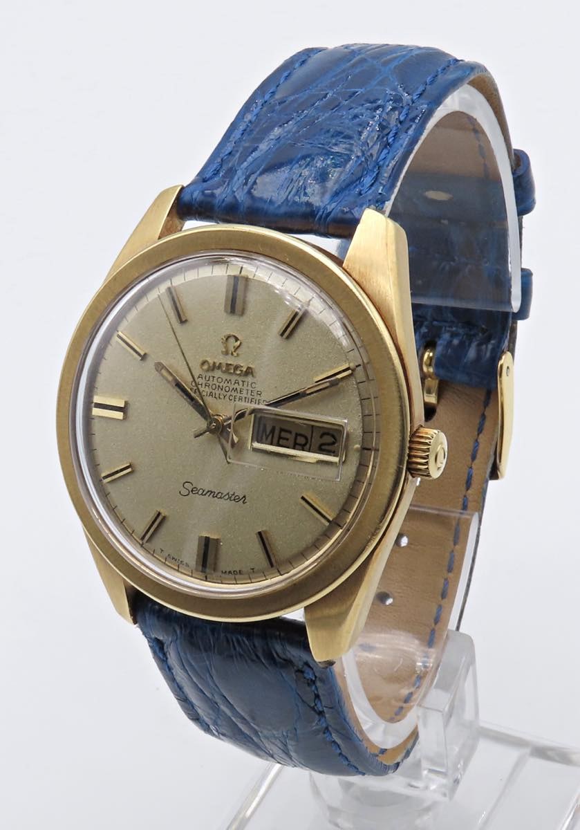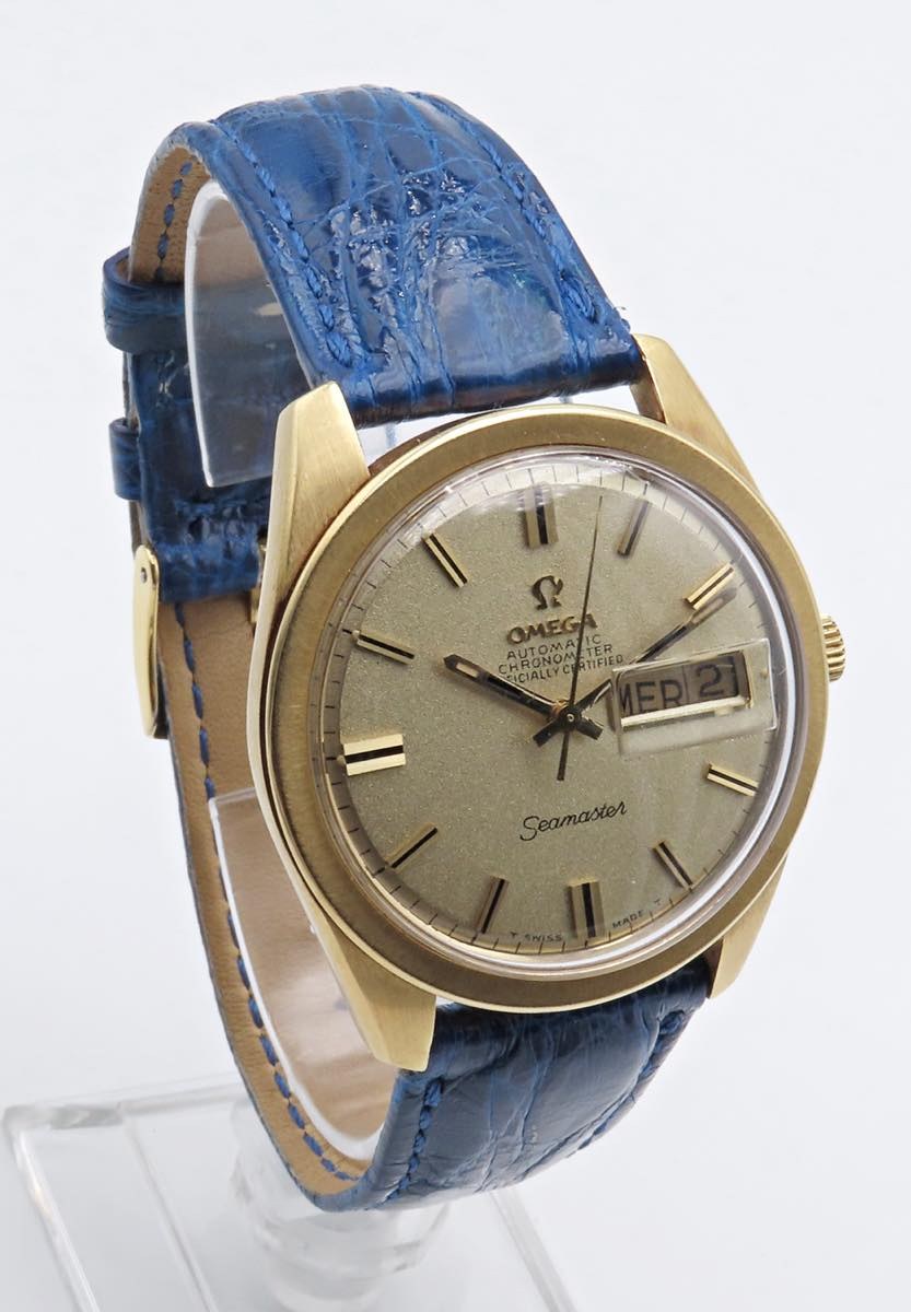 OMEGA- Seamaster - Movimento a carica automatica. Referenza 166032. Cassa in oro 18k con diametro da 37 mm. Dial dorato con doppia finestra per la data al 4. Vetro plexiglas. Cinturino e fibbia anonimi. fondello in oro a vite con logo "Seamaster" esterno. 1970 ca. Ottime condizioni generali. Al momento della catalogazione l'orologio risulta essere funzionante, ma il movimento non è stato testato per la precisione del tempo.