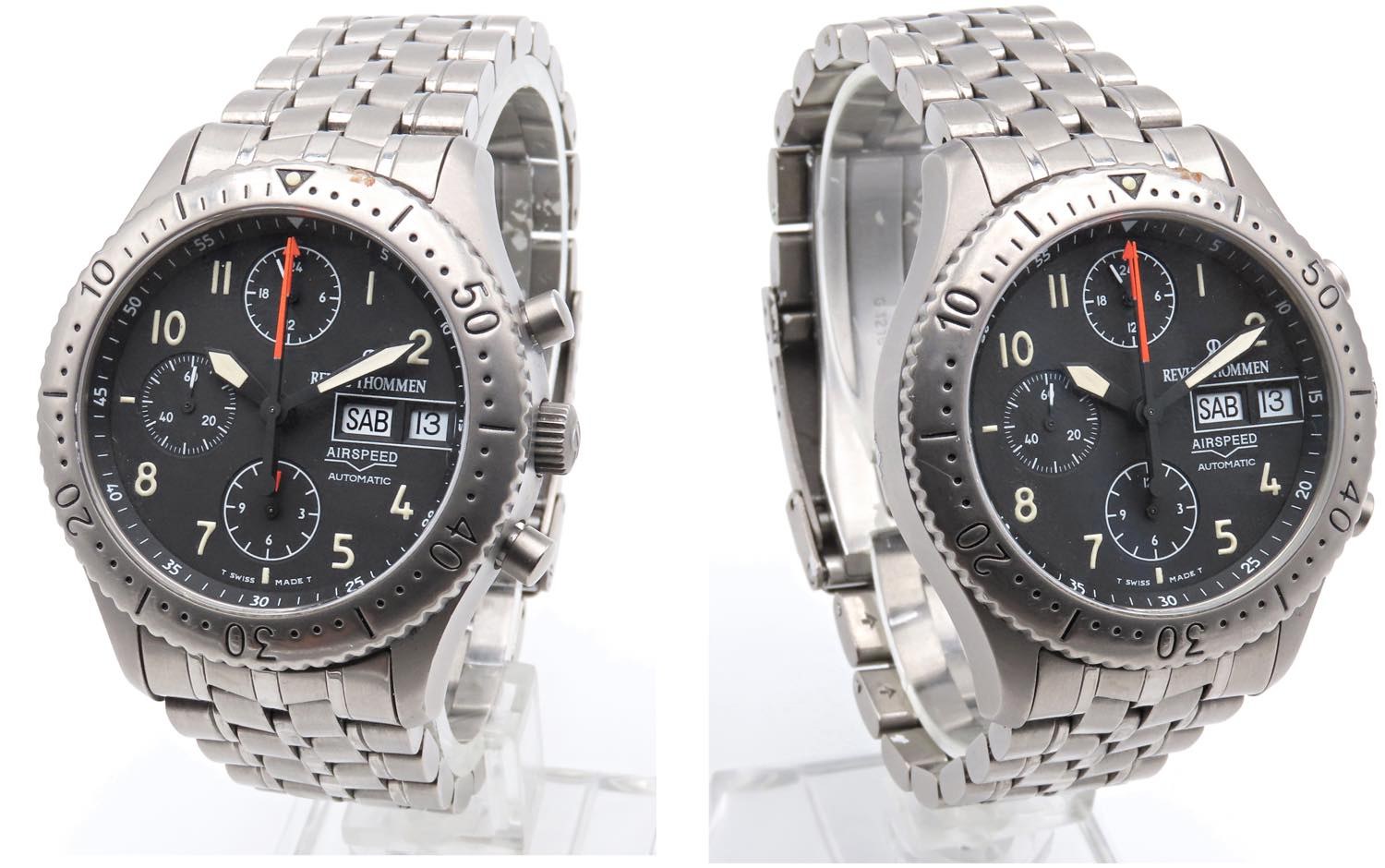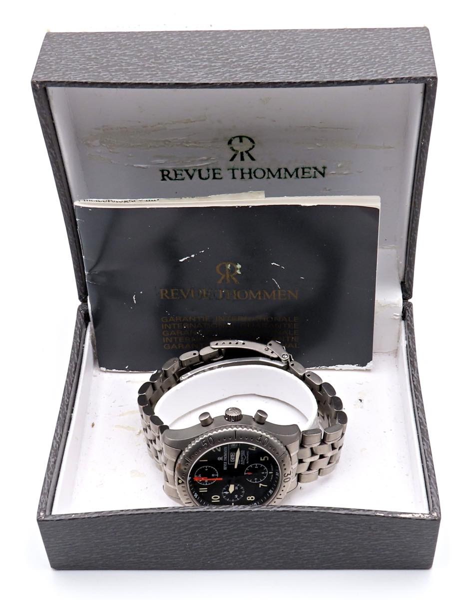 REVUE THOMMEN- Cronografo - Airspeed. Movimento Lemania a carica automatica. Cassa in titanio con diametro da 40 mm. Dial nero a 3 contatori con secondi al 9. Doppia finestra per la data al 3. Tasti per azionamento del cronografo a pompa. Vetro zaffiro. Cinturino originale con chiusura deployante. Fondello a vite. 1990 ca. Ottime condizioni generali. Al momento della catalogazione l'orologio risulta essere funzionante, ma il movimento non è stato testato per la precisione del tempo.