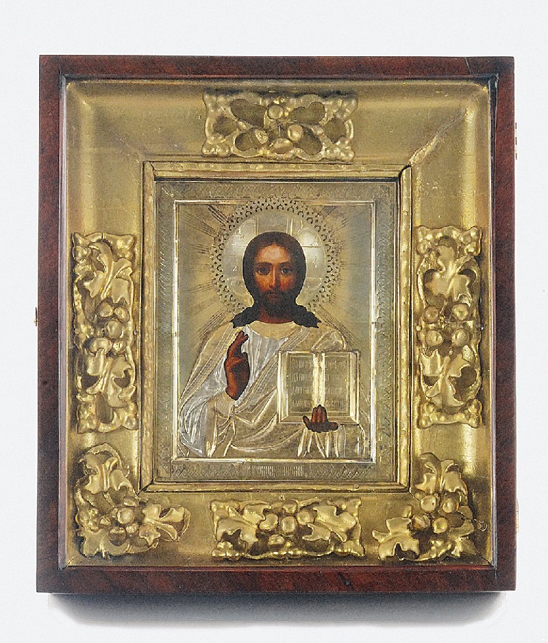 Ikona - Chrystus Pantokrator, w okładzie srebrnym i kiocie