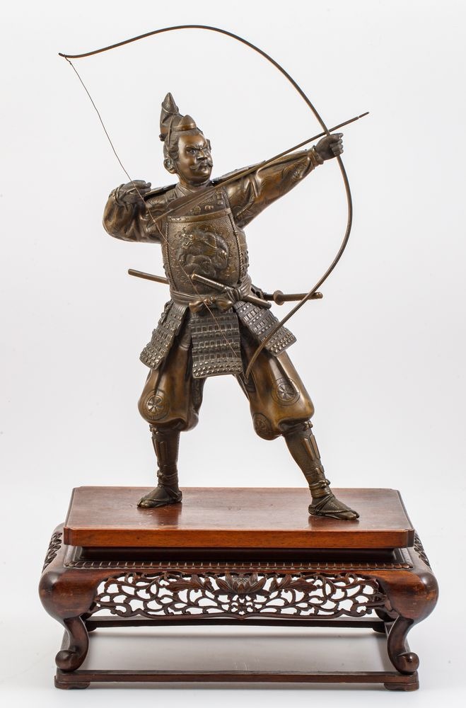 Brąz, polichromia (oczy), drewno (podstawka), wys. całk. 62 cm, podstawka 16 x 38 x 28 cm