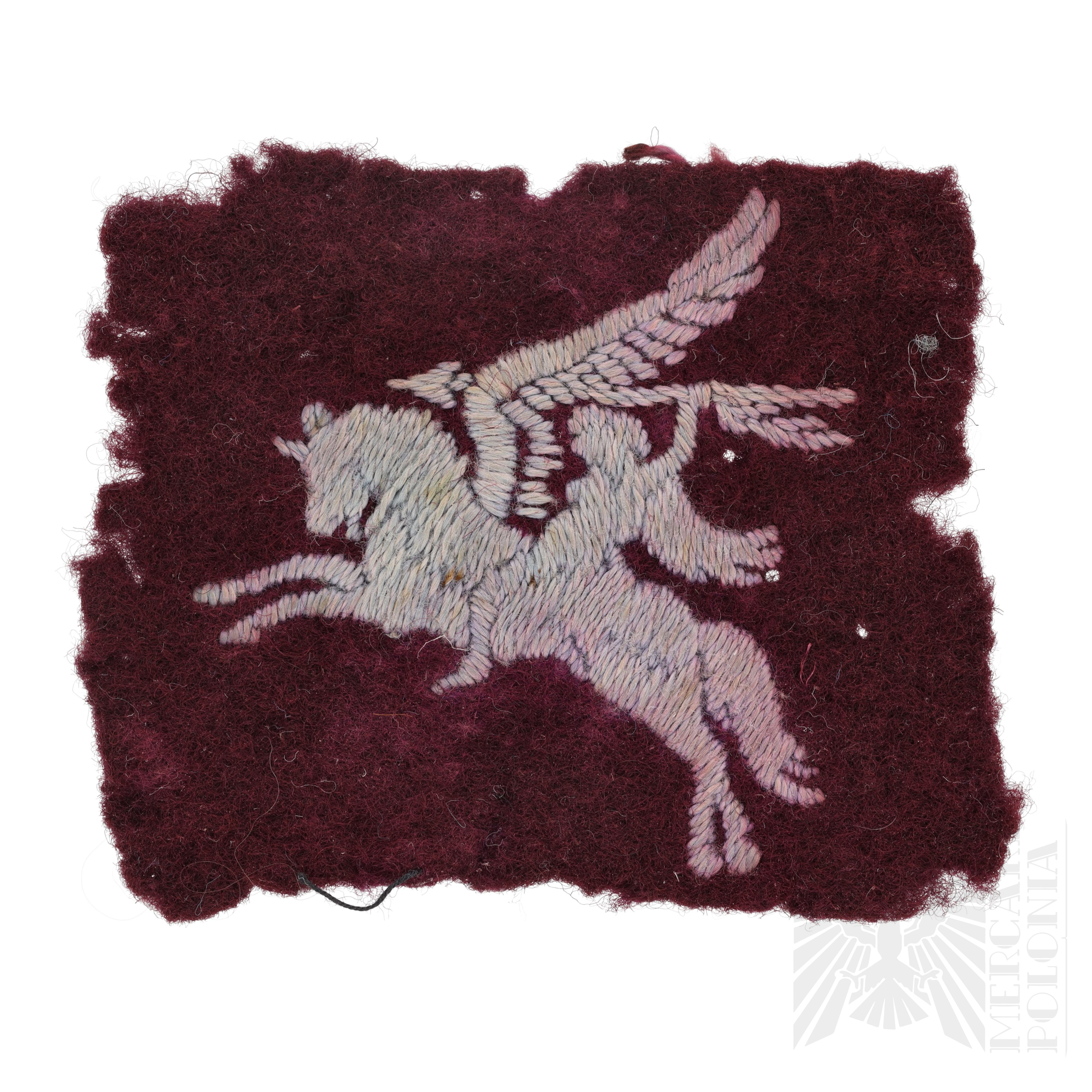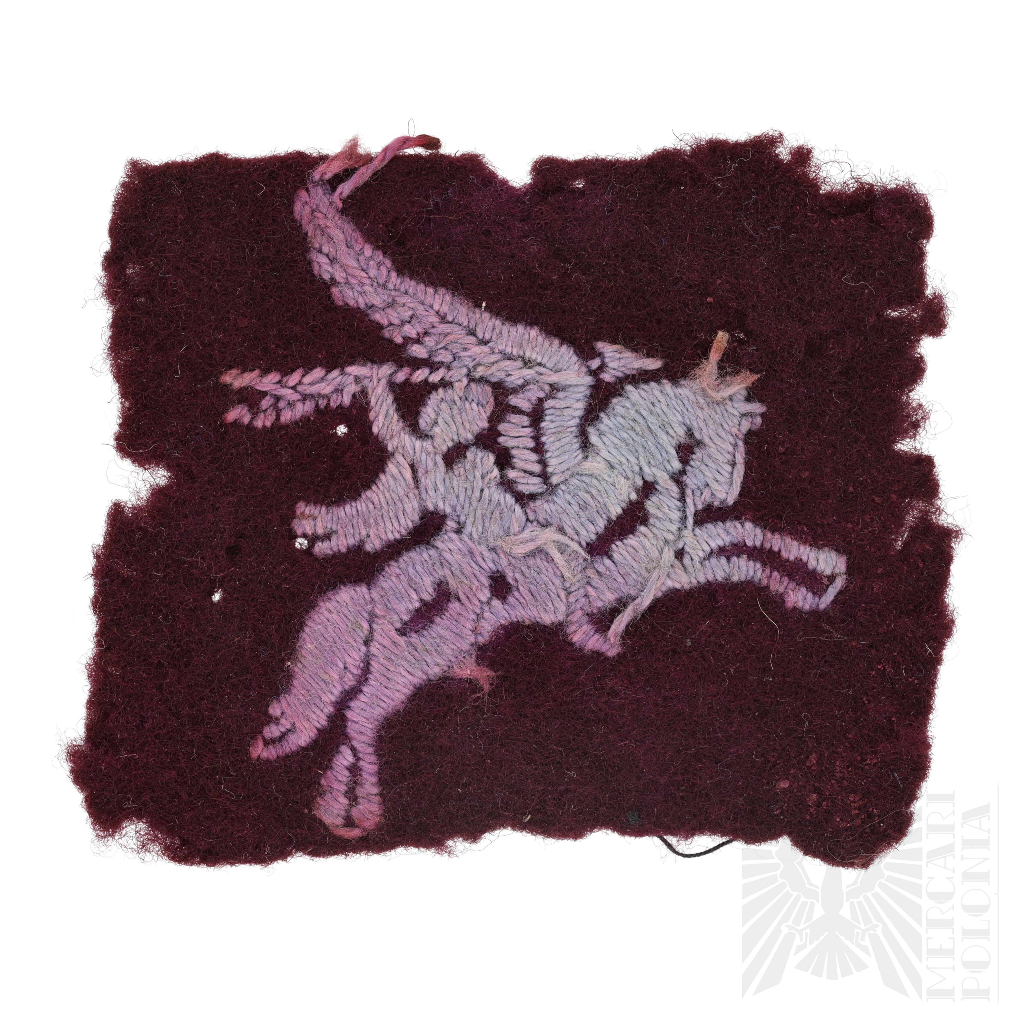 Oryginalna, haftowana naszywka przedstawiająca Pegaza, noszona przez brytyjskie oddziały powietrznodesantowe podczas II wojny światowej. Pojedyncza naszywka skierowana w lewo.