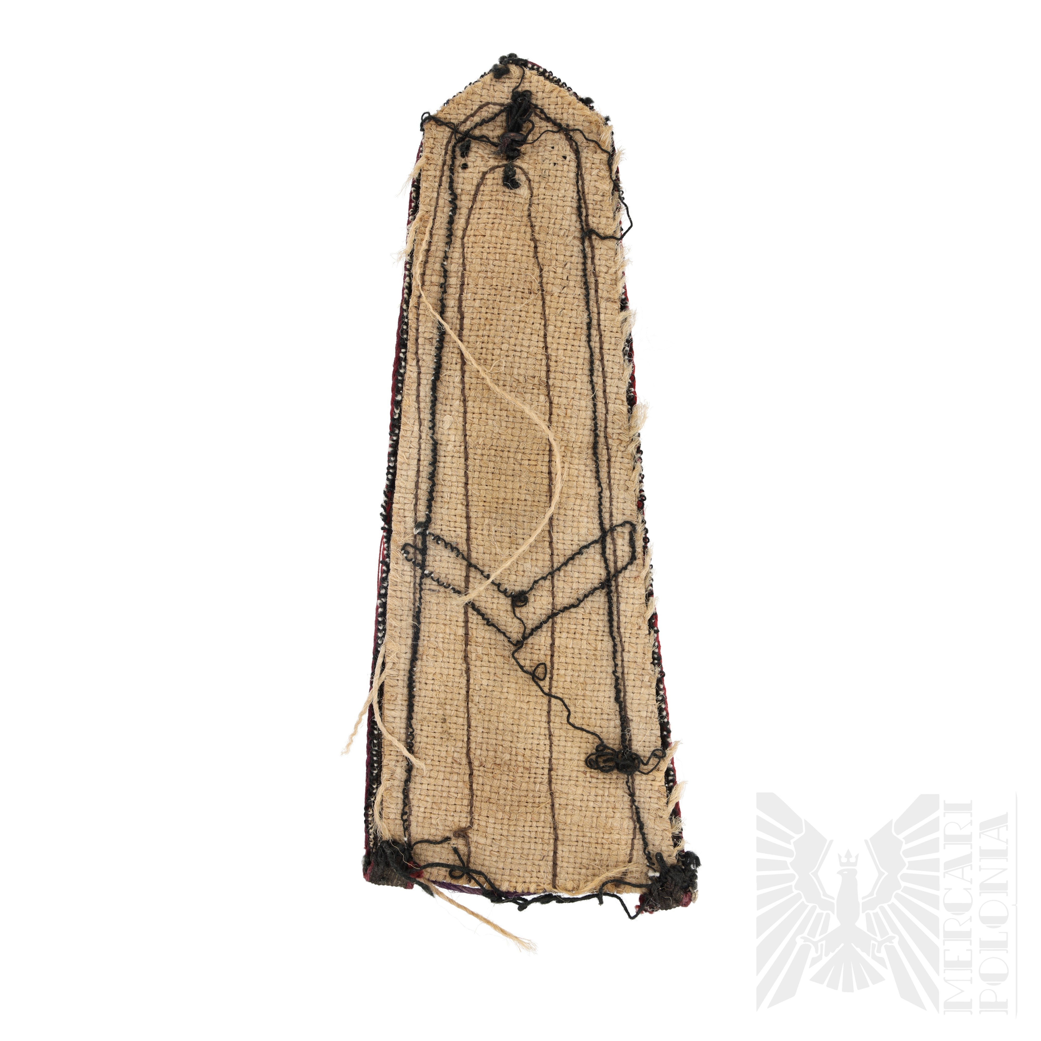 Naramiennik ze stopniem sierżanta do munduru letniego. Taśma dystynkcyjna typowa dla okresu międzywojennego, na górze guzik wz28. Naramiennik typowo zakończony w szpic. Brak zielonego sukna które zostało zniszczone przez mole.
