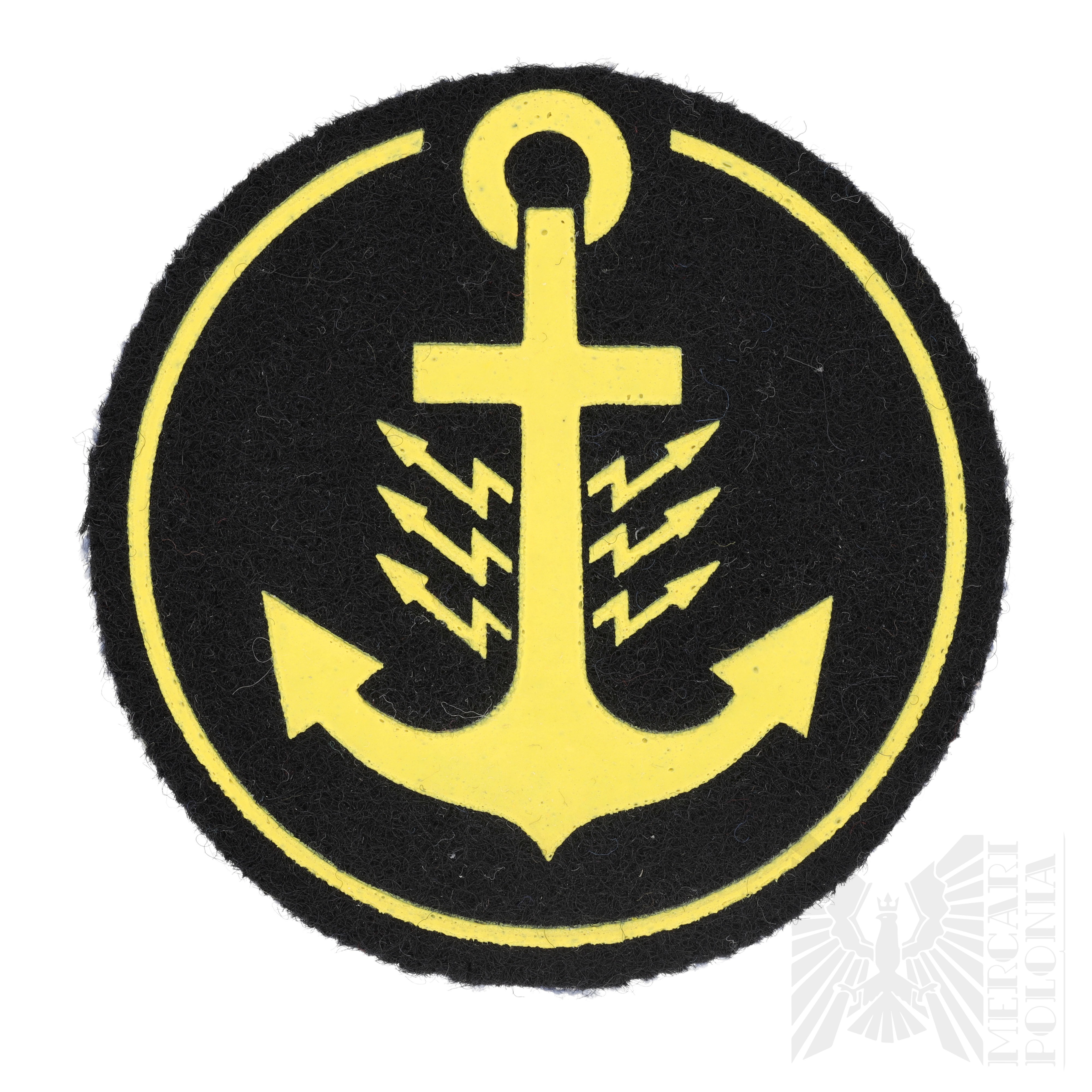 Naszywka Specjalisty Radiotelegrafisty Marynarki Wojennej. Czarna okrągła naszywka przedstawiająca żółtą kotwicę, bo bokach kotwicy widoczne po 3 błyskawice.