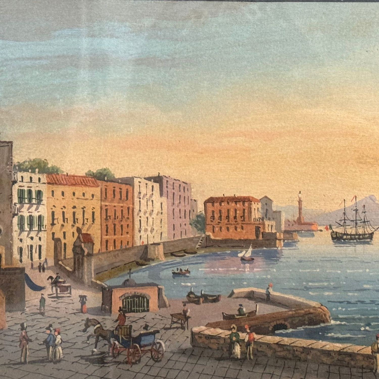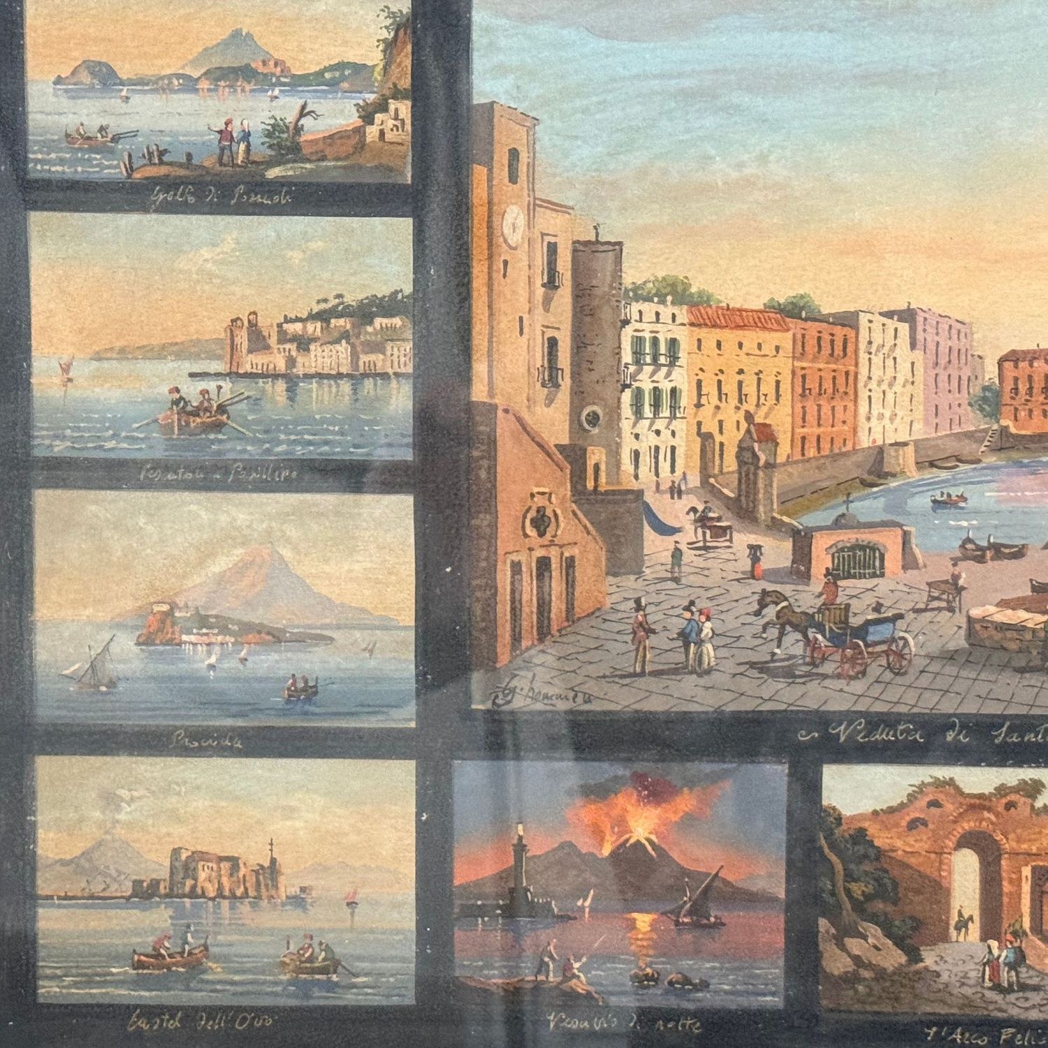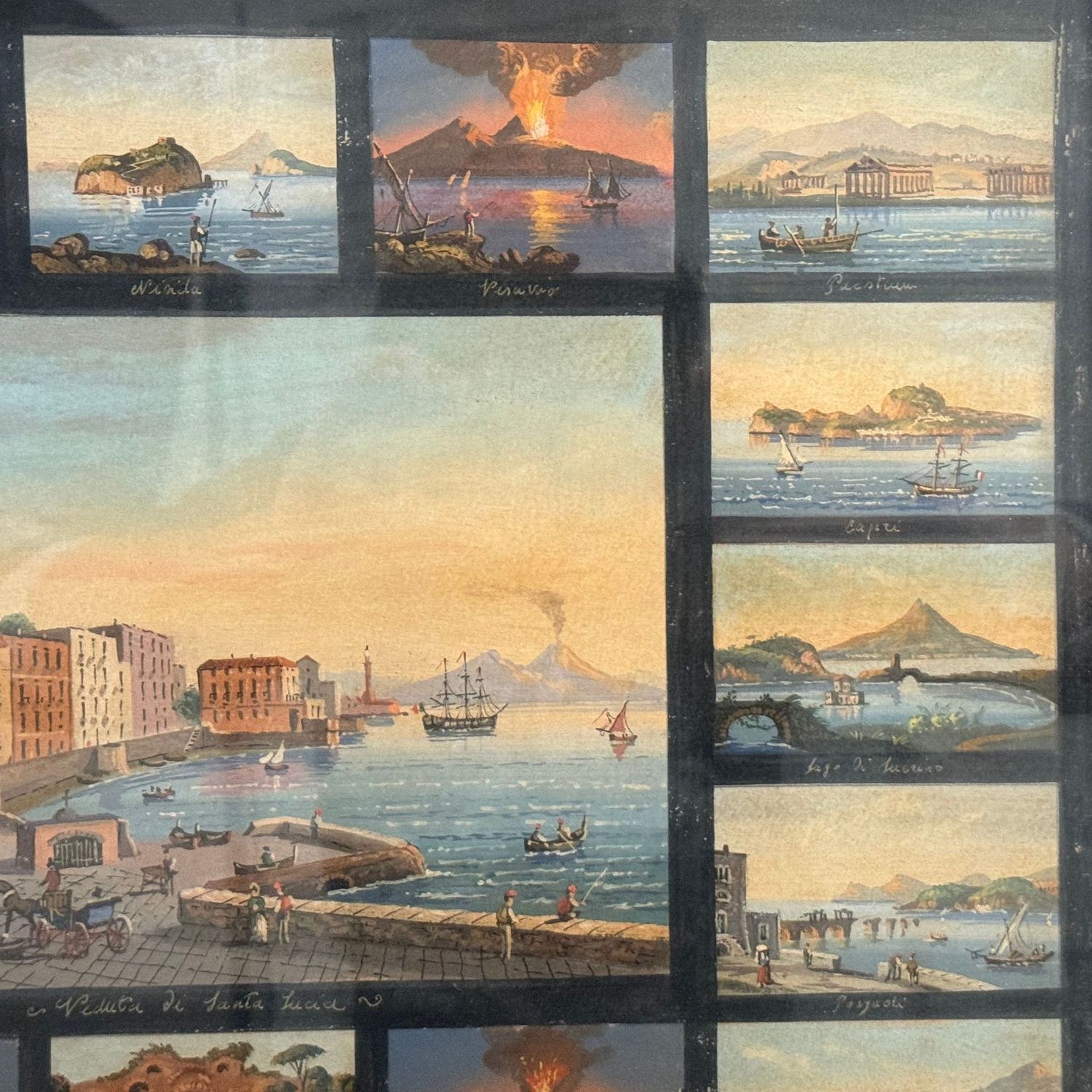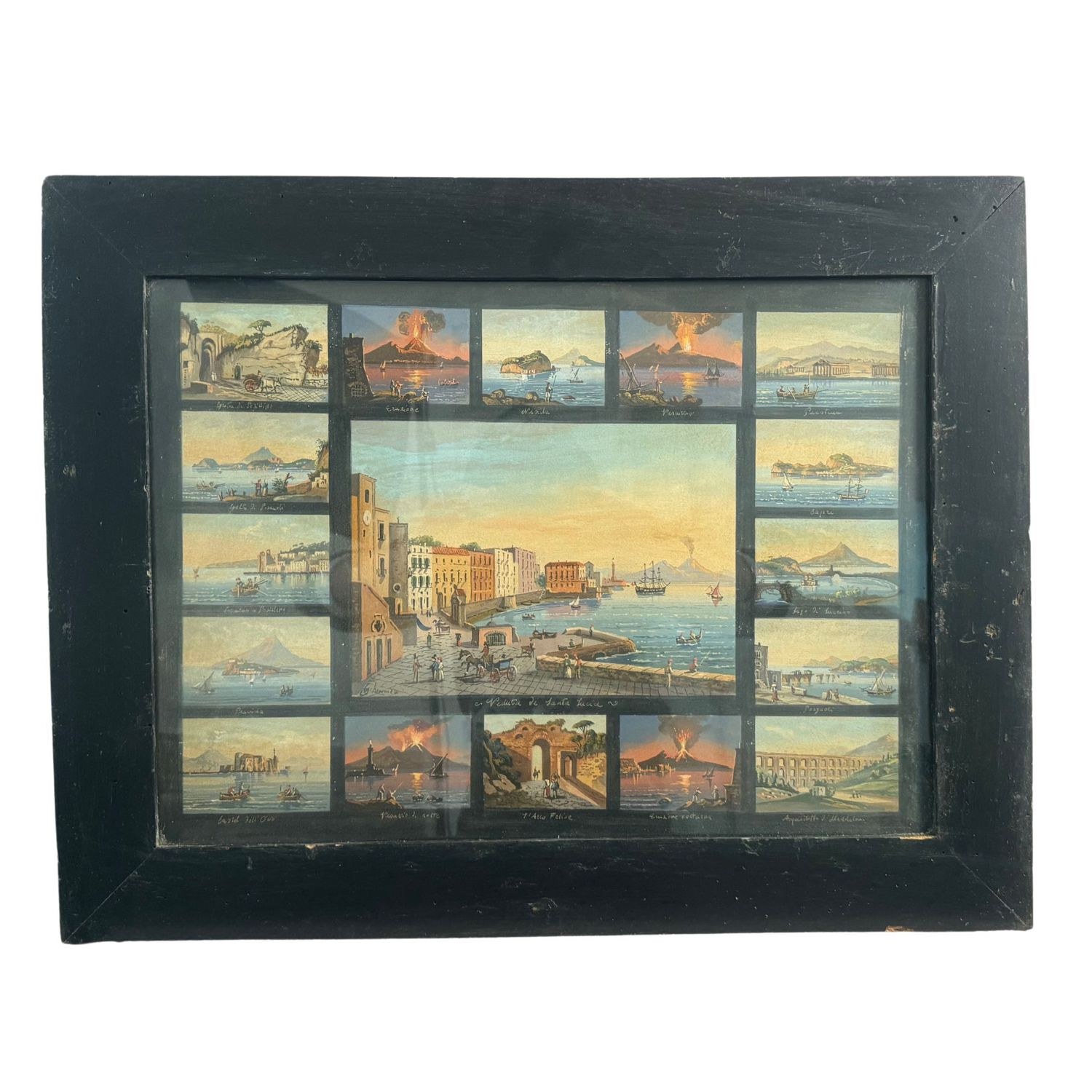 Watercolor painting (tempera on paper), 19th/20th century Italian school, depicting a grouping of 17 miniatures portraying Naples and its surroundings. In a frame with defects and losses. Painting in good condition. Frame interior dimensions: 52x38.5 cm. By an anonymous artist.