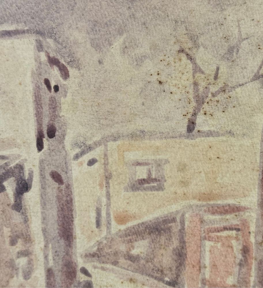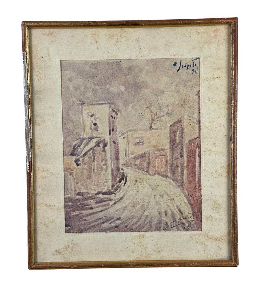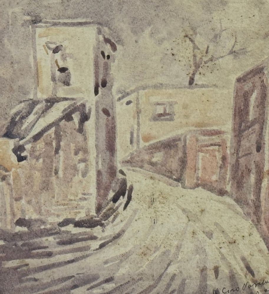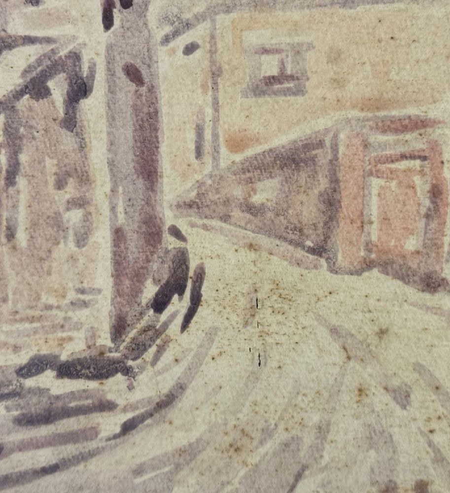 Watercolor on paper, 20th-century Italian school, depicting a narrow street. Dimensions including the frame: 32x38 cm. Interior frame dimensions: 21x26 cm. Signed at the top right by an unidentified artist. The piece is in good condition with slight signs of wear as shown in the attached photos. It also includes a dedication at the bottom right.