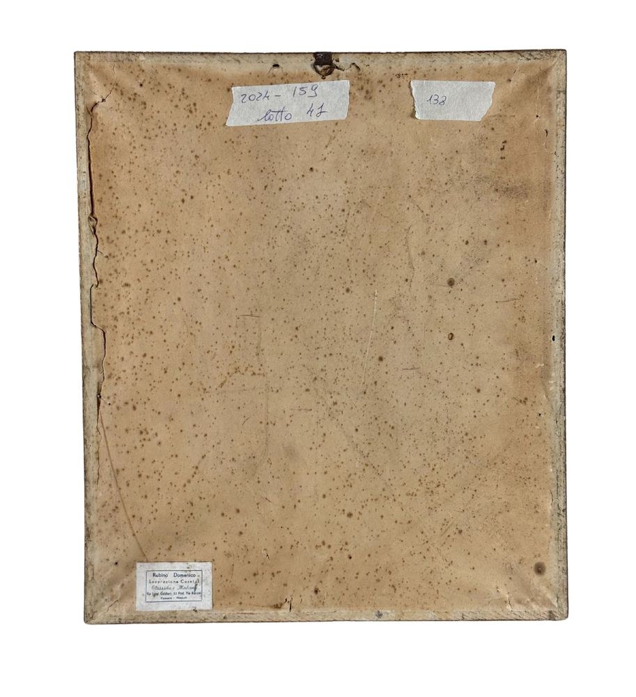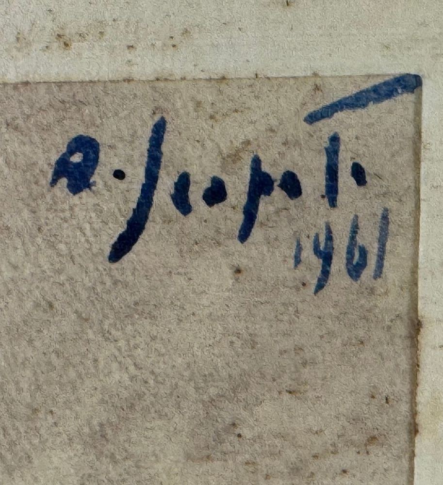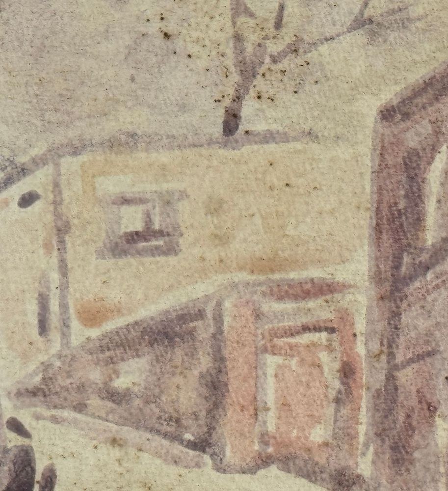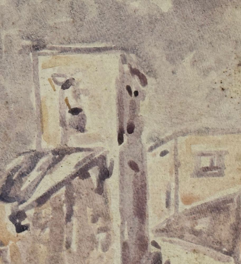 Watercolor on paper, 20th-century Italian school, depicting a narrow street. Dimensions including the frame: 32x38 cm. Interior frame dimensions: 21x26 cm. Signed at the top right by an unidentified artist. The piece is in good condition with slight signs of wear as shown in the attached photos. It also includes a dedication at the bottom right.