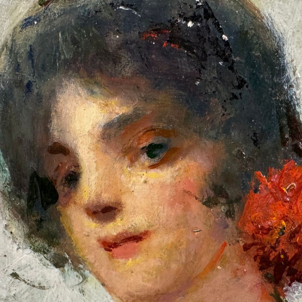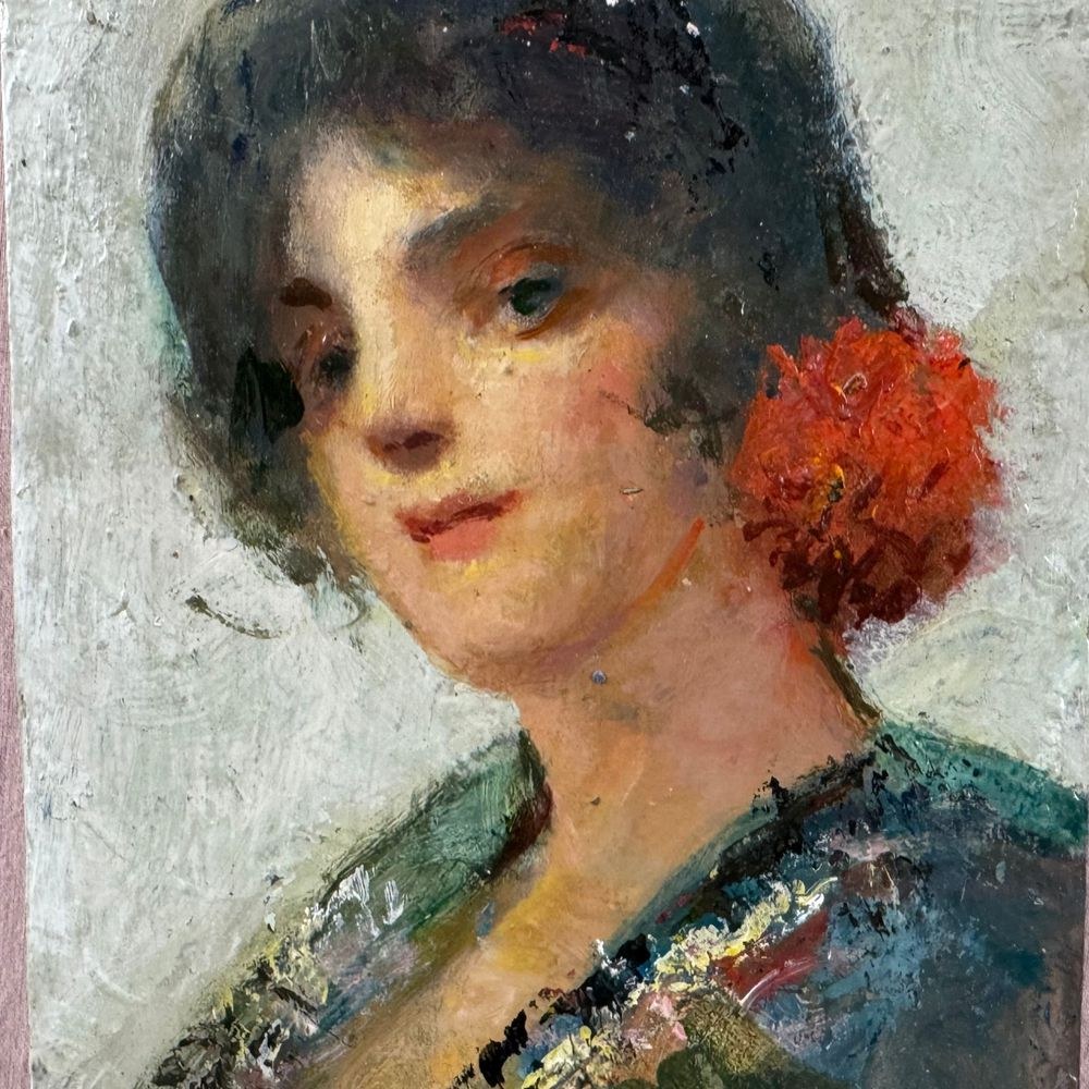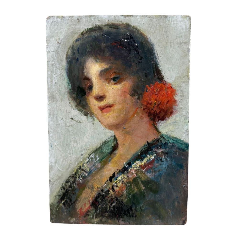 Oil painting on board, 20th century Italian school, depicting a portrait of a woman in the Impressionist style. Dimensions: 15x22 cm. By an anonymous artist. The artwork is in good condition with slight signs of wear as shown in the attached photos.