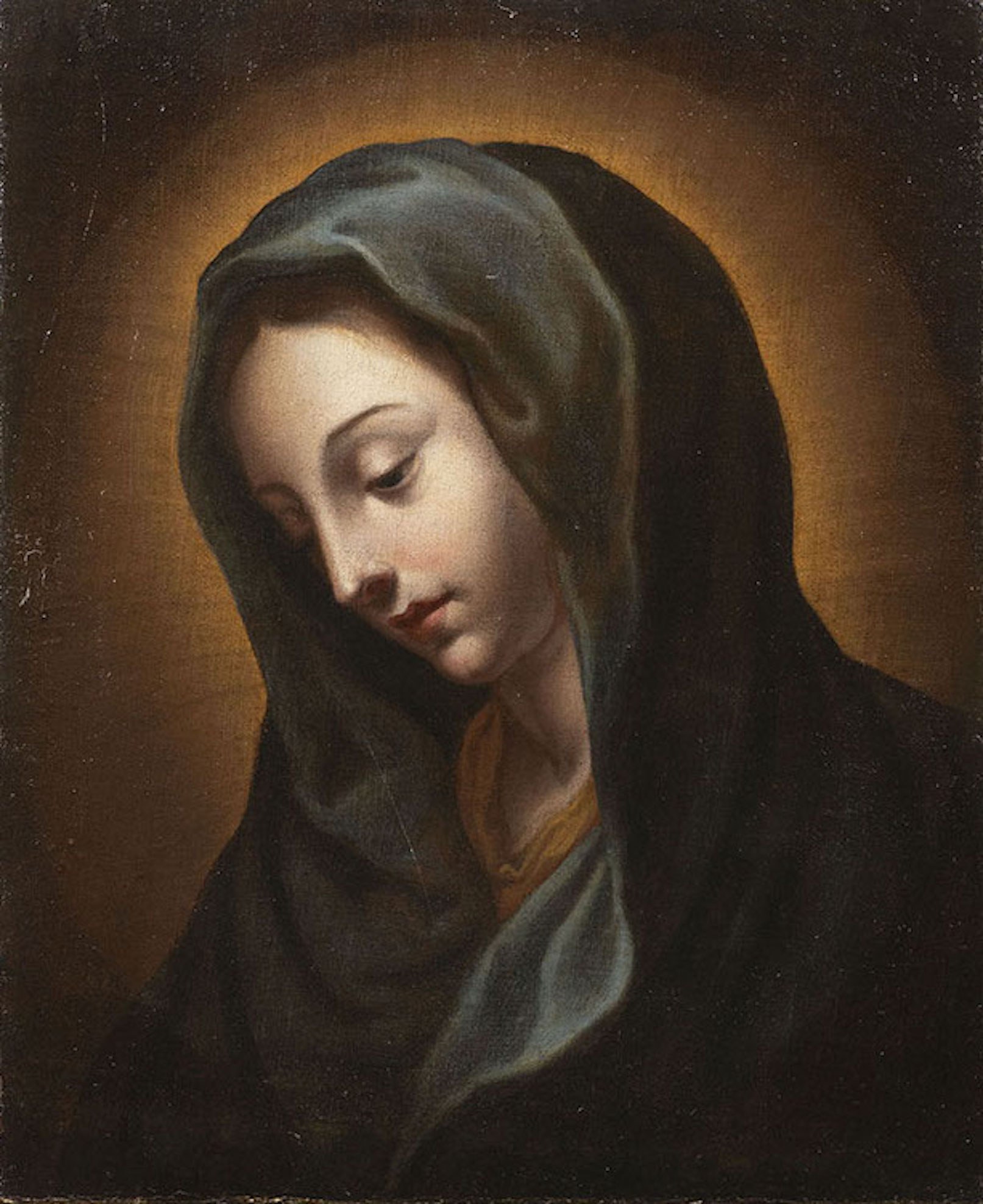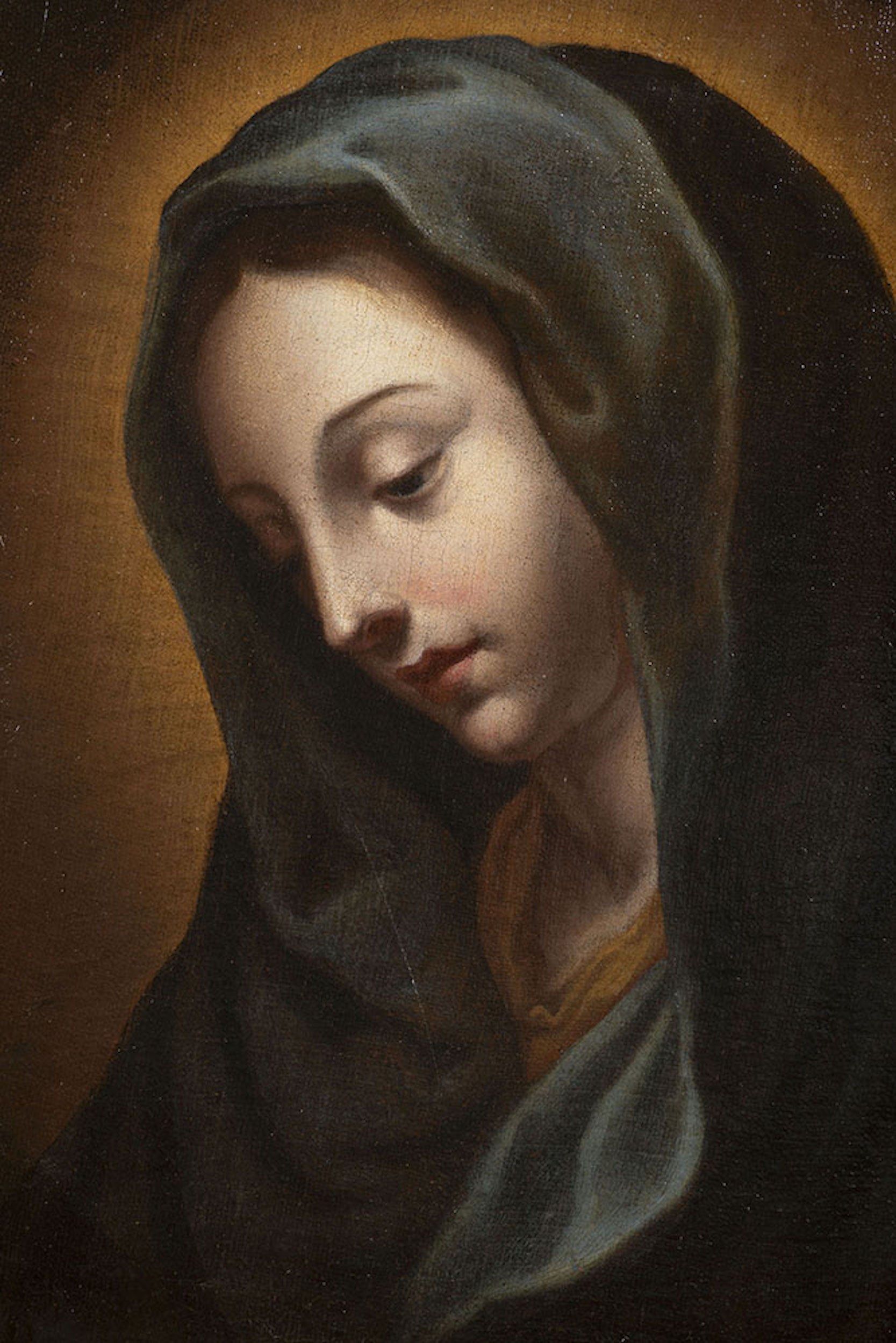 Onorio was a pupil of Carlo Dolci (1616–1686), whose emotional style and color scheme he adopted in his work. Mary is depicted with her head bowed and a blue mantle draped over her head. A golden halo surrounds her head. The artist stylized the forms so that the veiled head appears almost circular and matches the round halo. The gold of the nimbus is reflected in the color of Maria's shirt. Mary's facial features are of youthful beauty, her downcast eyes showing her humility. She is apparently depicted at the moment when the Archangel Gabriel announces to her the virgin birth of Christ and she declares herself a servant of God (ancilla Dei). The head of Mary is inspired by the famous compositions of Carlo Dolci, Mater Dolorosa and Madonna of the Annunciation (Louvre, Paris). In both cases, Dolci shows Maria's hands, which Onorio Marinari has abandoned to concentrate fully on the face framed by the blue cloak.
