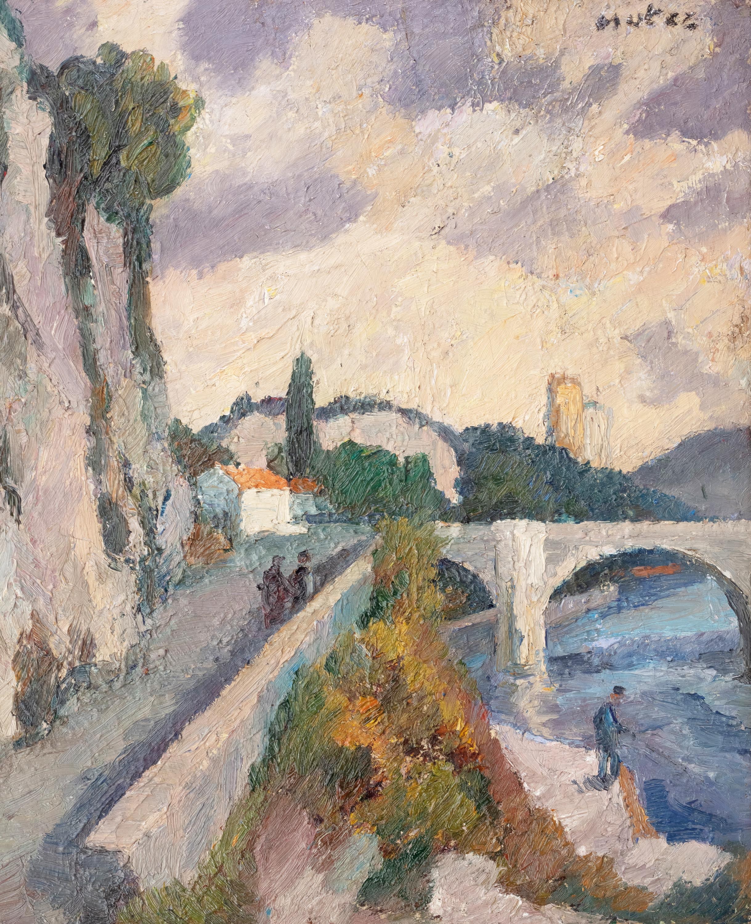 Drugim gatunkiem malarskim, który – obok portretów, będących głębokim studium psychologicznym – upodobała sobie Mela Muter były pejzaże. Artystka była bardzo wrażliwa na doznania, których dostarczała jej natura. Potrafiła dostrzec emocjonalną, niemal ludzką sferę otaczającej jej przyrody. Choć sama w następujący sposób konstatowała swój stosunek do natury: „Piękne pejzaże tak bardzo urzekają, że ma się ochotę odtworzyć je dokładnie, bez swego własnego ich przetwarzania” (cyt. za: B. Nawrocki, „Mela Muter, jej malarstwo i jej modele”, [w:] „Kolekcja Bolesława i Liny Nawrockich. Mela Muter”, Warszawa, 1994, s. 36 [kat. wyst.]); to nie można odmówić tym przedstawieniom pierwiastka lirycznego. Krytyk sztuki, Mieczysław Sterling, na łamach „Głosu Prawdy” pisał: „W pejzażu poszukuje tej samej [co w portretach] wewnętrznej prawdy rzeczy, głęboko ukrytego charakteru, często narzuca pejzażowi własną fizjonomię duchową – smutek, powagę.” (M. Sterling, Z paryskich pracowni. August Zamoyski – Mela Muter, „Głos Prawdy”, 1929, nr 6, s. 3). Twórczość pejzażowa, jak również cały dorobek artystyczny malarki, spotykał się z silnie pozytywnym odbiorem wśród krytyków: „ (…) Podziwiamy u pani Meli Muter wolę życia i bezgraniczne umiłowanie przyrody. Pejzaże, postacie, kompozycje malowane z natury w Hiszpanii czy też na południu Francji, zachwycają nas tu intensywnością rysunku i koloru nakładanego szerokimi pociągnięciami, z pominięciem żmudnego wykańczania szczegółów. W tych, szybkich, syntetycznych notatkach uchwycono pełne życia motywy, a jednocześnie pozostał w nich świeży ślad zachwytu artystki nad odwiecznymi cudami natury. Jakież to wszystko pogodne, prawdziwe święto koloru i słońca!” (E. Woroniecki, L’Art. polonais à Paris. Petites expositions: […] Mme Mela Muter au Sacre de Printemps, „La Pologne politique, économique, littéraire et artistique” 1925, półr. I, s. 468). Zwracano również uwagę na ekspresję barwną na płótnach Muter: „o ile w portretach pod względem kolorystycznym słusznie artystka ogranicza się do pewnej zharmonizowanej gamy kilku barw, o tyle w pejzażach olśniewa bogactwem kolorytu” (W. Skoczylas, Wystawa prac Meli Muter z Tow. Zachęty, „Tygodnik Ilustrowany” 1923, nr 15 z 7 IV, s. 234). Akwedukty, motywy wodne były często podejmowane przez artystkę, stąd można wysnuć wniosek, że były jej szczególnie bliskie. „Spacerowicze przy moście” stanowią kwintesencję malarskiej wrażliwości Meli Muter i opiewanych w tekstach krytycznych przymiotów jej sztuki.