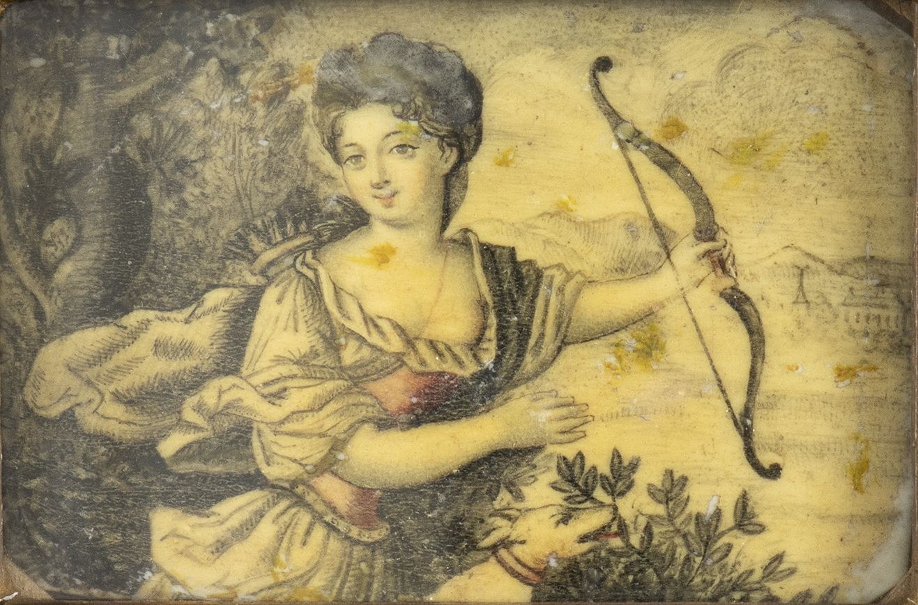 Miniature on bone representing 'Diana the Huntress' - 19th century, painting with a close-up of 'Diana the Huntress' made with bone carvings. Height x width 5 x 8 cm. Height x width frame 13 x 15 cm. Item condition grading: **** good.