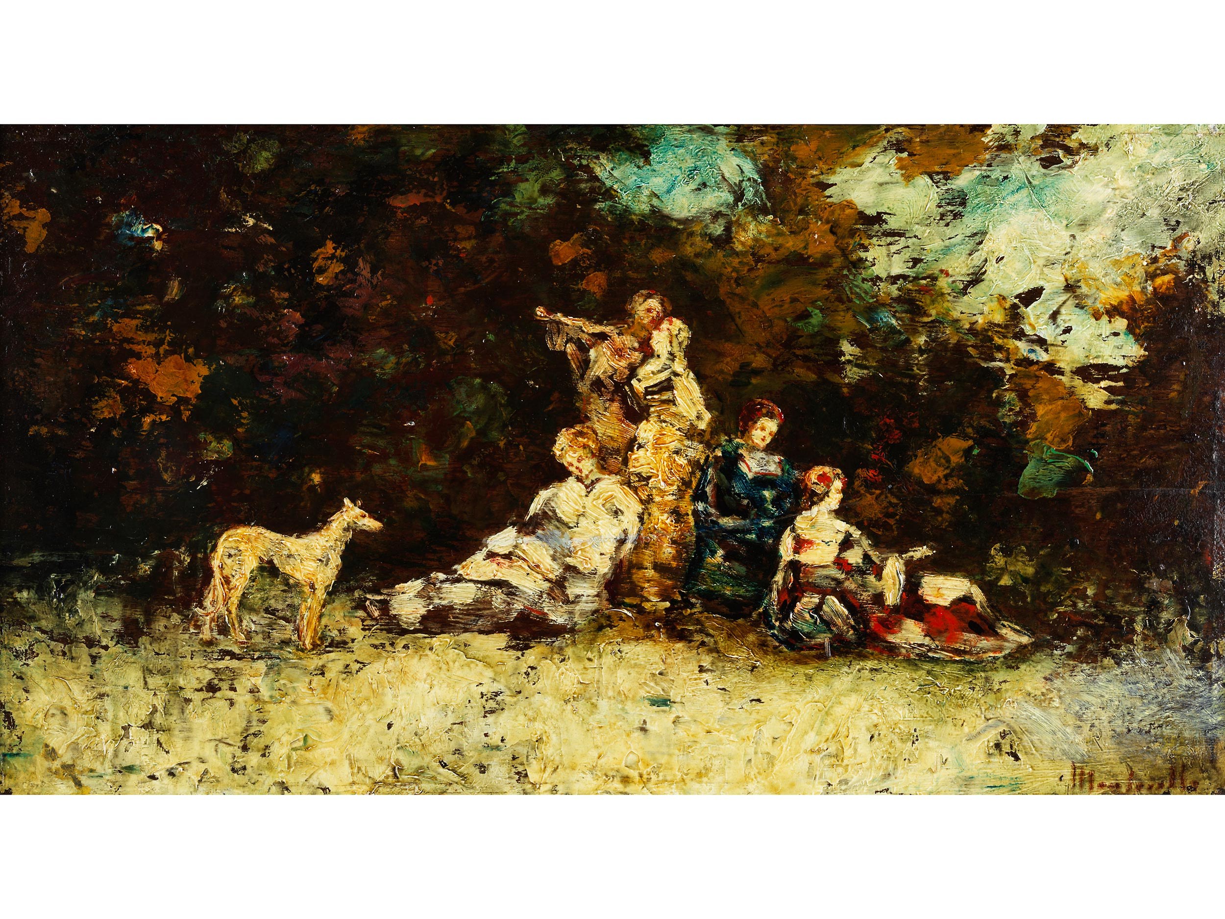Das vorliegende Gemälde zeigt in flottem Pinselduktus eine Komposition, wie sie typisch für Monticelli ist, nämlich auf einer dicht gemaserten Holzplatte. Besonders die parkähnliche Kulisse mit seiner zentralen Galanten Szene, bei der er sich von Jean-Antoine Watteau (1684-1721) hat inspirieren lassen, kann als Merkmal des bekannten Vorimpressionisten gelten.