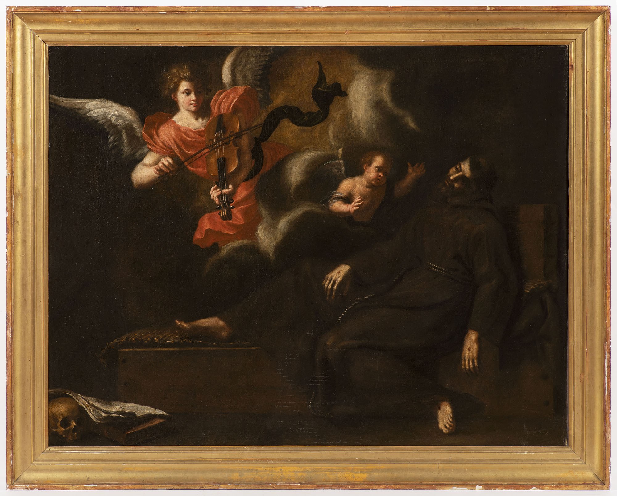 The saint of the order, identified by his wounds, is depicted in a sleeping posture. According to legend, he had a vision in which an angel appeared to him with a violin. This depiction of legends can be found in many painters, especially from the 17th century. A famous painting by Giovanni Francesco Barbieri, known as Guercino, from around 1623, in which the painter shows the saint in ecstasy at this moment. Here the painter also shows an angel floating in the clouds to the left.