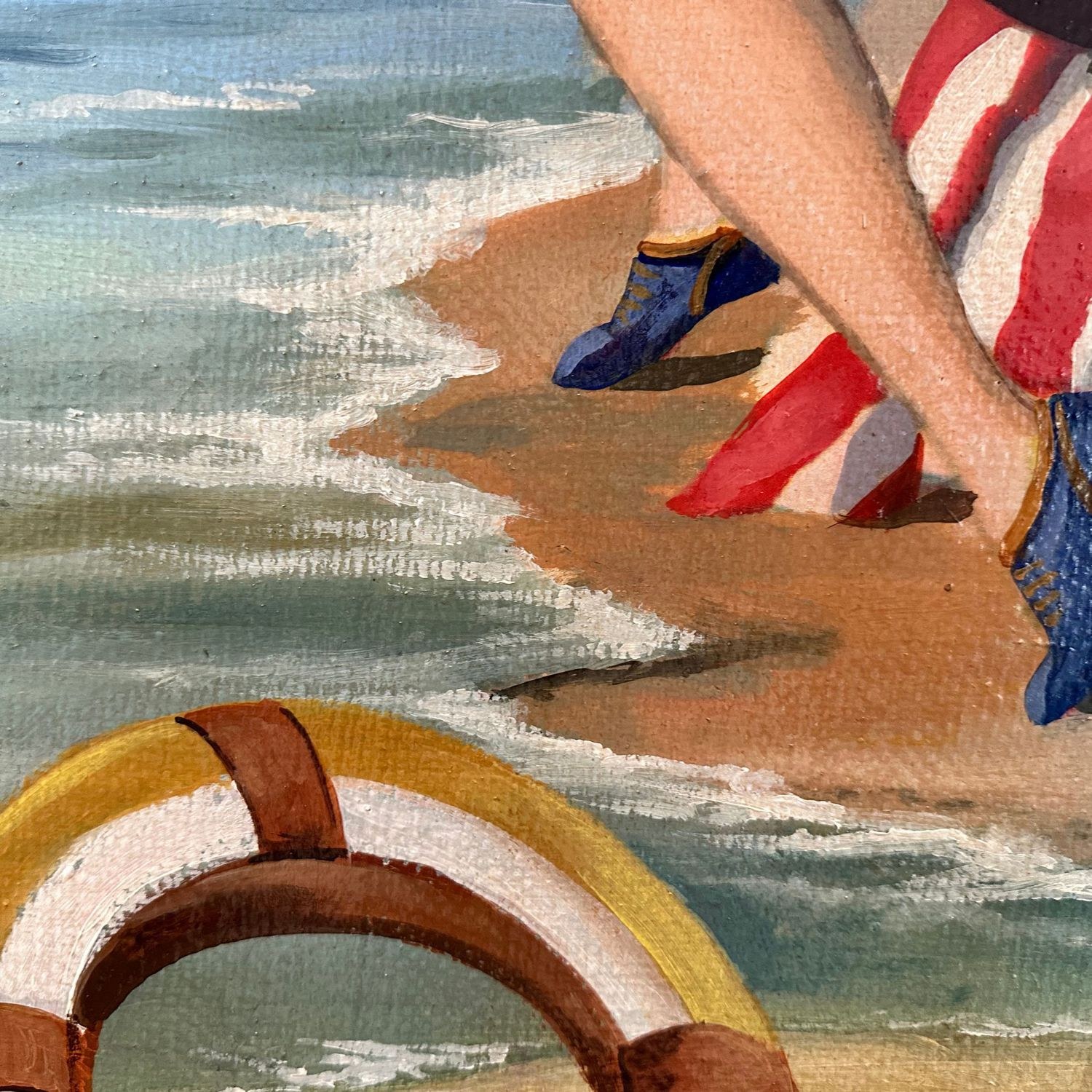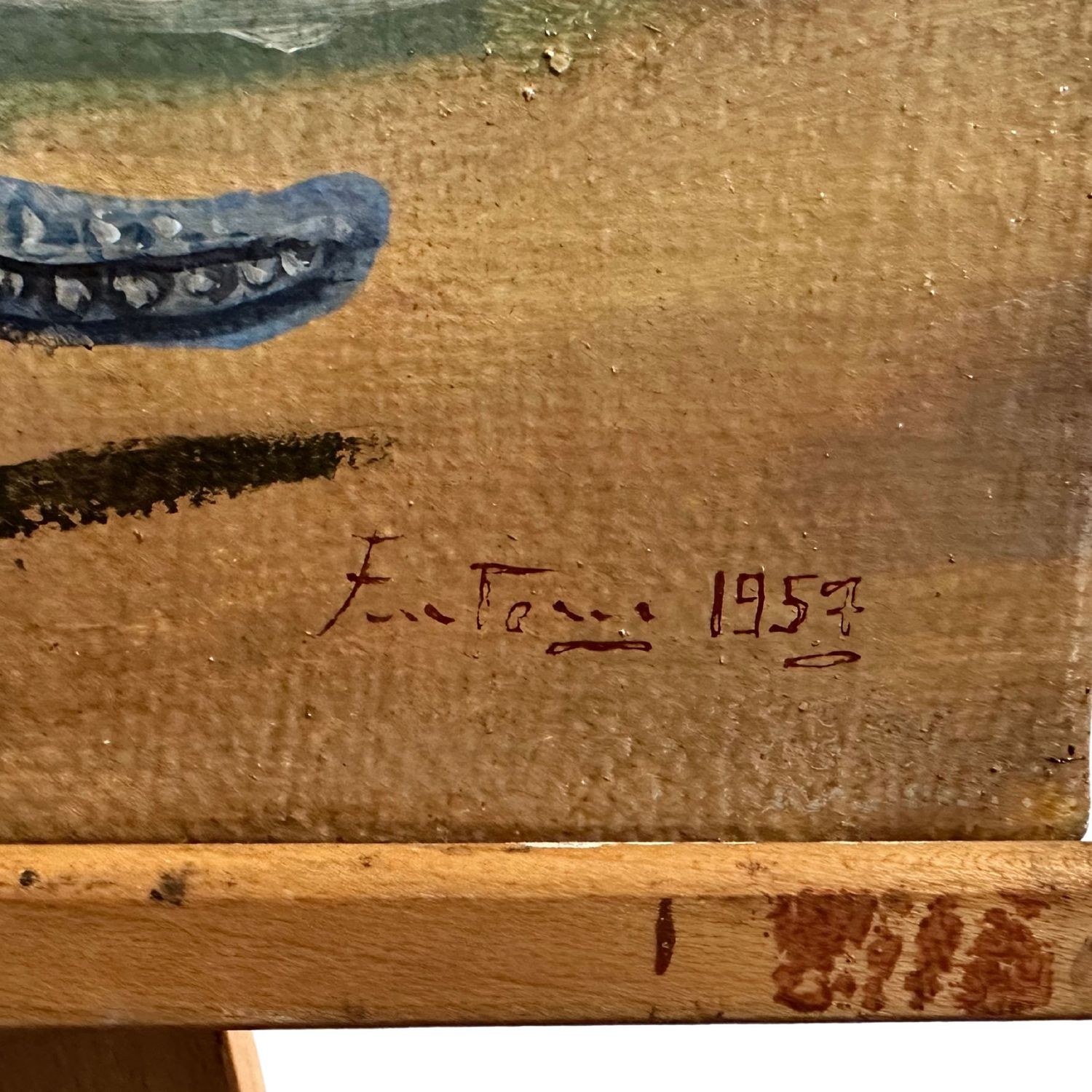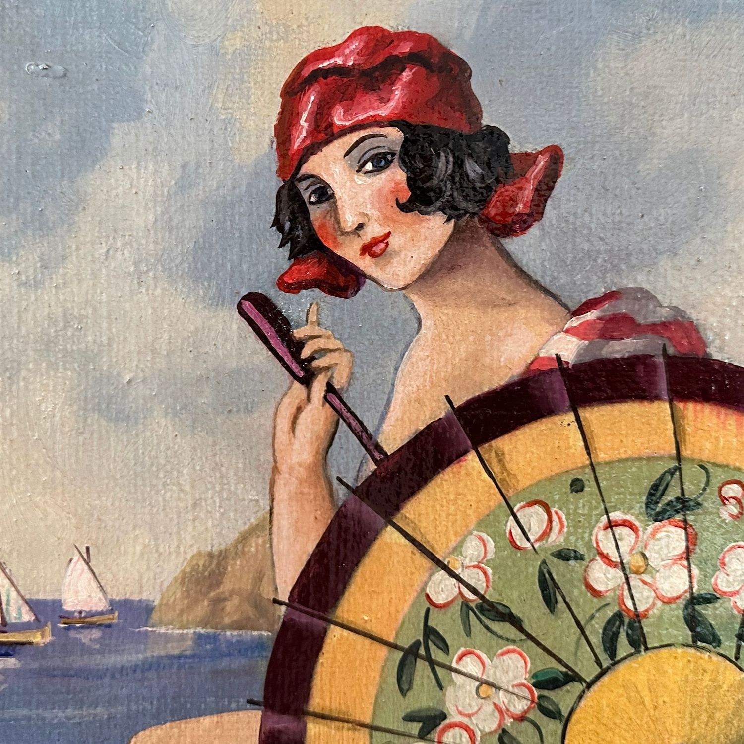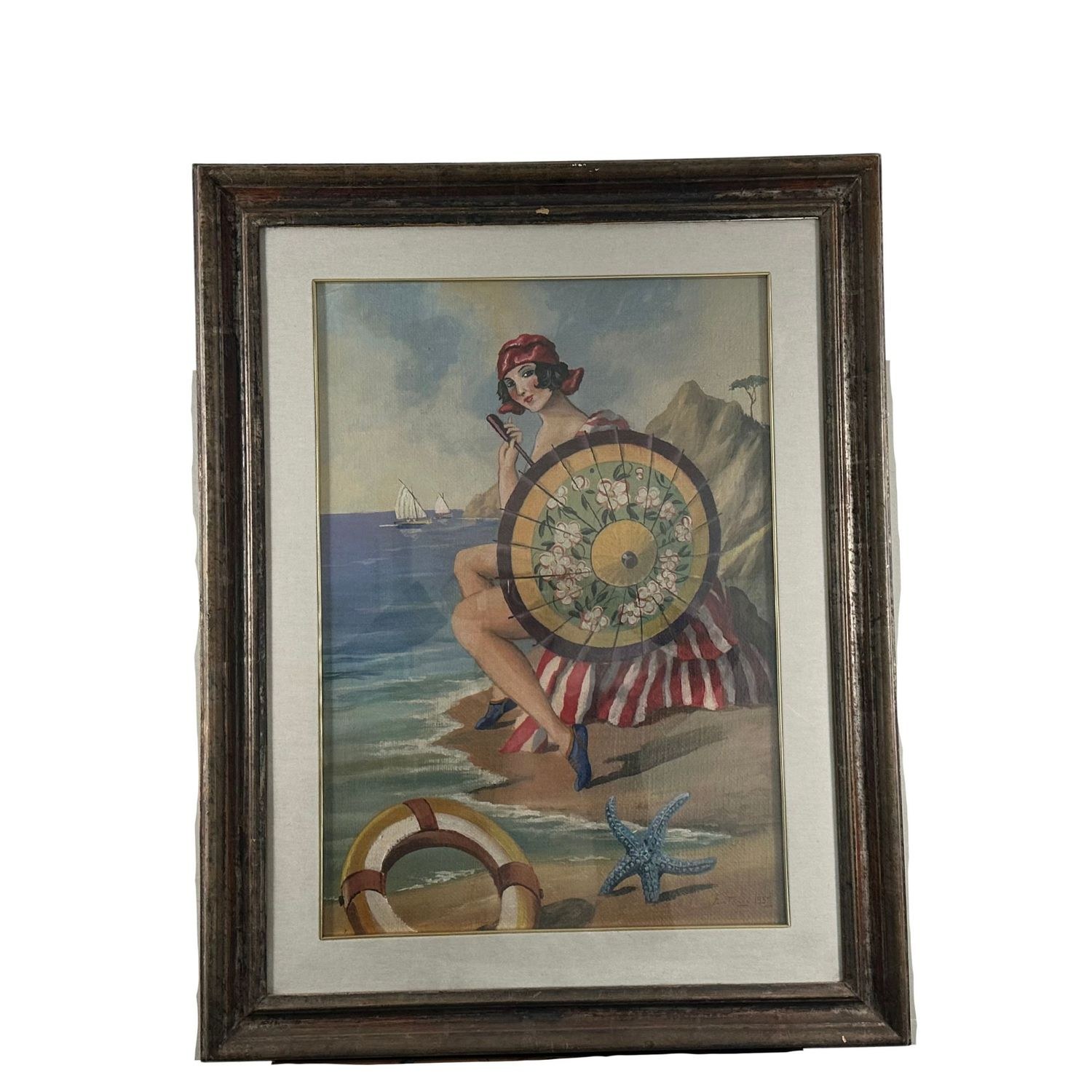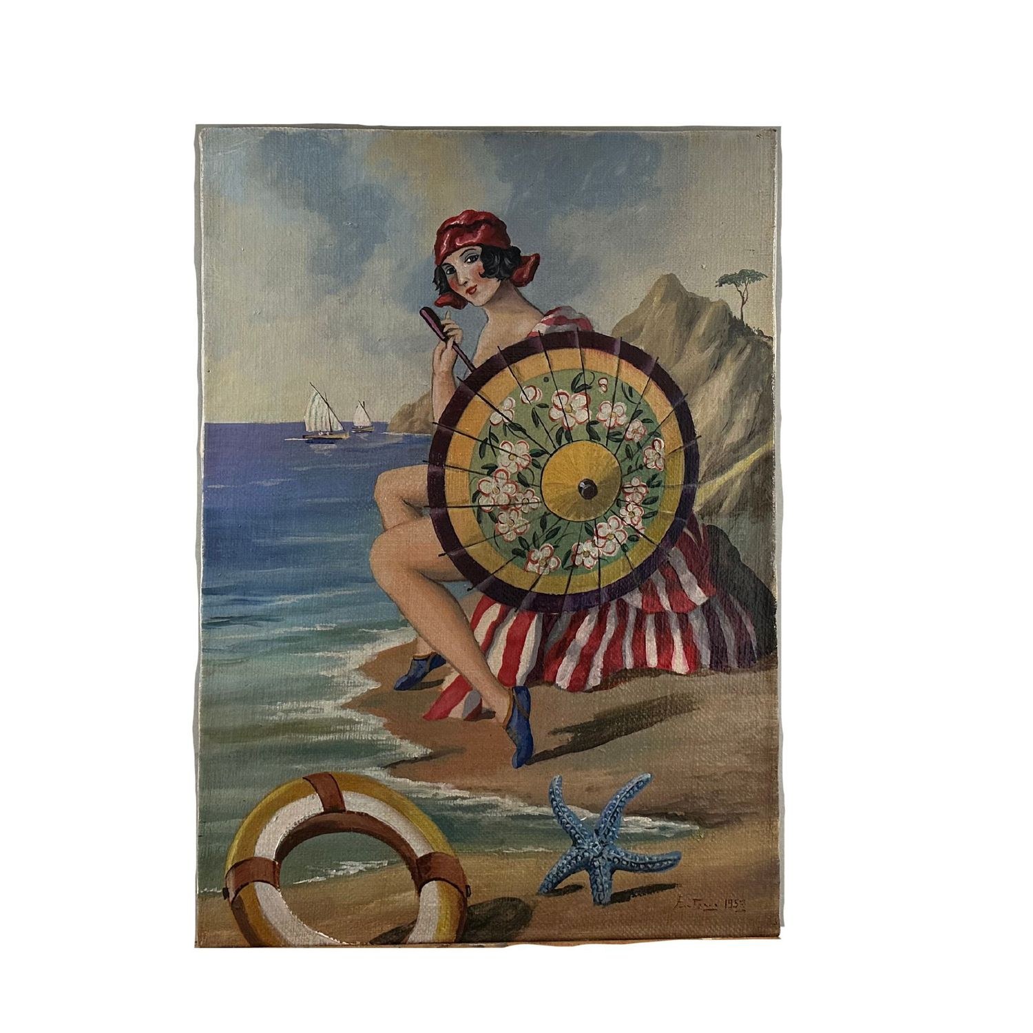 Oil painting on canvas, 1957, Italian school, depicting a woman with a parasol by the seaside. Dimensions: Including frame: 73x94 cm (Defects and deficiencies). Frame interior: 50x70 cm. Signed by an unidentified artist.