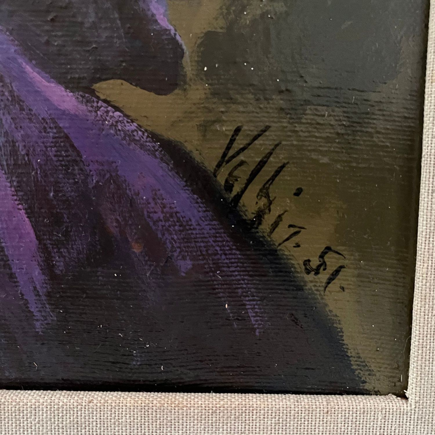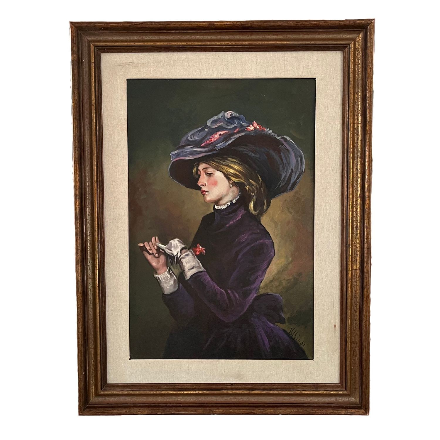 Oil painting on canvas, 1951, European school, depicting Elegant Woman. Inside frame dimensions: 60x40 cm. Signature at the bottom right by an unidentified artist.