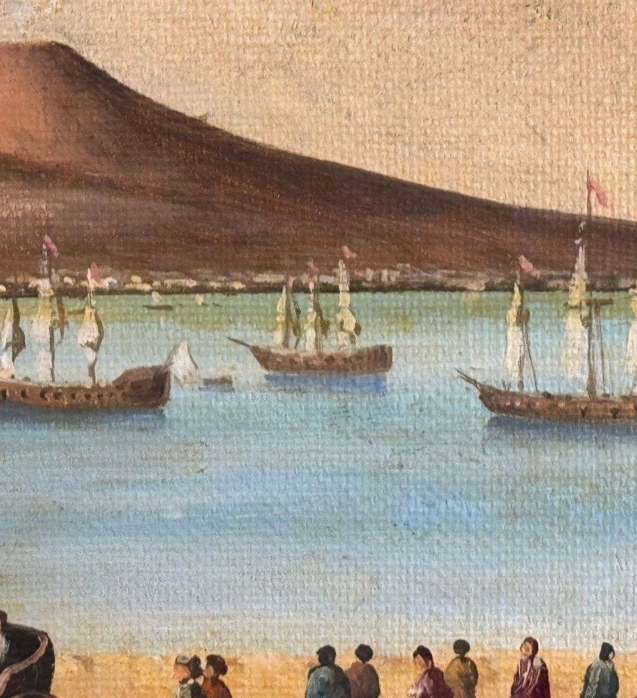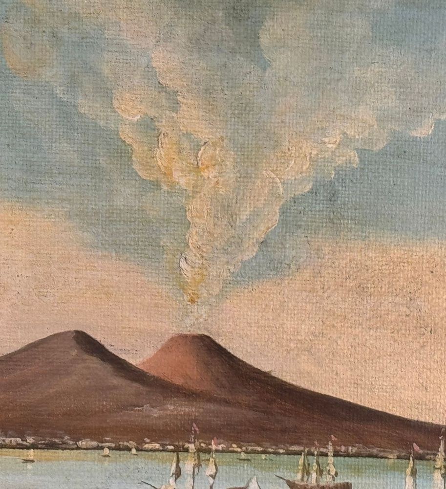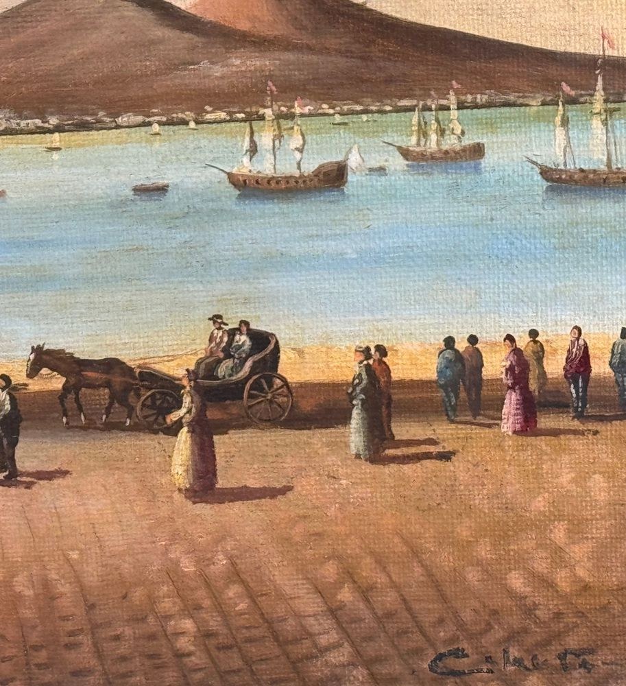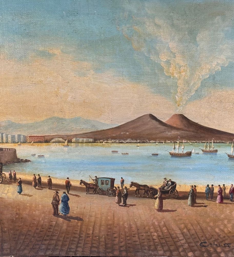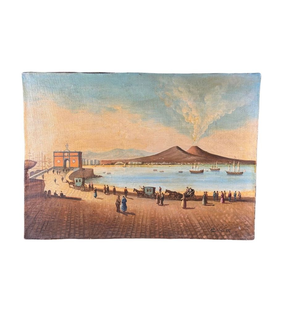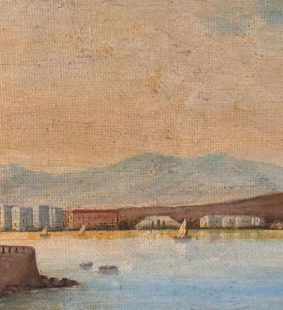 Oil painting on canvas applied to an old frame, 20th century, Italian school, depicting Naples from Mergellina. Dimensions: 70x50 cm. Signed at the bottom right by an unidentified artist. The artwork is in good condition, with slight signs of wear as shown in the attached photos.
