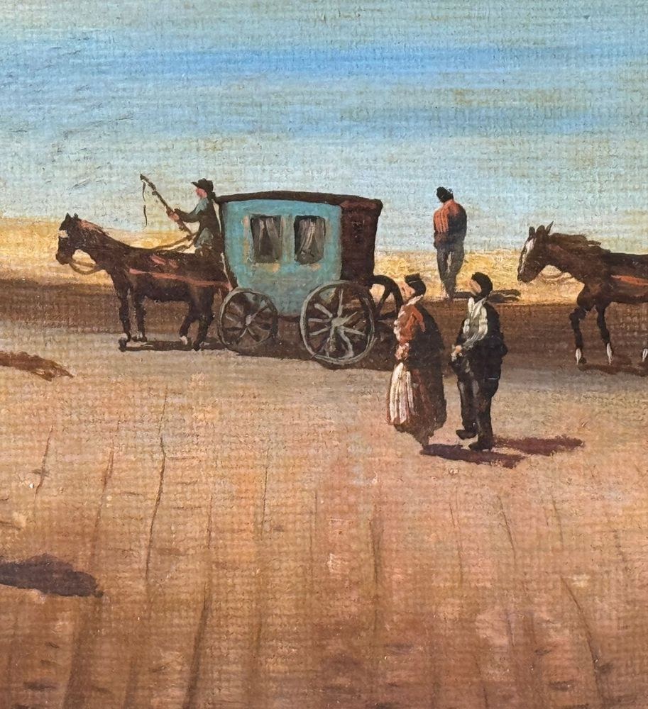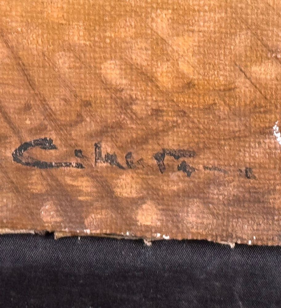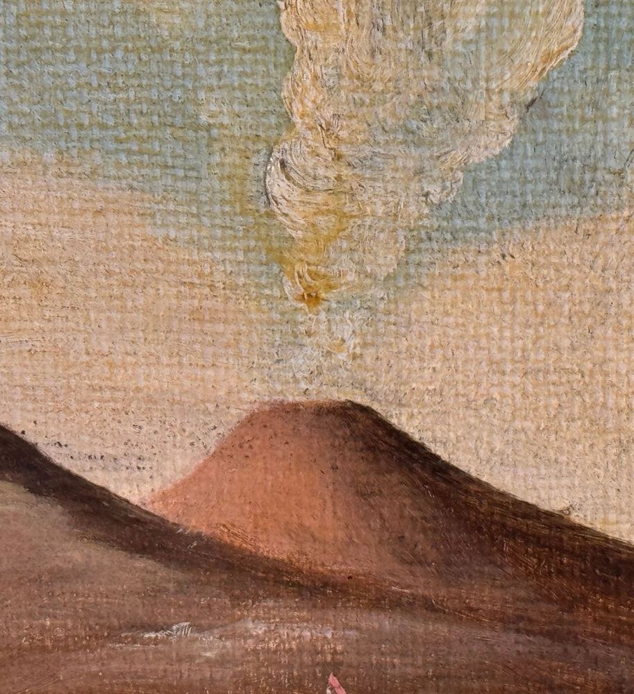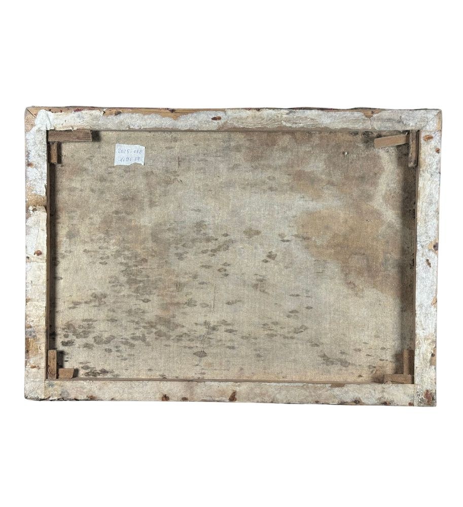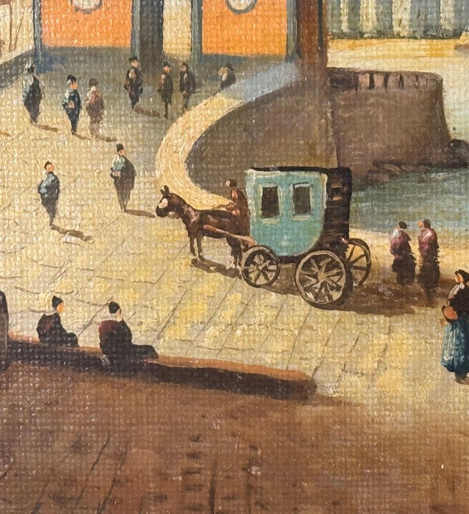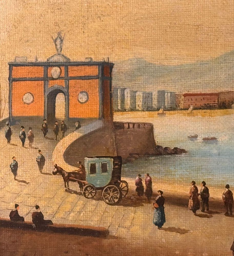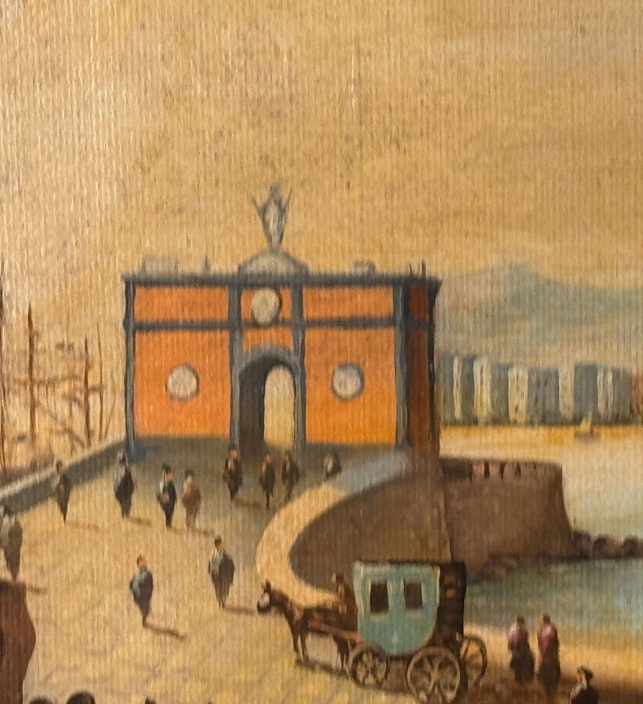 Oil painting on canvas applied to an old frame, 20th century, Italian school, depicting Naples from Mergellina. Dimensions: 70x50 cm. Signed at the bottom right by an unidentified artist. The artwork is in good condition, with slight signs of wear as shown in the attached photos.