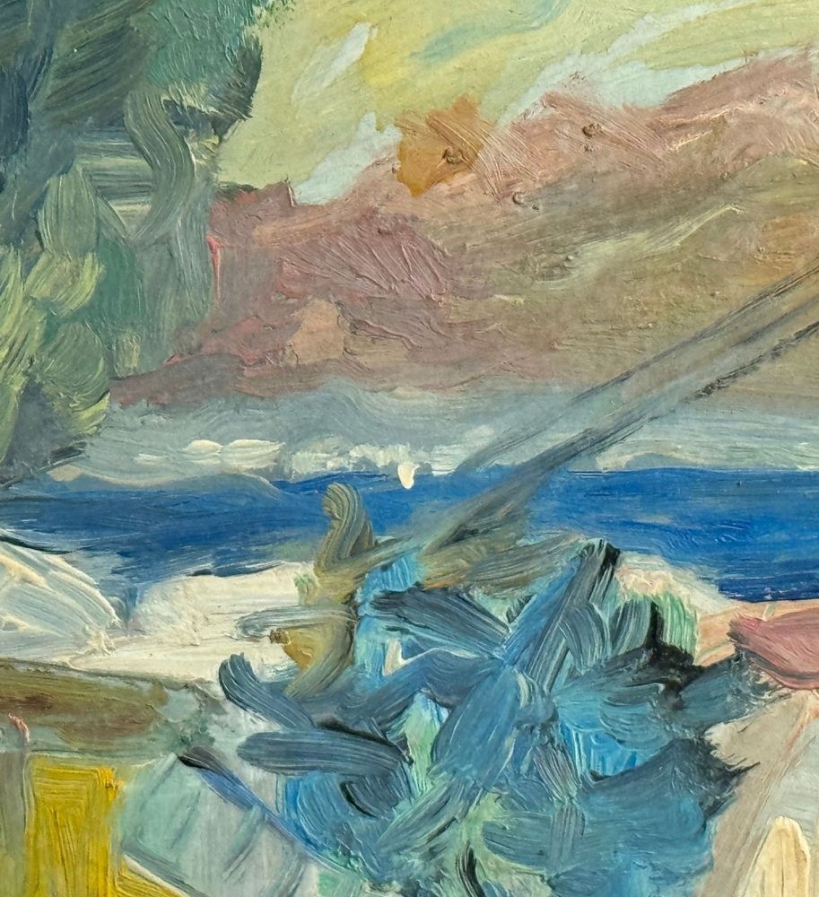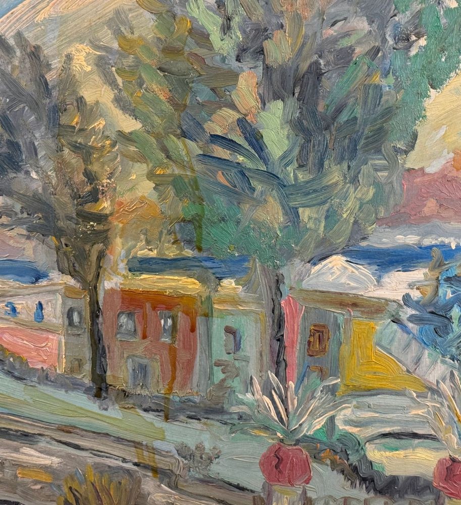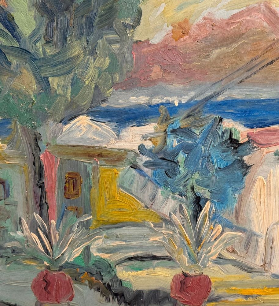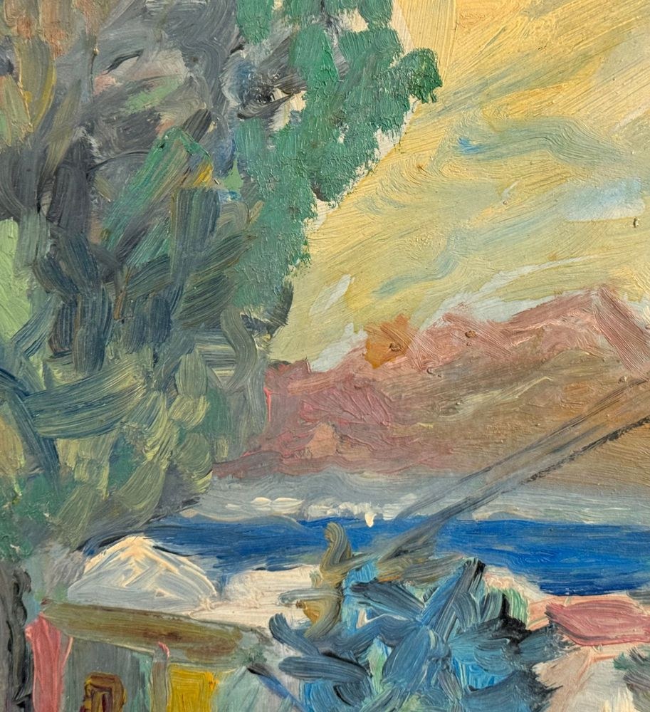 Oil painting on panel, 20th-century Italian school, depicting a Coastal Road. Dimensions: 51x38.5 cm. Signed at the bottom right by an unidentified artist. The artwork is in good condition, with slight signs of wear as shown in the attached photos.