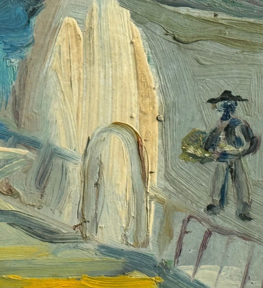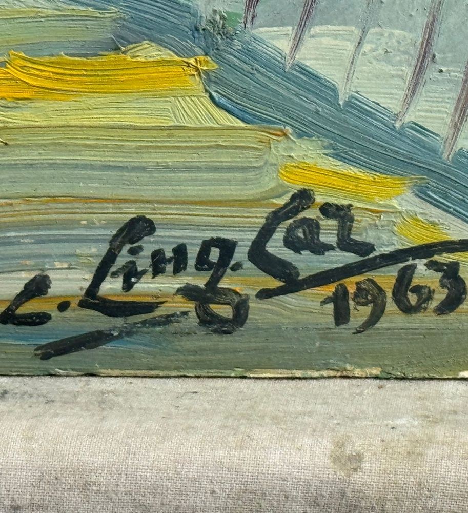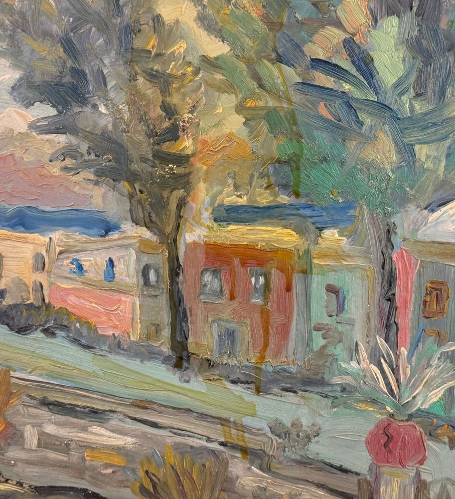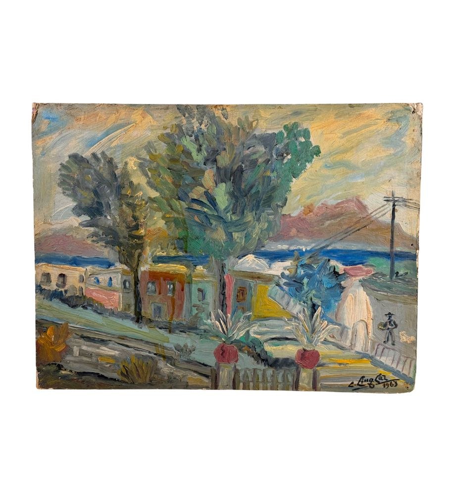 Oil painting on panel, 20th-century Italian school, depicting a Coastal Road. Dimensions: 51x38.5 cm. Signed at the bottom right by an unidentified artist. The artwork is in good condition, with slight signs of wear as shown in the attached photos.