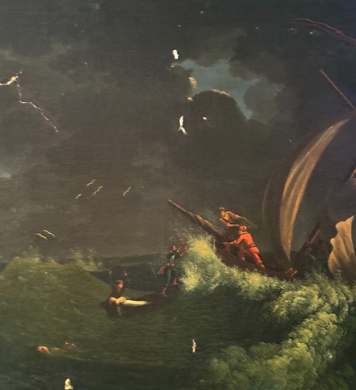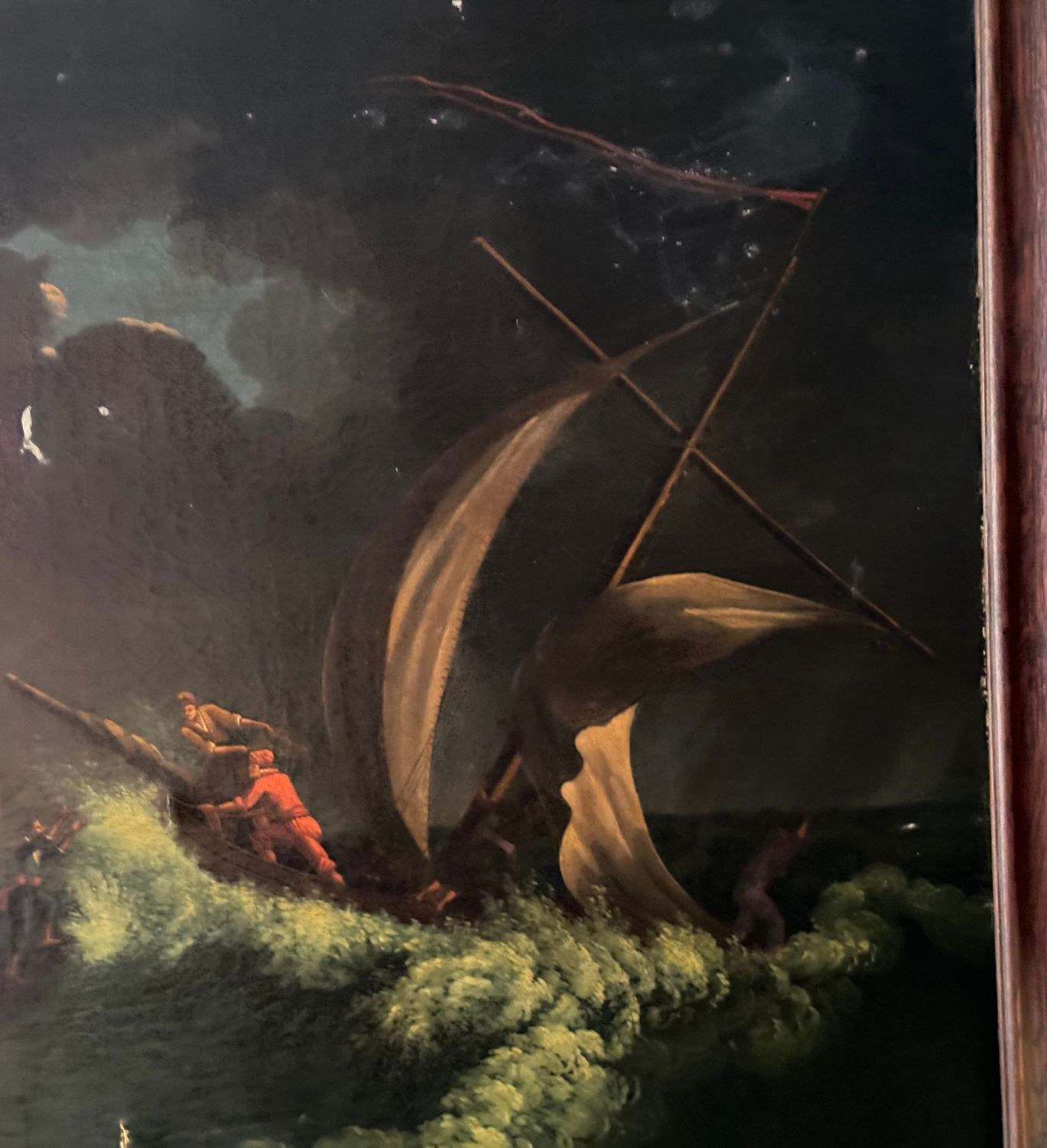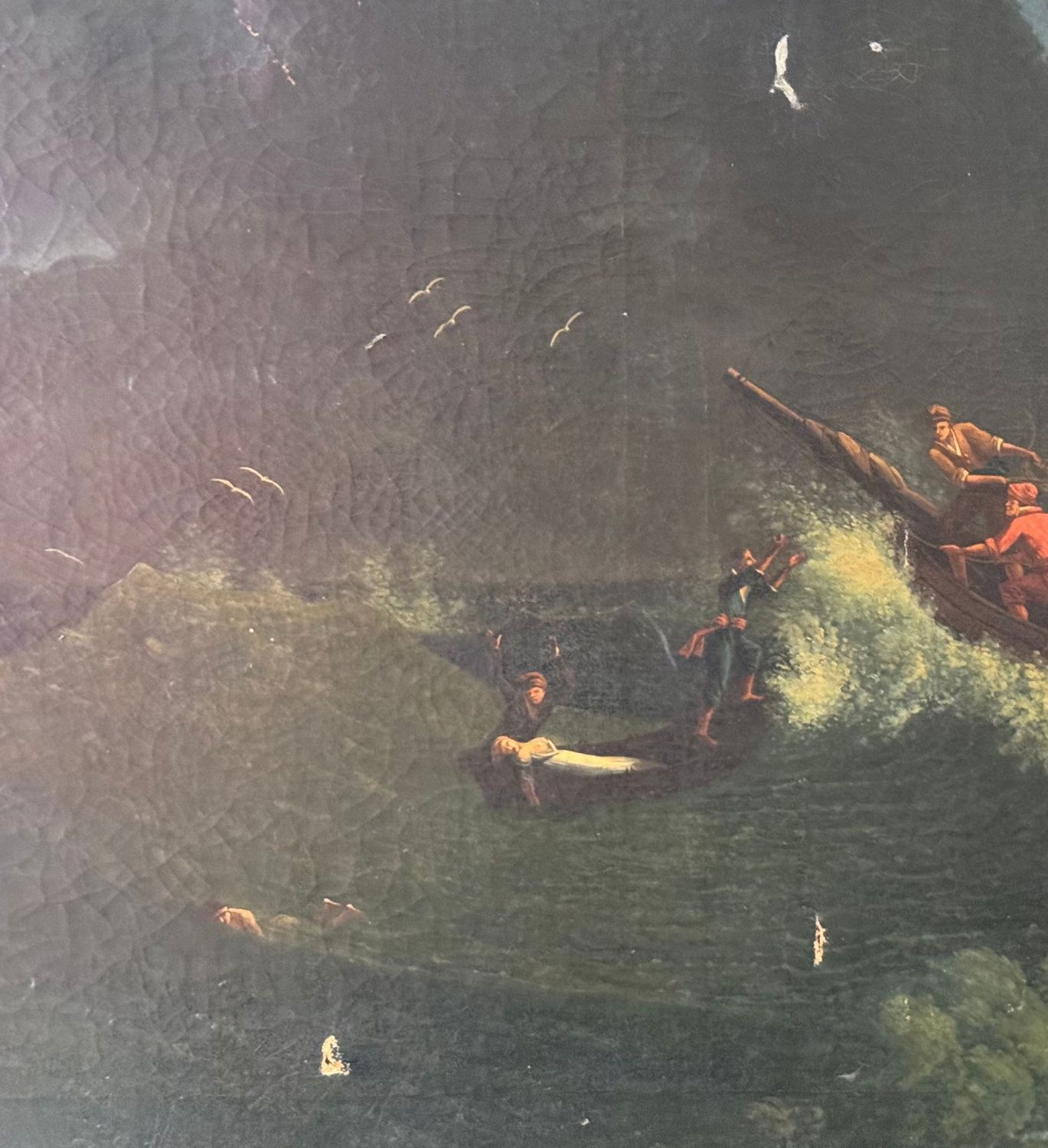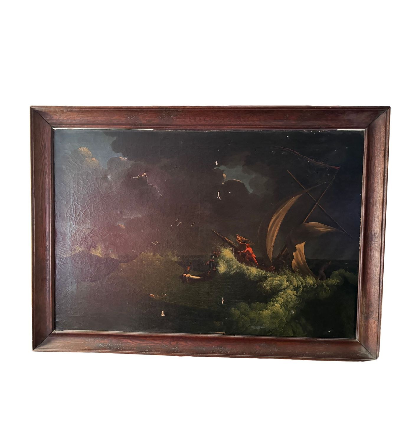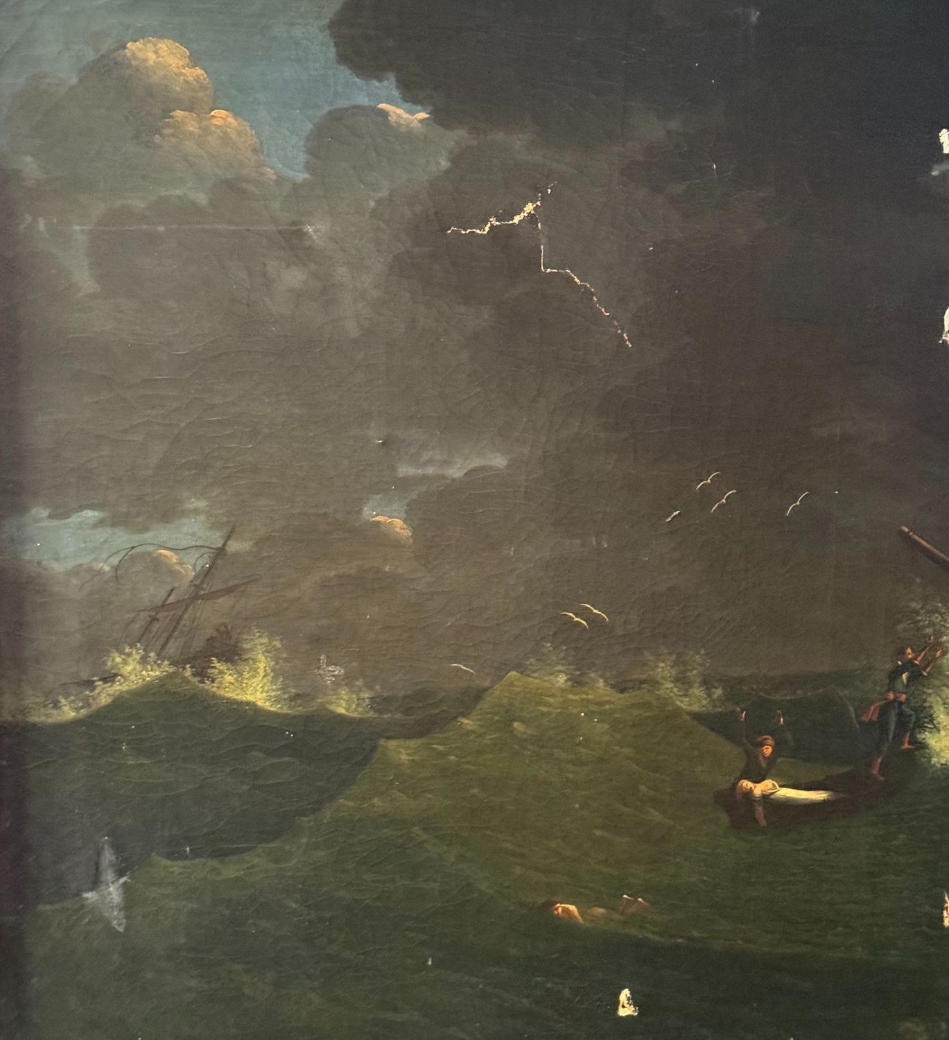 Oil painting on canvas, 19th-century Italian school, depicting a stormy sea. Dimensions including the frame: 96x136 cm. Inner frame dimensions: 81x120 cm. By an anonymous artist. The artwork is in fair condition, with a noticeable tear in the upper part of the canvas and small areas of color loss, as shown in the attached photos.