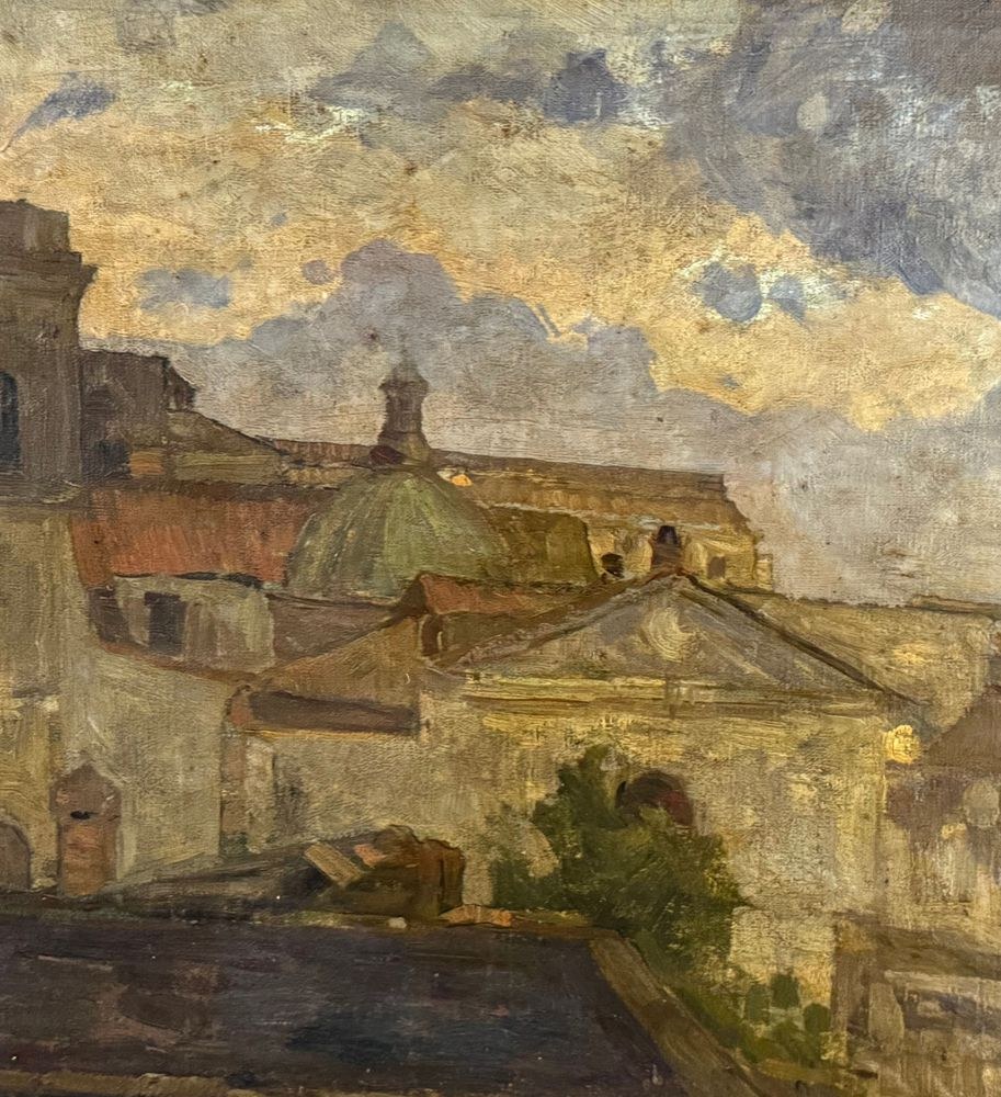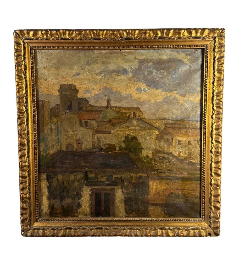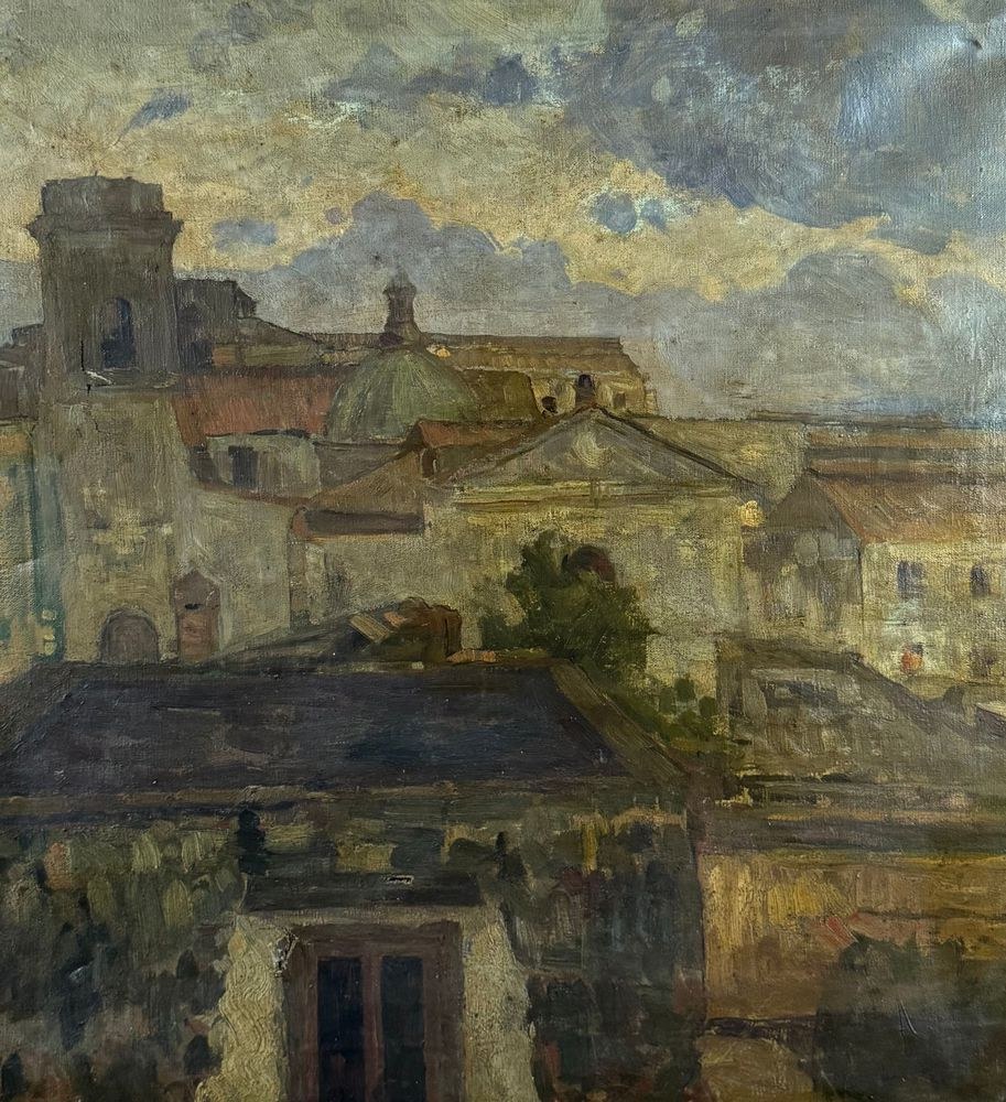 Oil painting on canvas, early 20th-century Italian school, depicting a view of Naples. Dimensions including the frame: 70x72 cm. Inner frame dimensions: 60x60 cm. By an anonymous artist. The artwork is in fair condition, as shown in the attached photos.