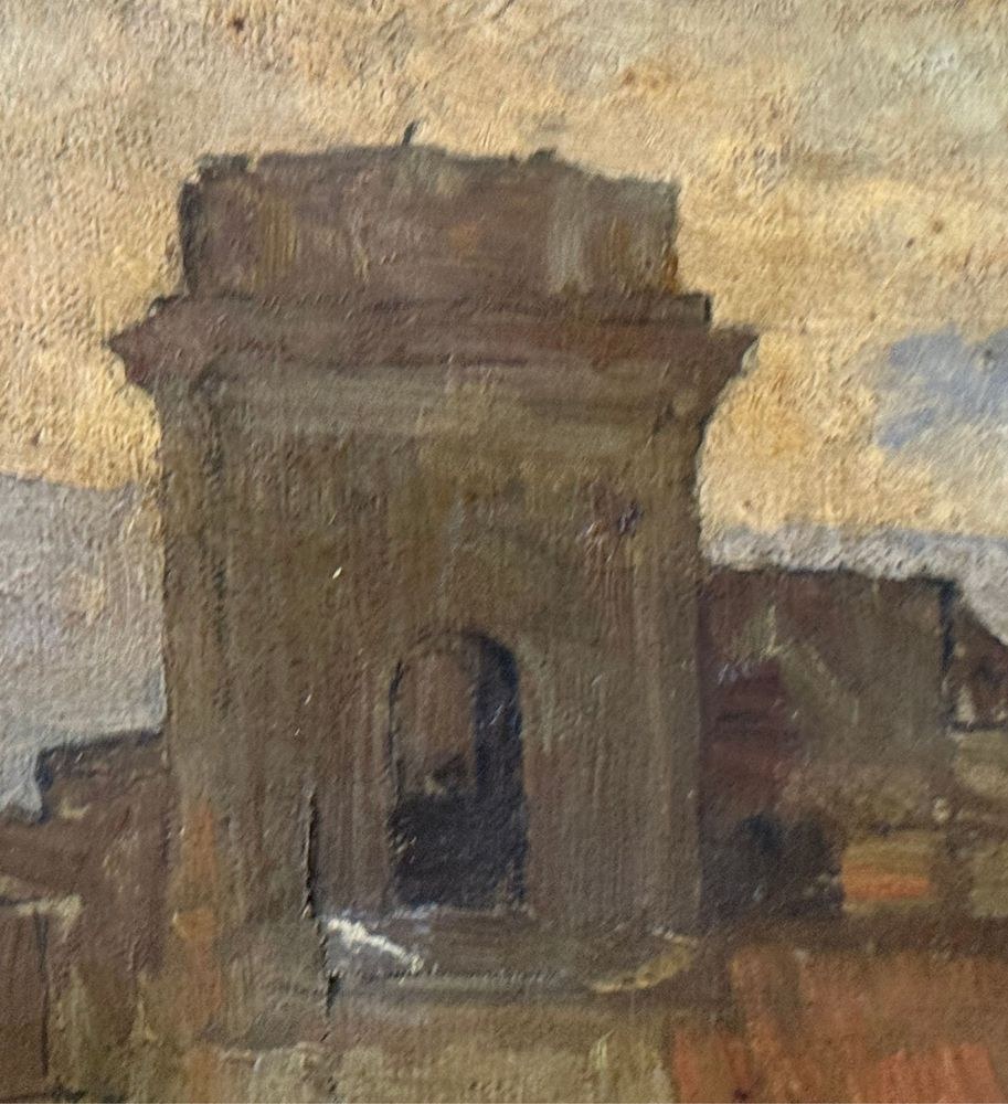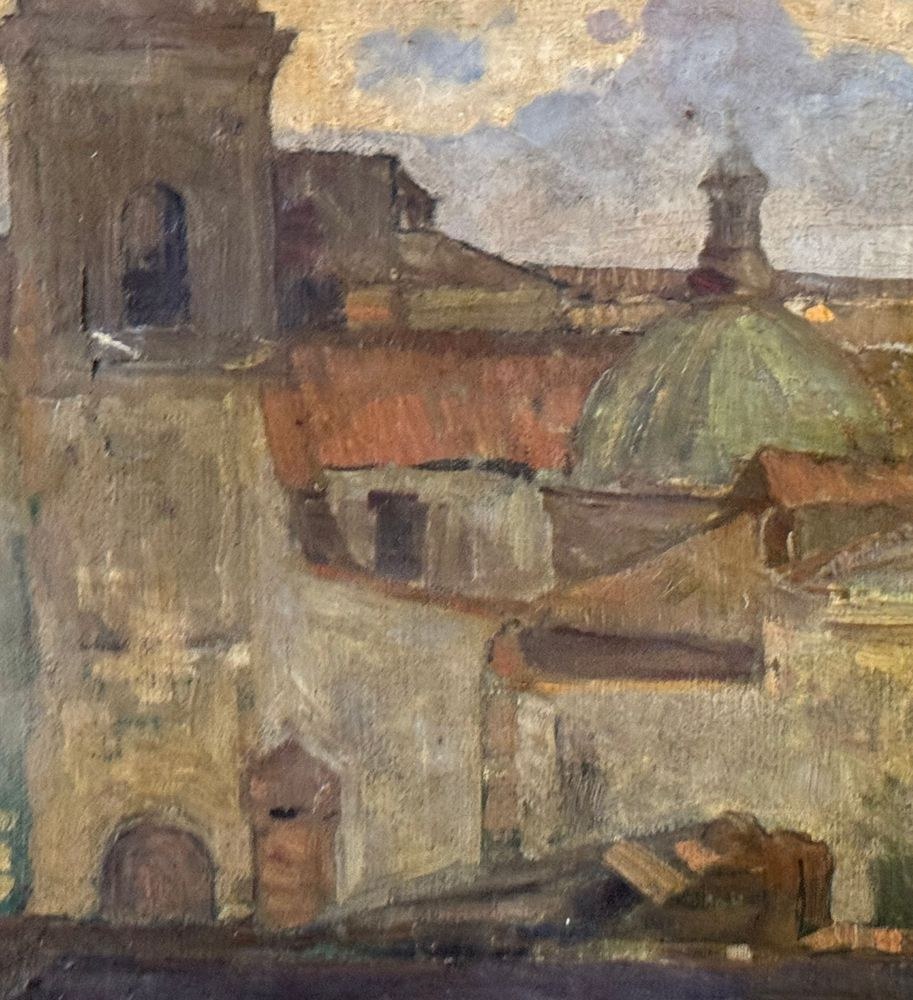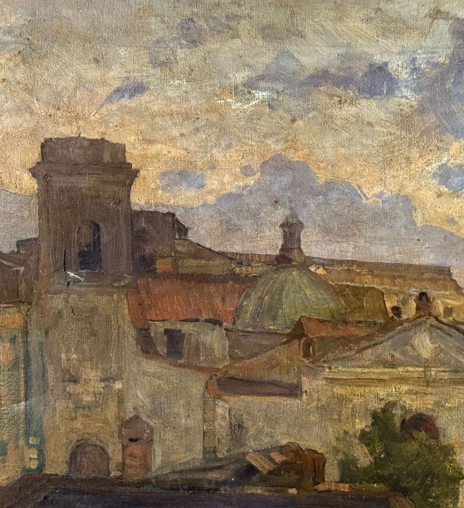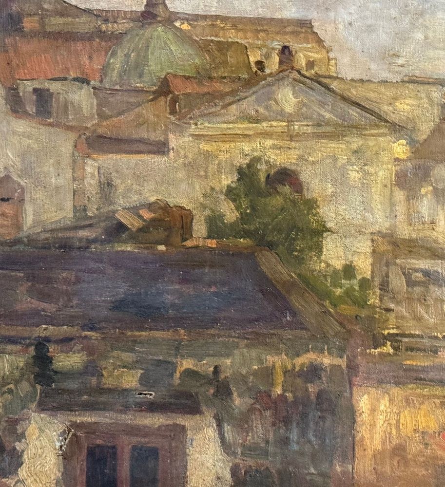 Oil painting on canvas, early 20th-century Italian school, depicting a view of Naples. Dimensions including the frame: 70x72 cm. Inner frame dimensions: 60x60 cm. By an anonymous artist. The artwork is in fair condition, as shown in the attached photos.