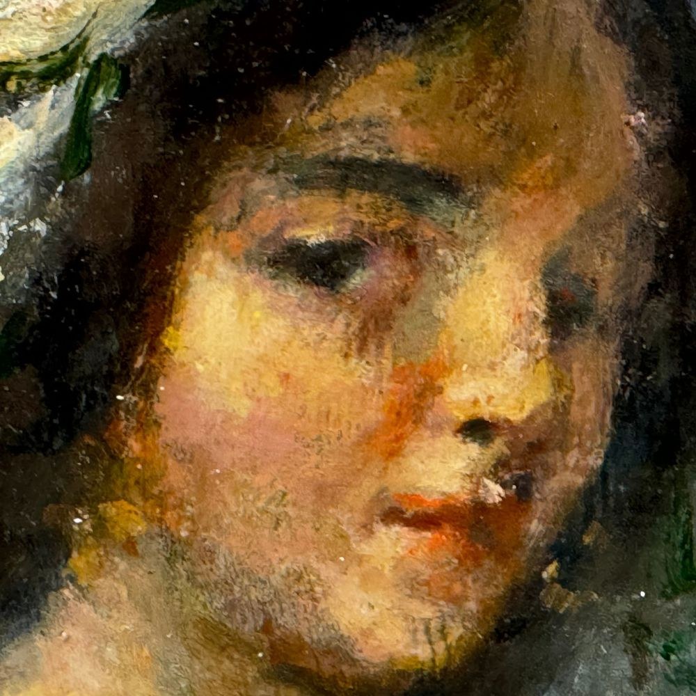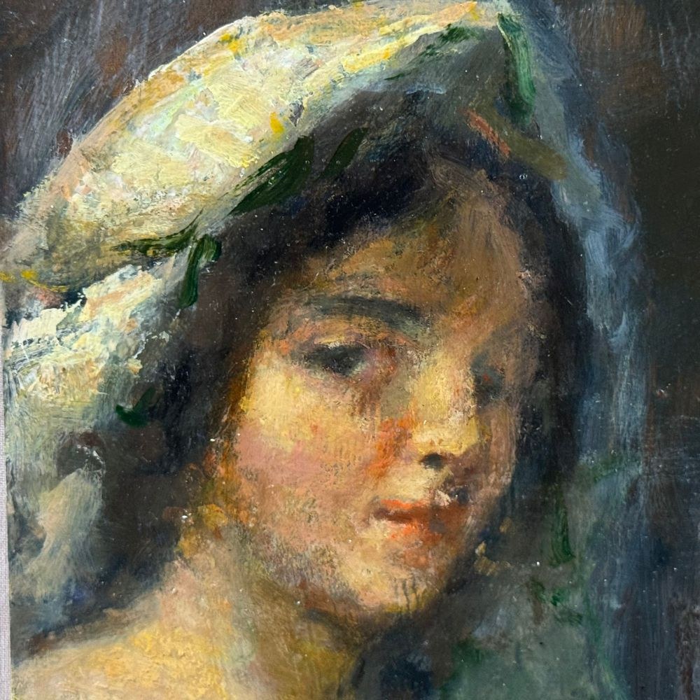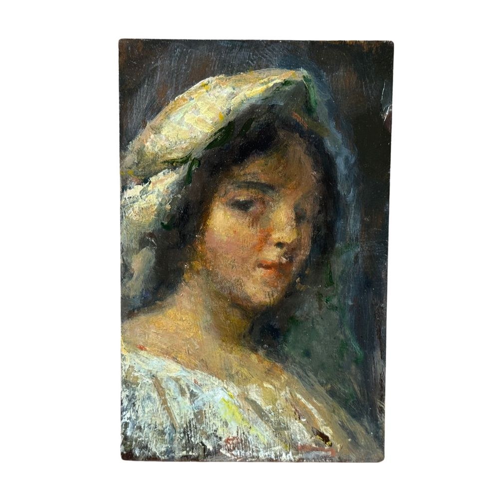 Oil painting on board, 20th century Italian school, depicting a portrait of a woman in the Impressionist style. Dimensions: 11.5x18 cm. By an anonymous artist. The artwork is in good condition with slight signs of wear as shown in the attached photos.