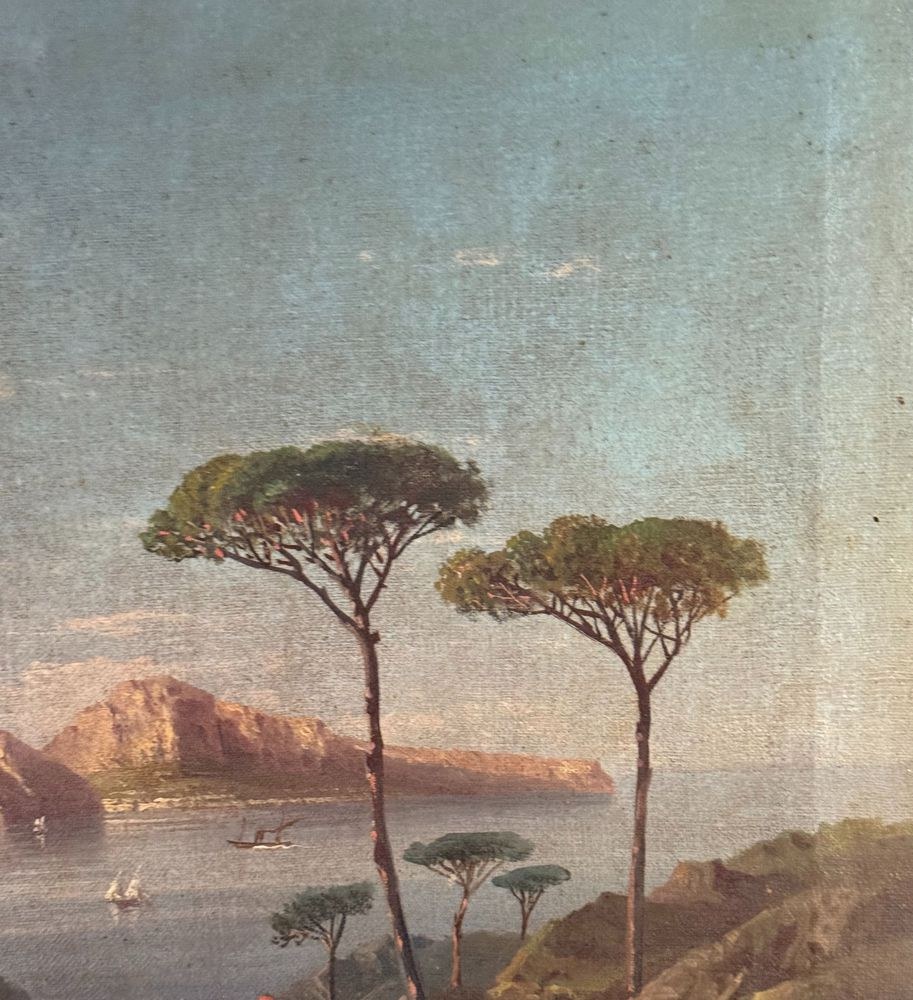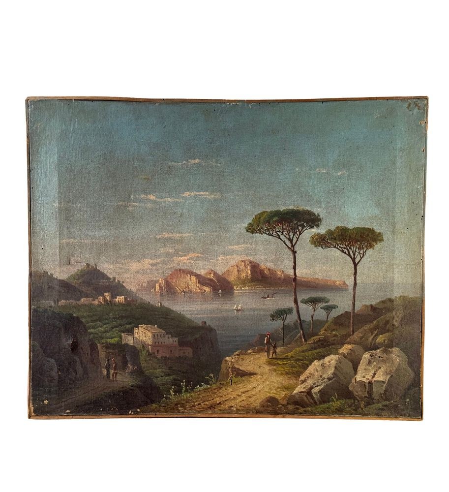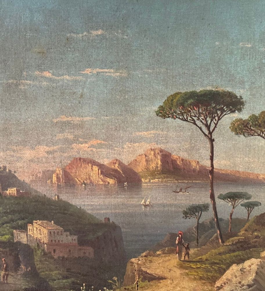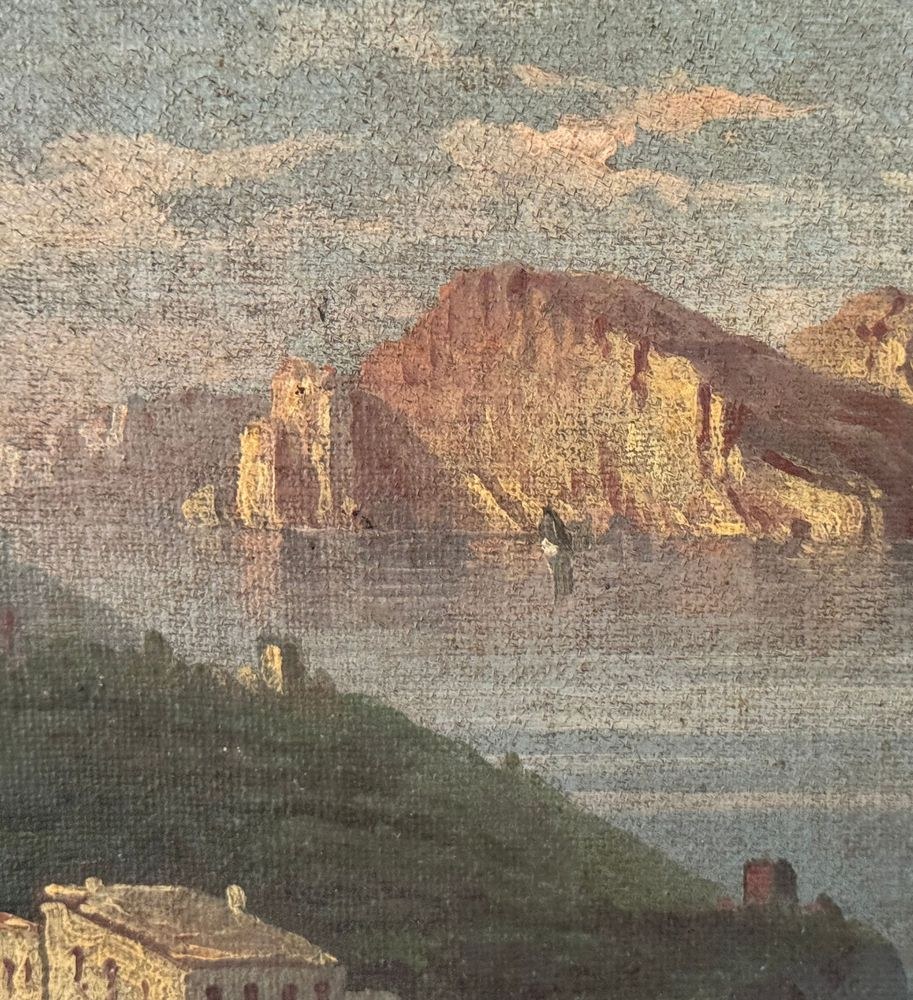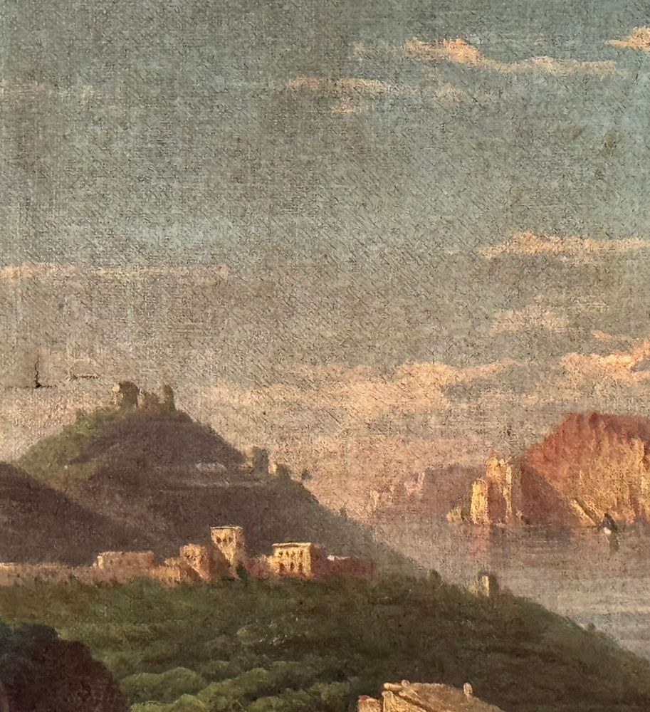 Oil painting on canvas, 19th century, Neapolitan school, depicting a view of Procida and Ischia. Dimensions: 63x51 cm. By an anonymous artist. The work is in fair condition.