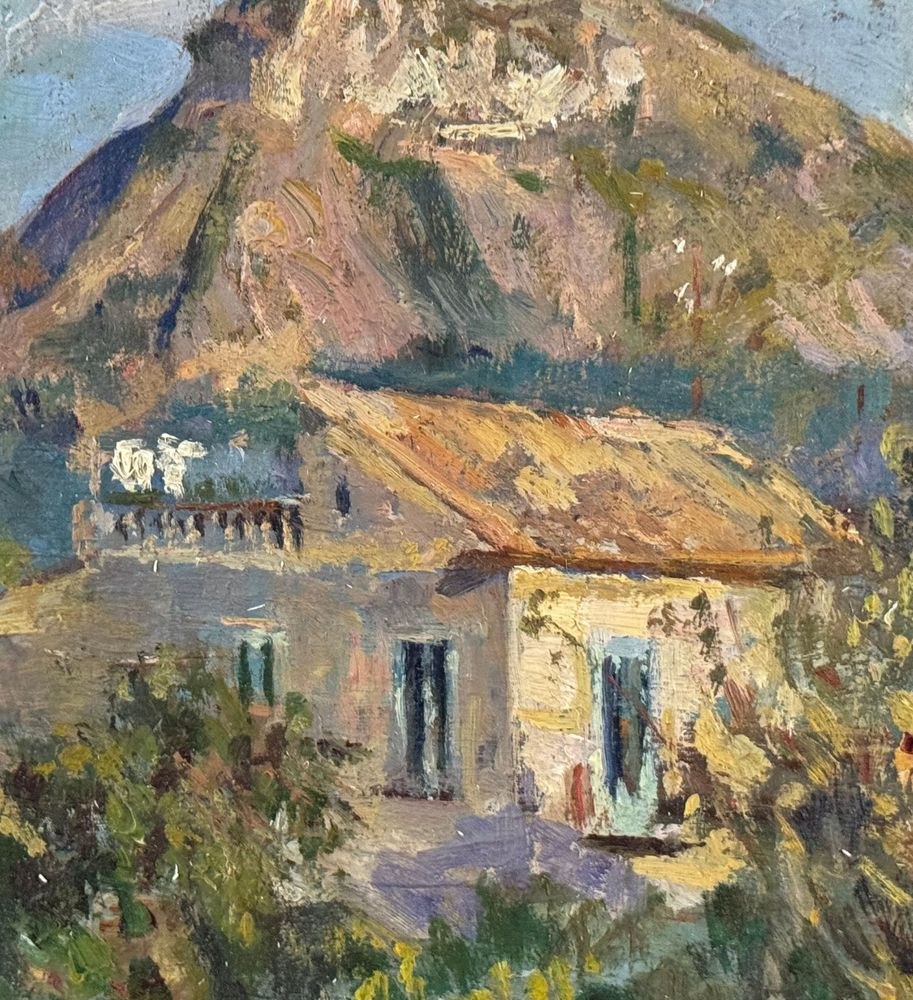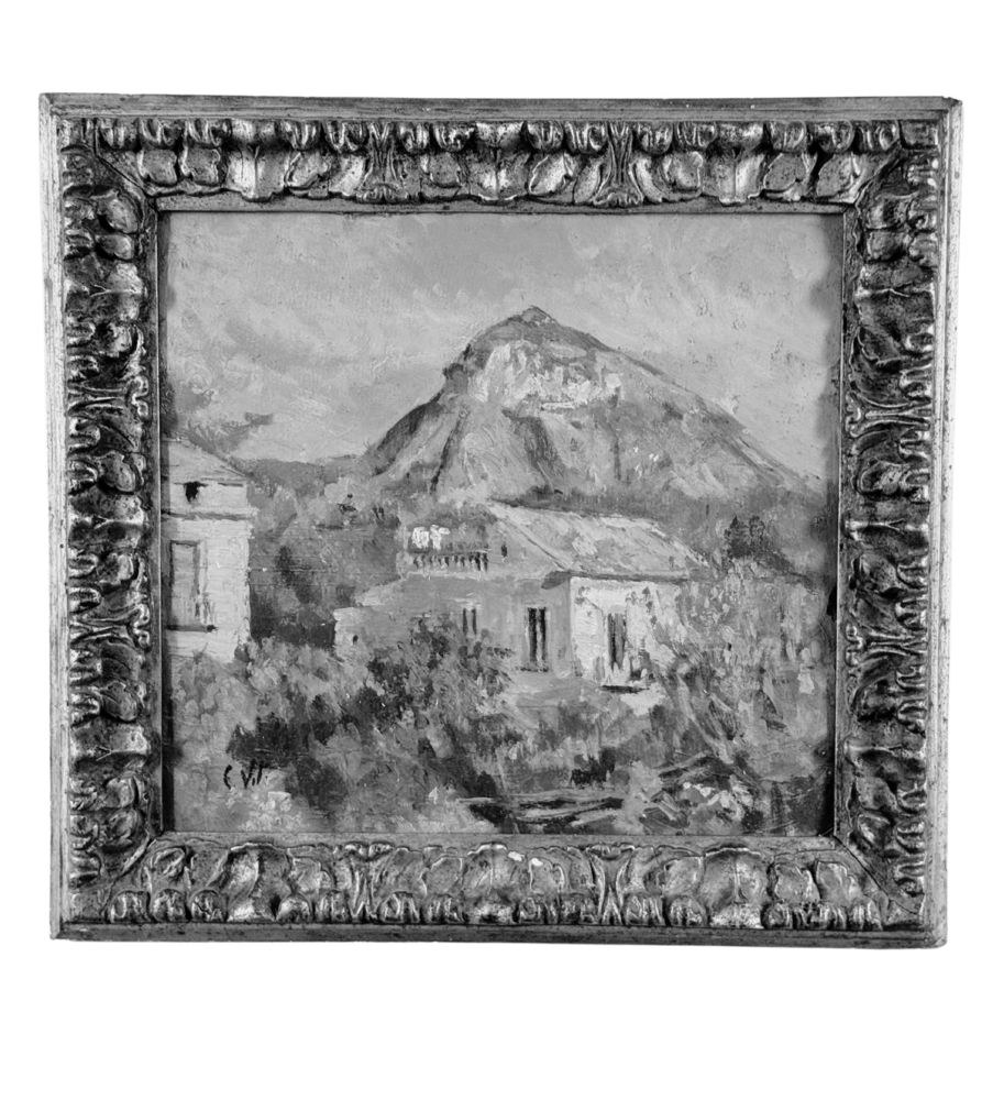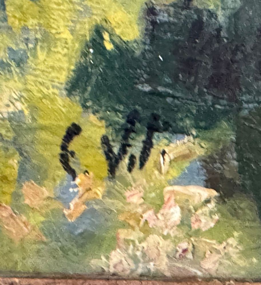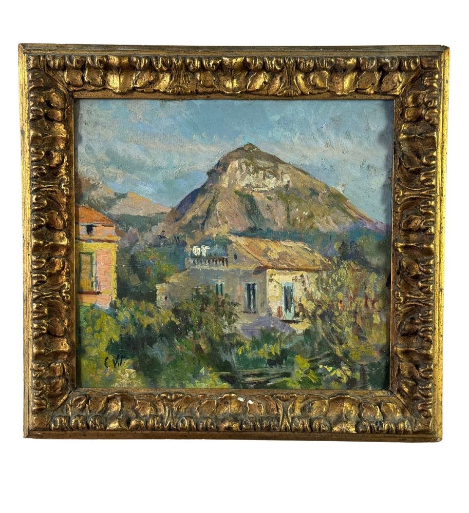 Oil painting on cardboard, early 20th century, Italian school, depicting a landscape. Dimensions including frame: 46x43 cm. Interior frame dimensions: 37x34 cm. Signed in the lower left by an unidentified artist. The work is in good condition.