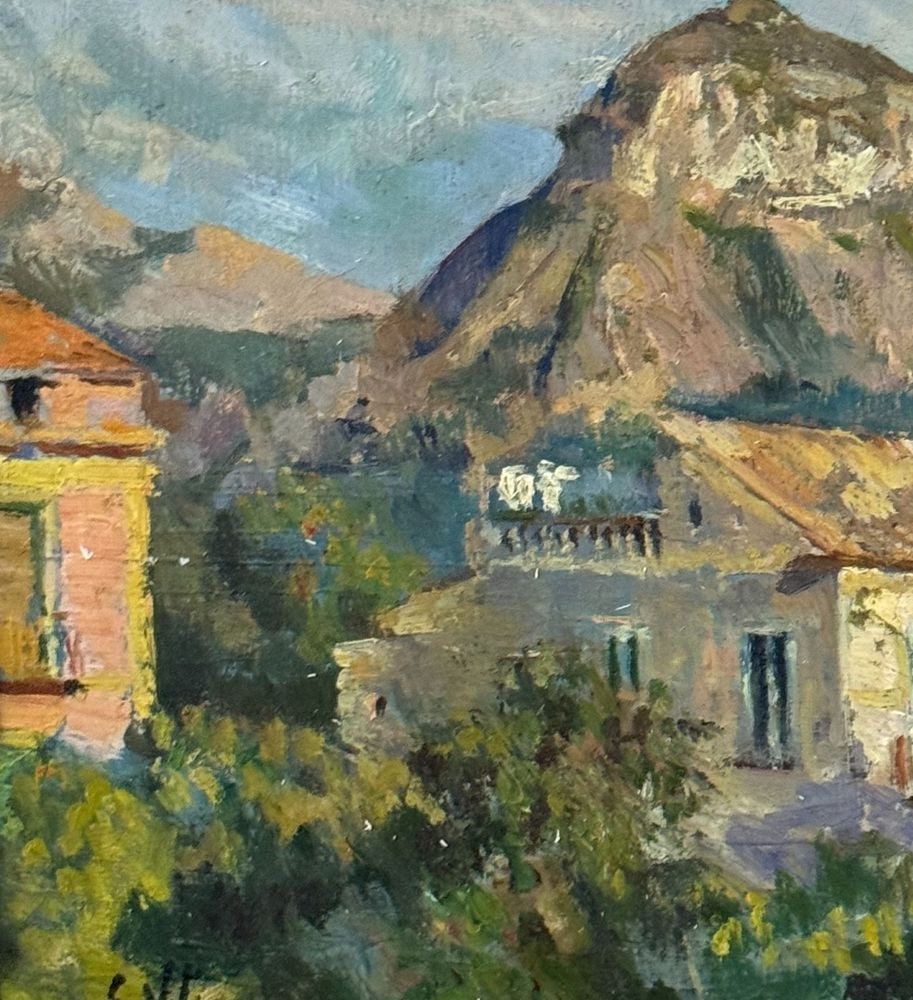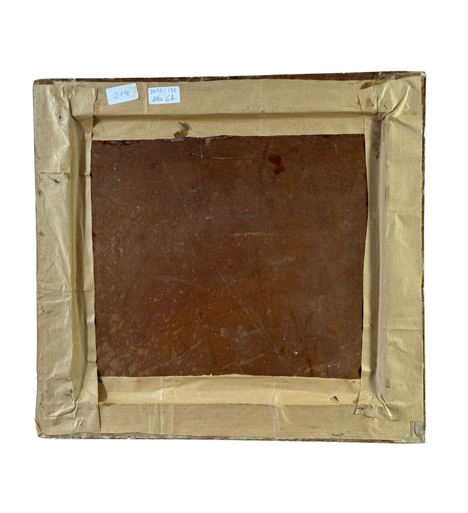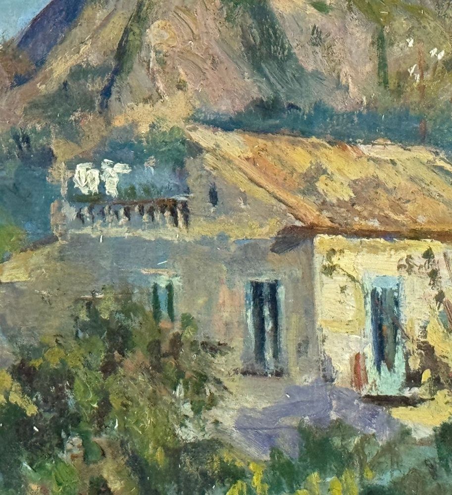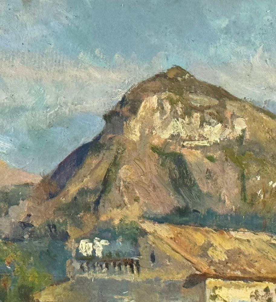 Oil painting on cardboard, early 20th century, Italian school, depicting a landscape. Dimensions including frame: 46x43 cm. Interior frame dimensions: 37x34 cm. Signed in the lower left by an unidentified artist. The work is in good condition.