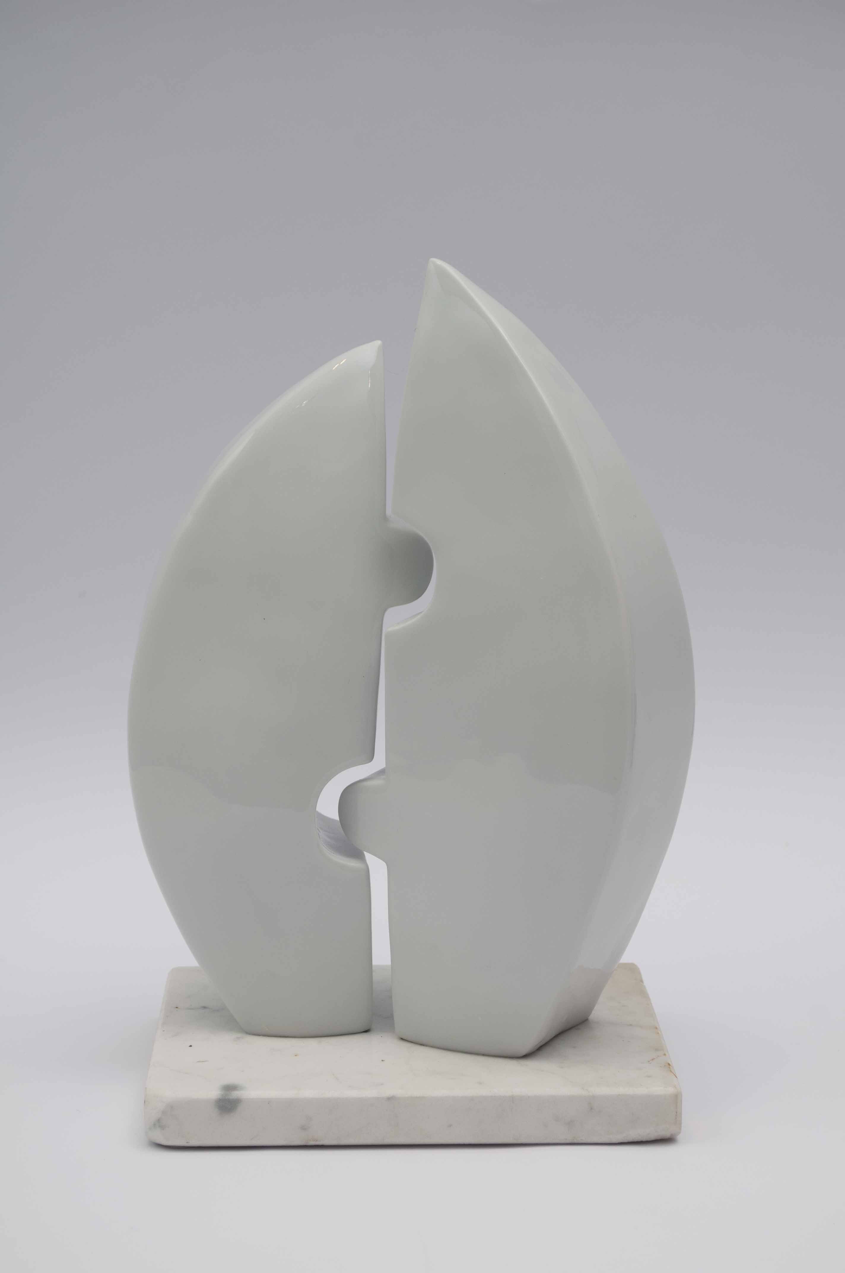 rzeźba ceramiczna; forma dwuelementowa wykonana z porcelany ćmielowskiej, szkliwiona, temp. wypału: 1370 st C, podstawa: marmur "biała marianna", wys. kompozycji : 27 cm, wys. z podstawą: 29 cm, szer: 21 cm, głębokosc z podstawą: 13,5 cm, sygn. na spodzie