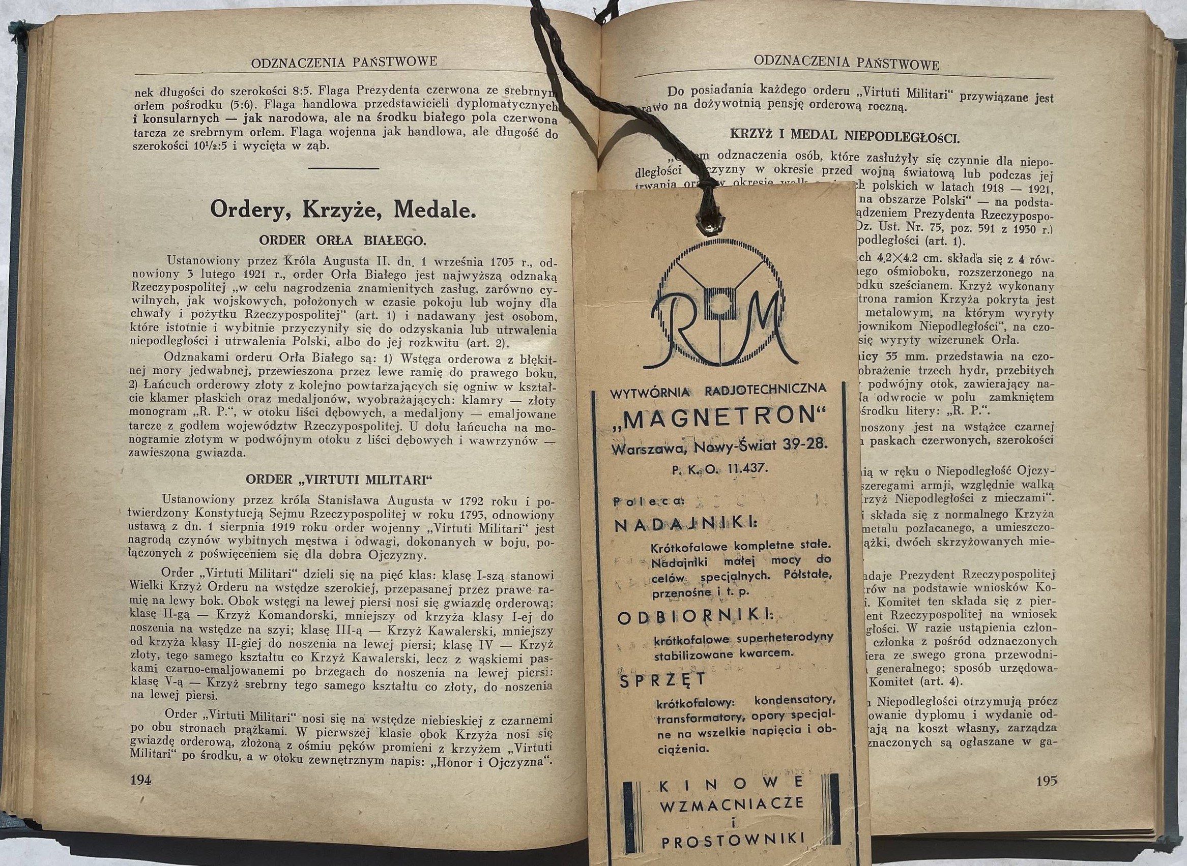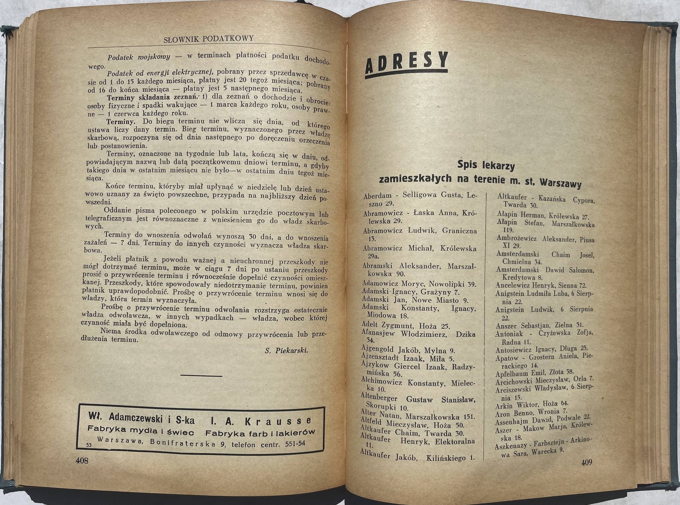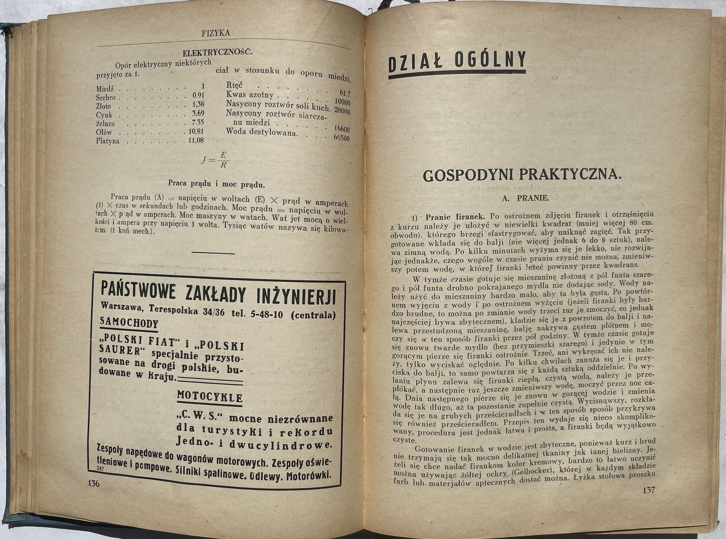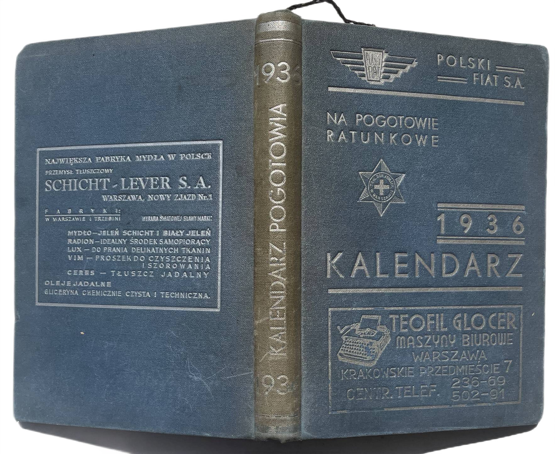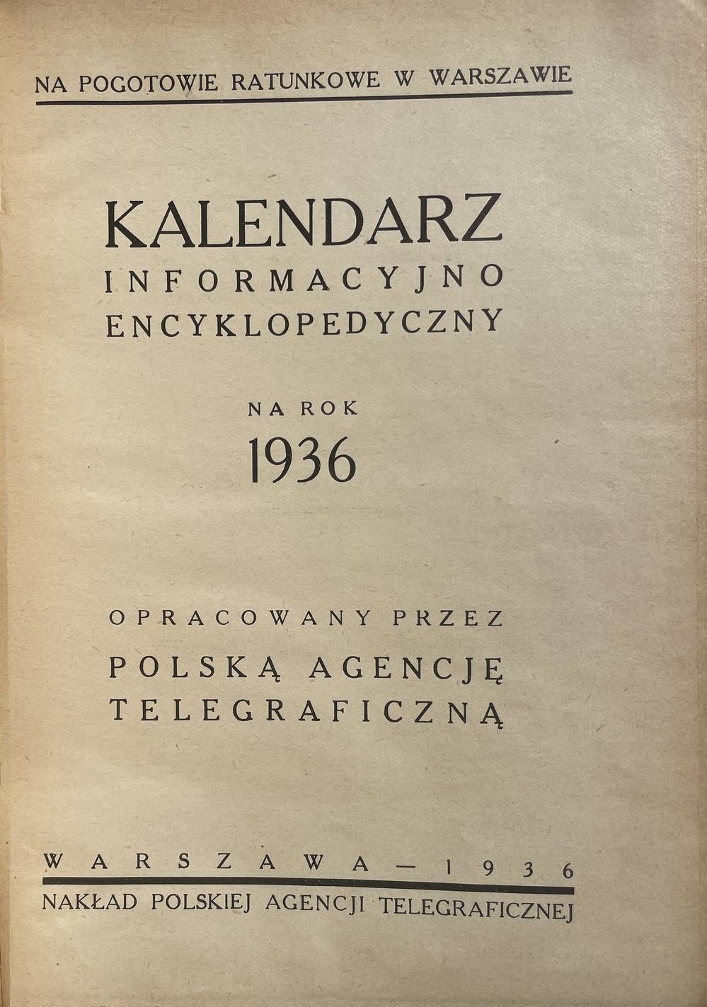 Na Pogotowie Ratunkowe. Kalendarz informacyjno encyklopedyczny na rok 1936. Warszawa 1936, PAT. 22 cm, str. 512. Okł. wyd. wytł. srebrem, zawilgocenia dolnych marginesów, poza tym stan dobry.