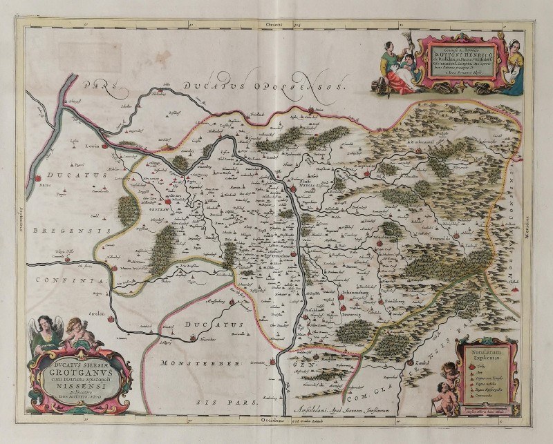 W lewym dolnym narożu napis w kartuszu: „DUCATUS SILESIAE / GROTGANUS / cum Districtu Episcopali / NISSENSI / Delineatore / IONA SCULTETO. Silesio”. Z prawej u dołu nad marginesem: „ Amstelodami. Apud Joannem Janssonium”.