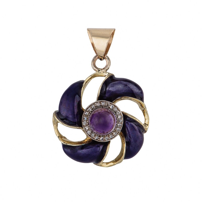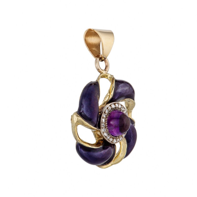 złoto pr. ~ 0,585, metal nieszlachetny, 1 szt. ametyst w szlifie kaboszon, rozety diamentowe, emalia fioletowa, masa: 9,56 g; wym.: 3,5 x 2,7 cm;