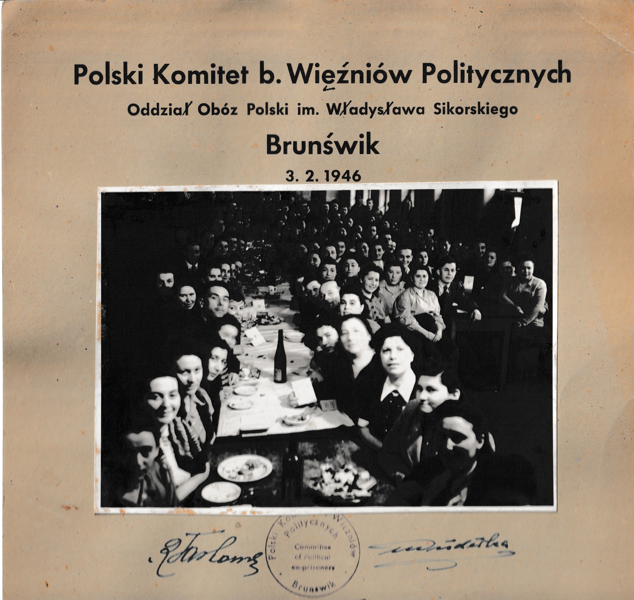 BRUNSZWIK. Byli robotnicy przymusowi, więźniowie obozu koncentracyjnego i oficerowie Oflagu 79 przy stole; fot. niesygnowana, 1946; Polski Komitet b. Więźniów Politycznych, Oddział Obóz Polski im Władysława Sikorskiego, Brunświk 3. 2. 1946; w dole okrągły stempel: Polski Komitet b. Więźniów Politycznych / Committee of Political ex-prisoners / Brunswik; obok pieczęci odręczne podpisy członków komitetu; fot. cz.-b., naklejona na karton, st. bdb., lekkie zabrudzenia; wym. fot.: 167x120 mm, wym. kartonu: 230x240 mm;