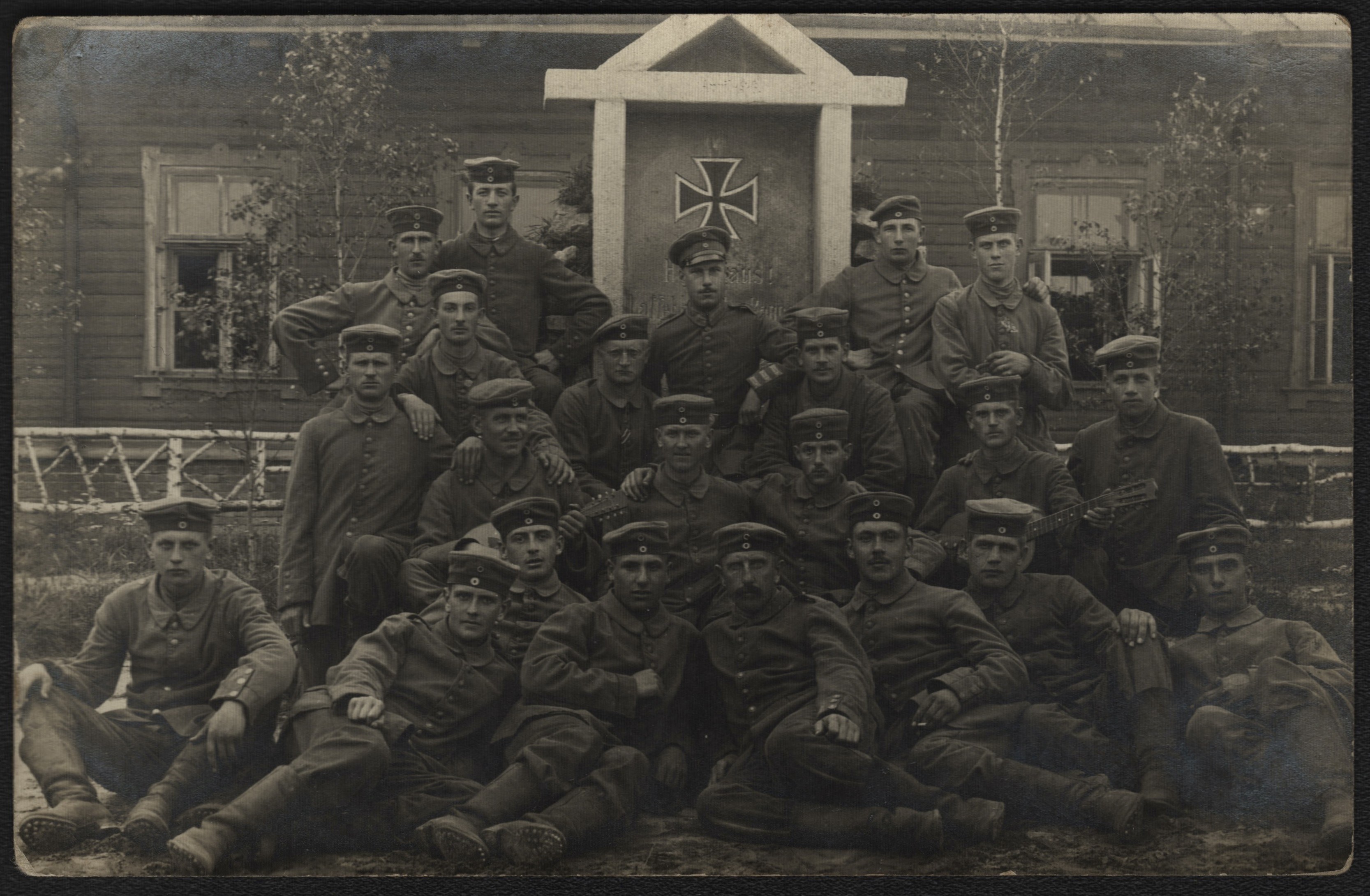 Jabłonna pod Warszawą, 1916 rok] Fotografia grupy żołnierzy pruskich przed budynkiem. Dat. October, 1916. Jabłonna.