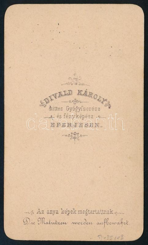 1868 Myskovszky Viktor (1838-1909) építész, művészettörténész, keményhátú fotó Divald Károly eperjesi műterméből, 10,5×6,5 cm