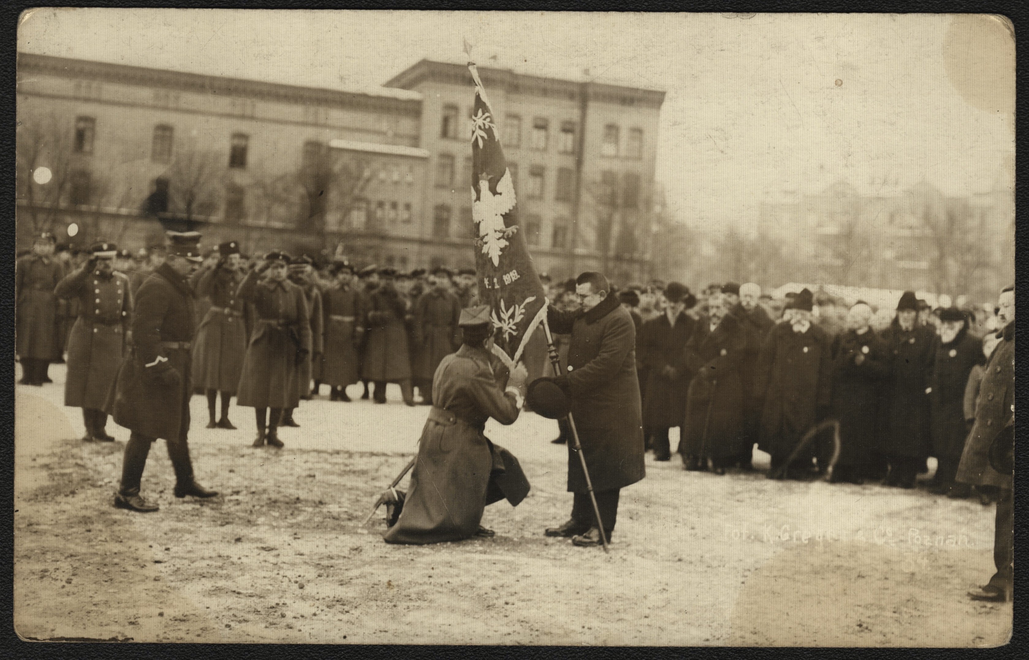 Armia Wielkopolska, Wojsko Wielkopolskie] Fotografia z przysięgi Armii Wielkopolskiej, złożonej przez gen. Dowbor-Muśnickiego. 26 I 1919 .Fot. Greger i Ska. W Poznaniu.